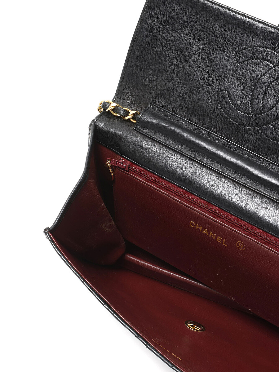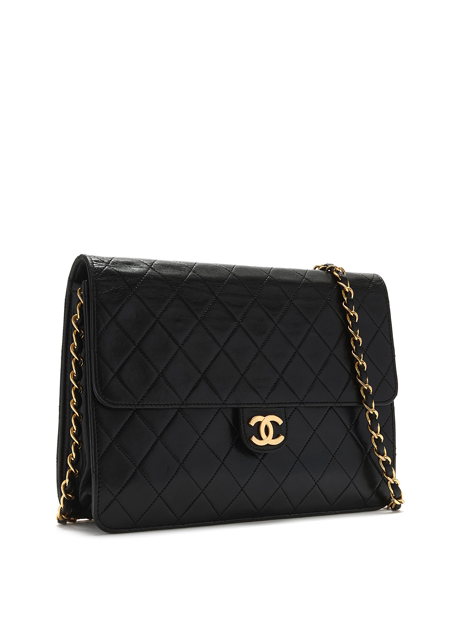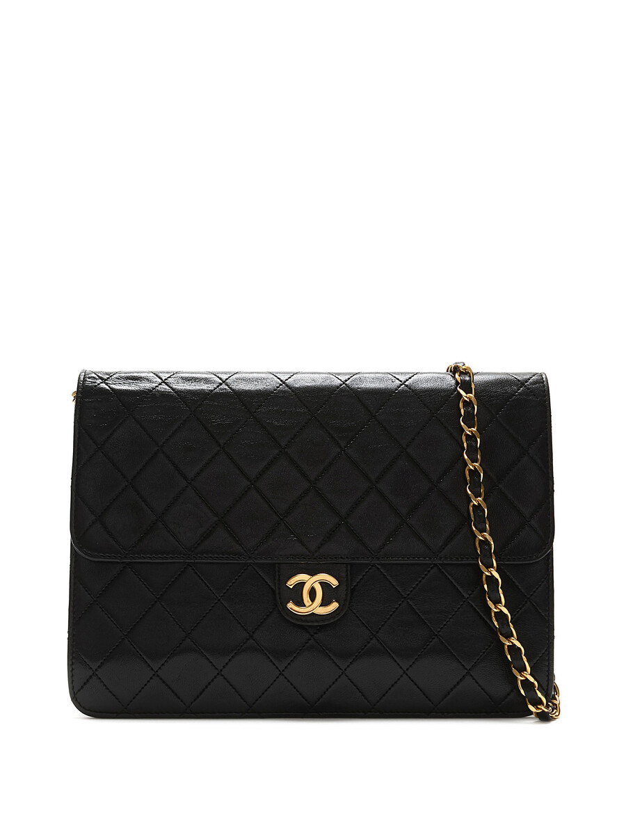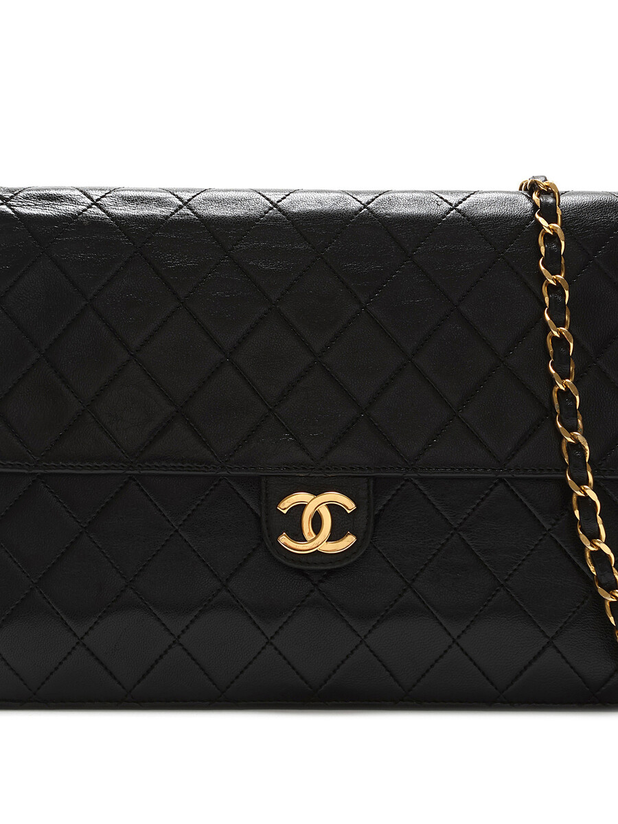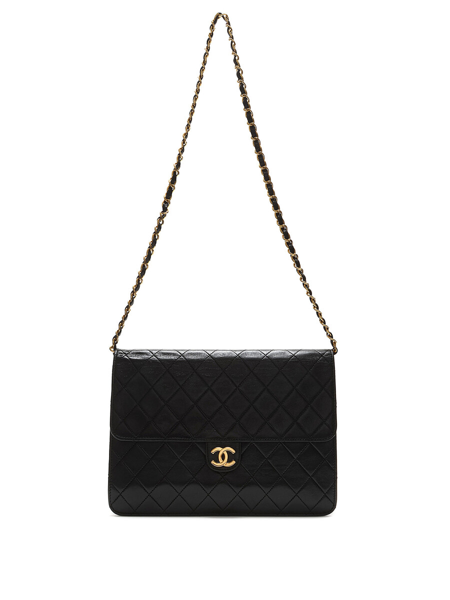 Sac à l’épaule en cuir d’agneau matelassé noir. Bandoulière en cuir et chaîne entrelacés. Plaque logo CC sur le rabat. Fermeture à loquet sous le rabat. Ferrures en métal doré.
