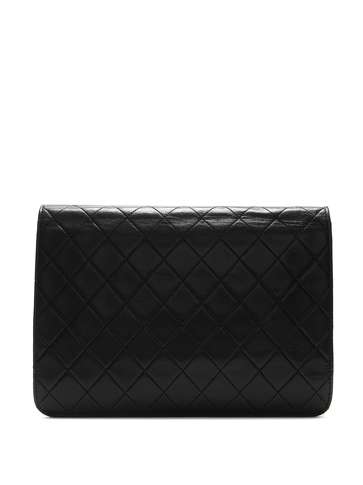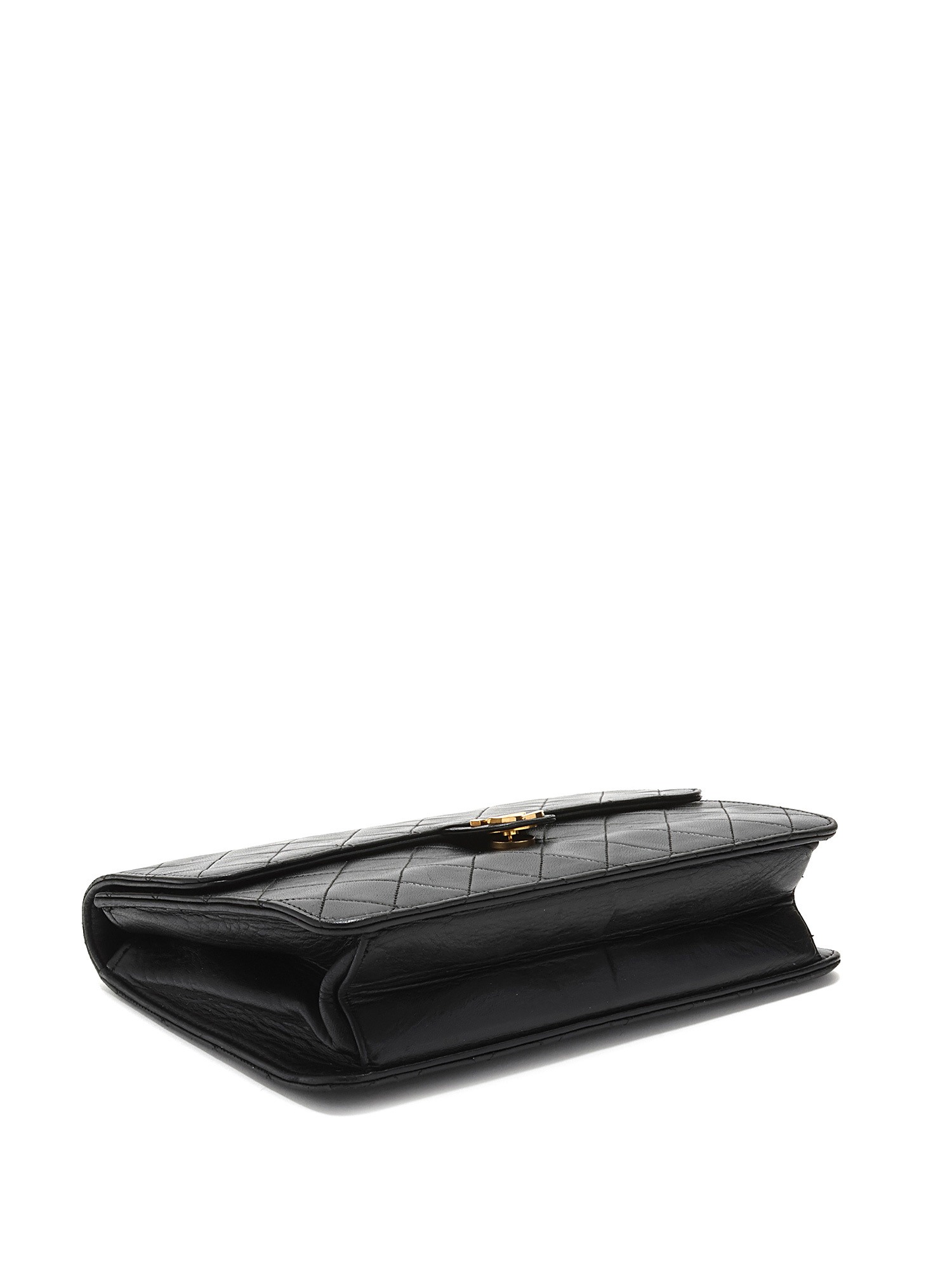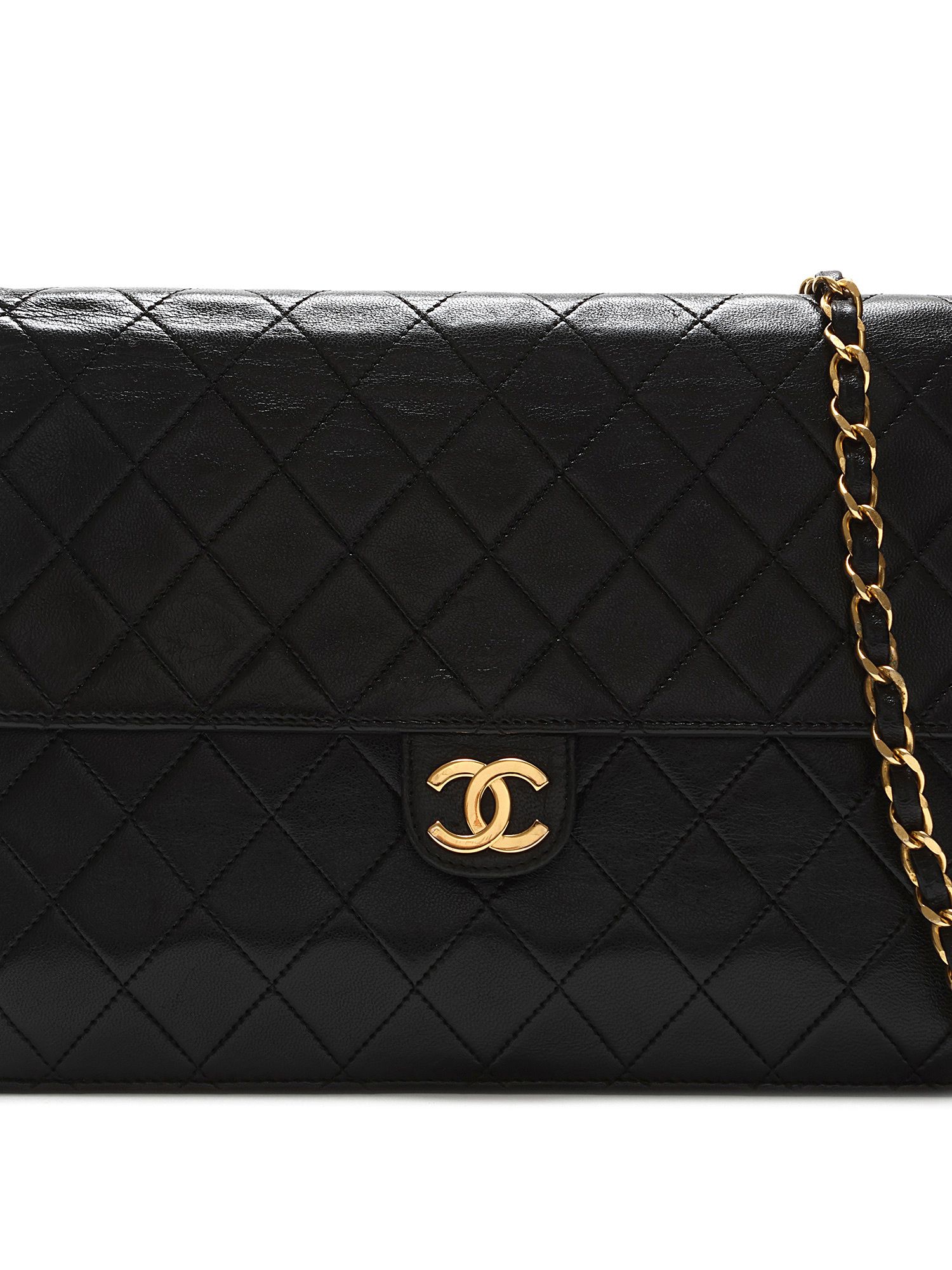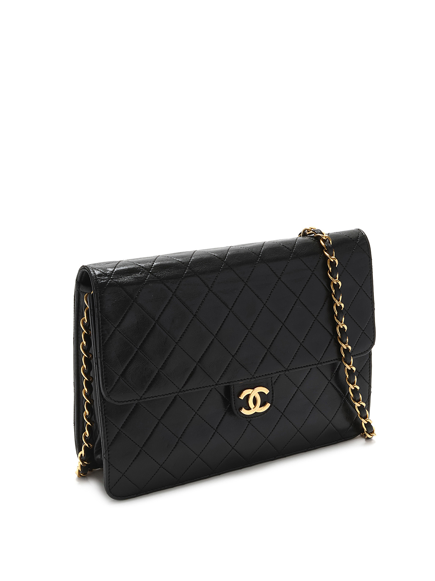 Sac à l’épaule en cuir d’agneau matelassé noir. Bandoulière en cuir et chaîne entrelacés. Plaque logo CC sur le rabat. Fermeture à loquet sous le rabat. Ferrures en métal doré.