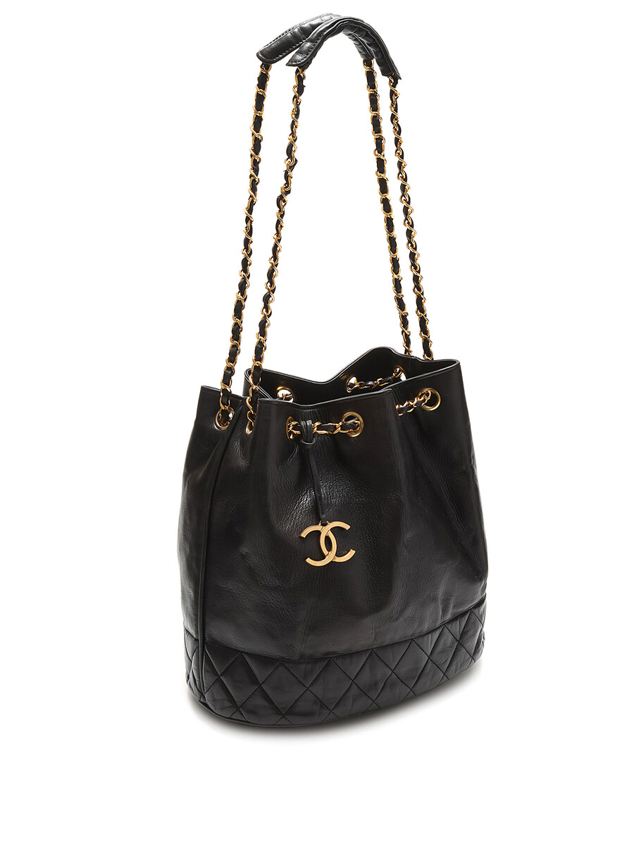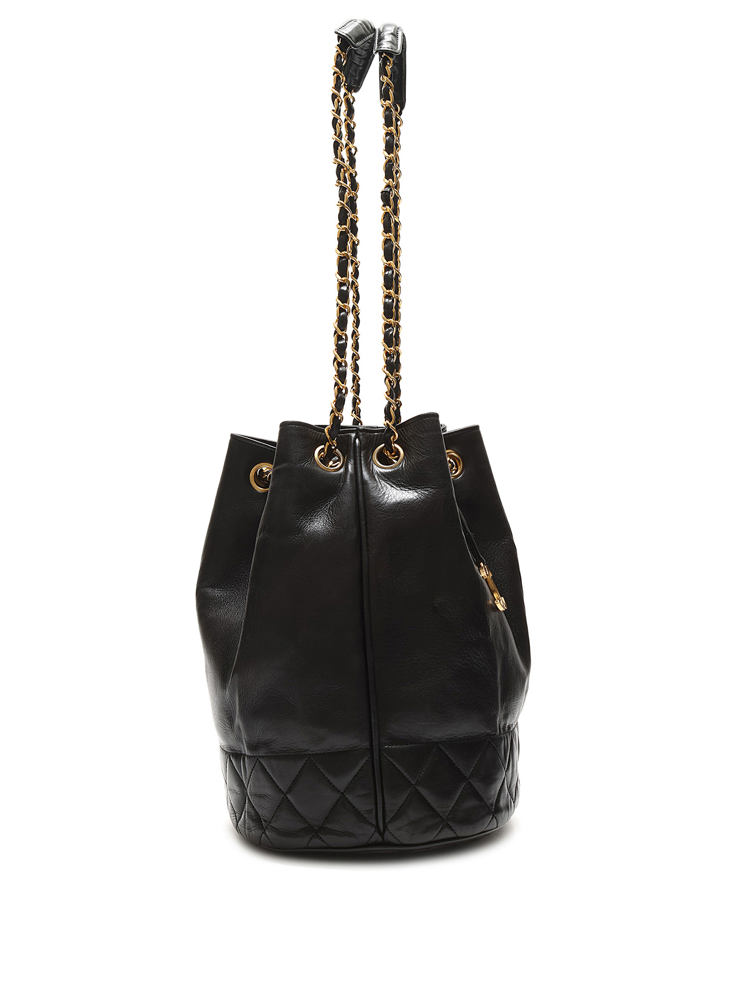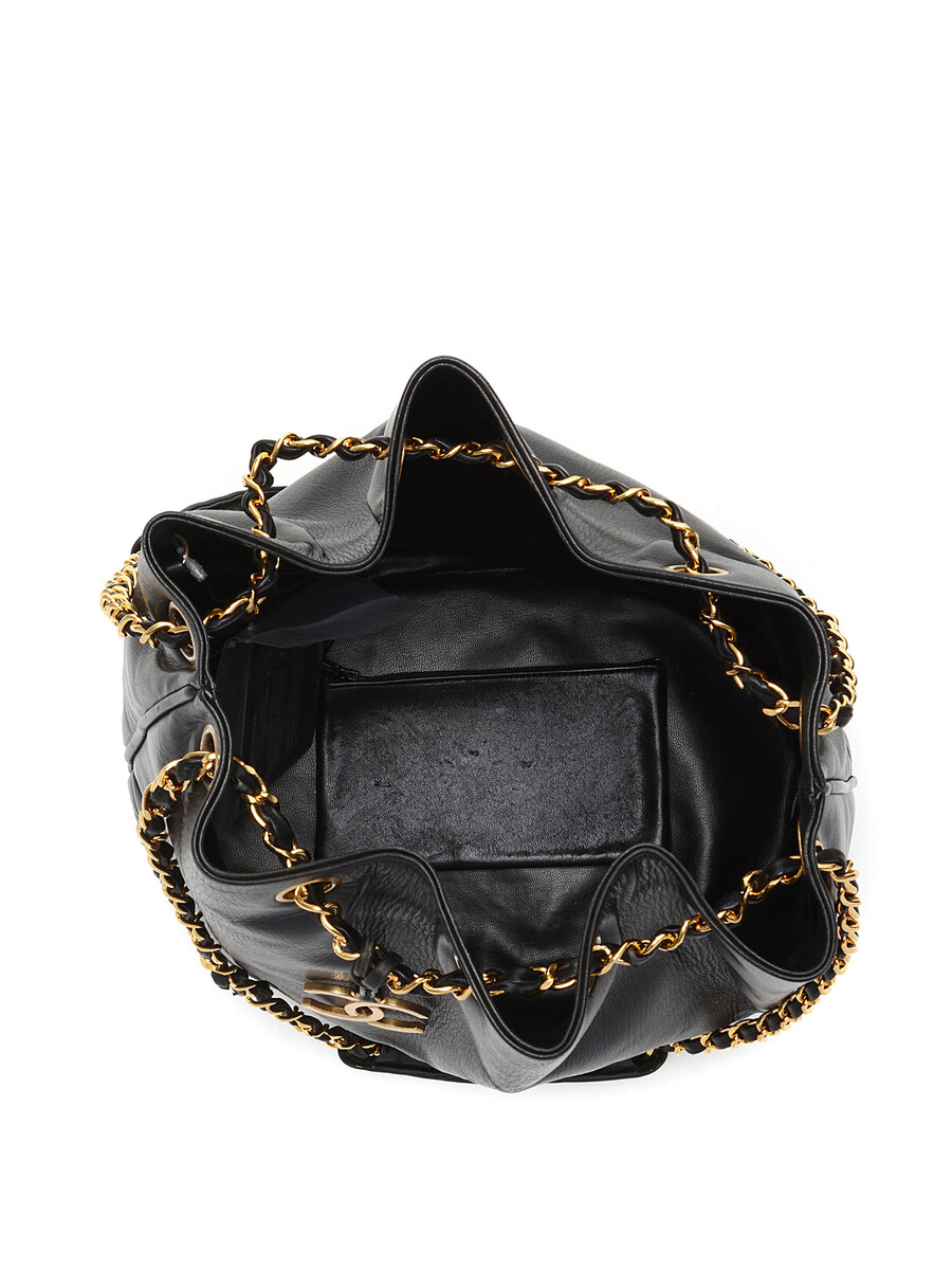 Sac seau en cuir d'agneau avec base matelassée, noir. Fermeture à cordon avec chaîne. Anse en cuir entrelacé et chaîne. Finitions en métal doré avec pochette intérieure. Accompagné de la carte d'authenticité.