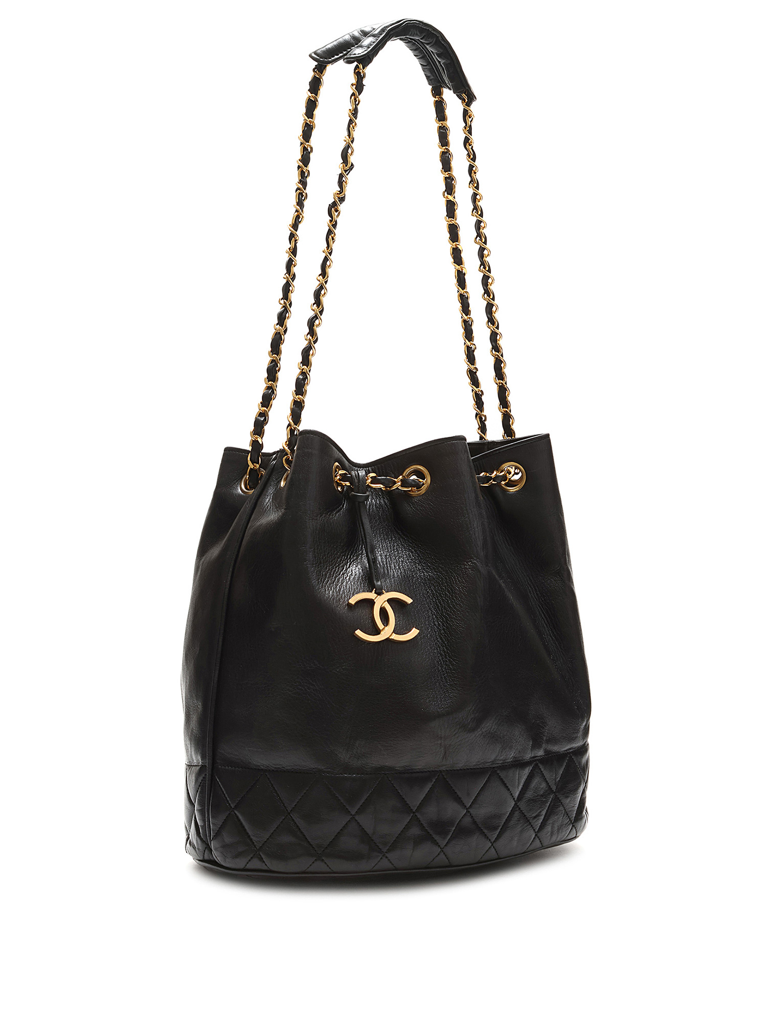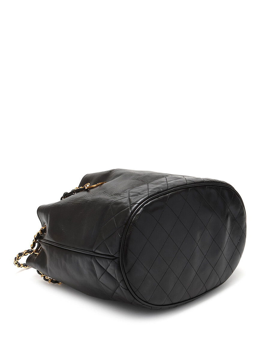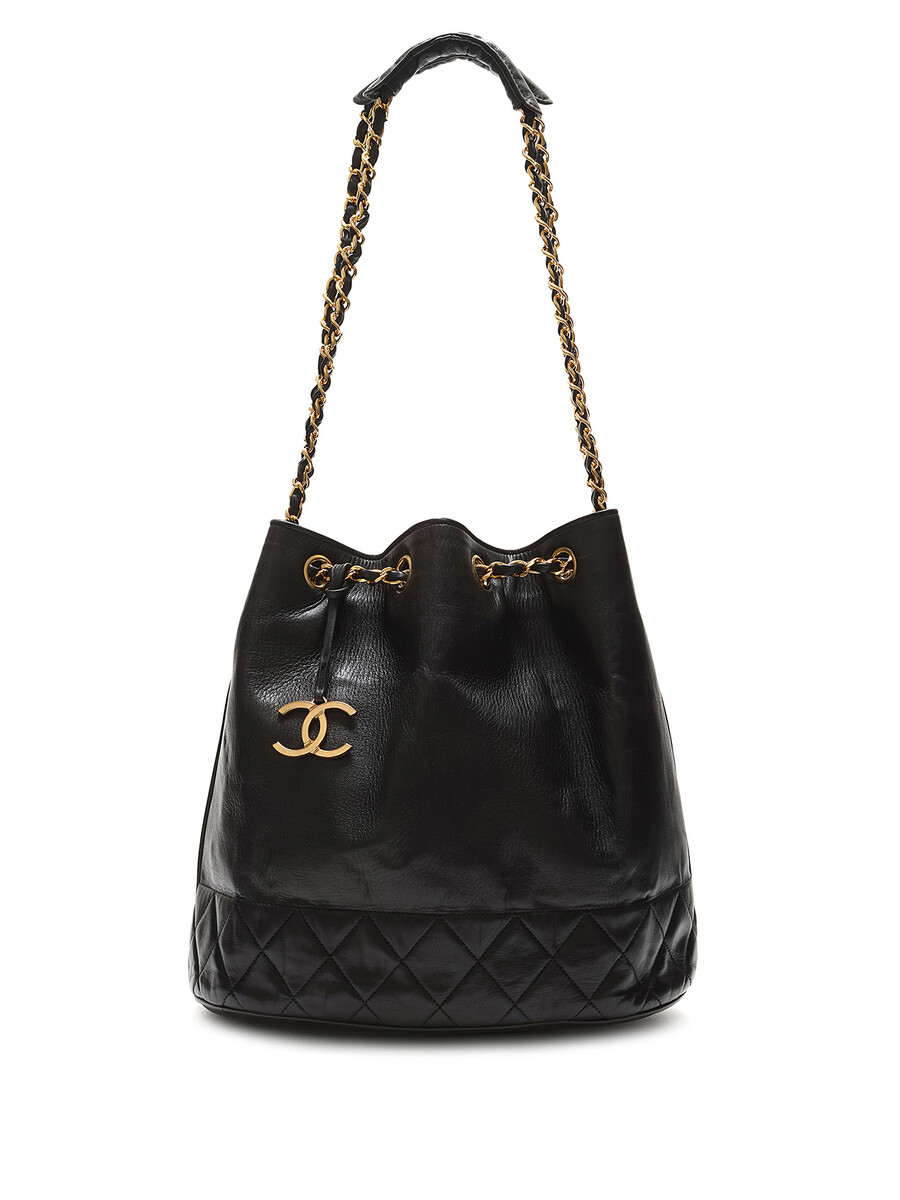 Sac seau en cuir d'agneau avec base matelassée, noir. Fermeture à cordon avec chaîne. Anse en cuir entrelacé et chaîne. Finitions en métal doré avec pochette intérieure. Accompagné de la carte d'authenticité.