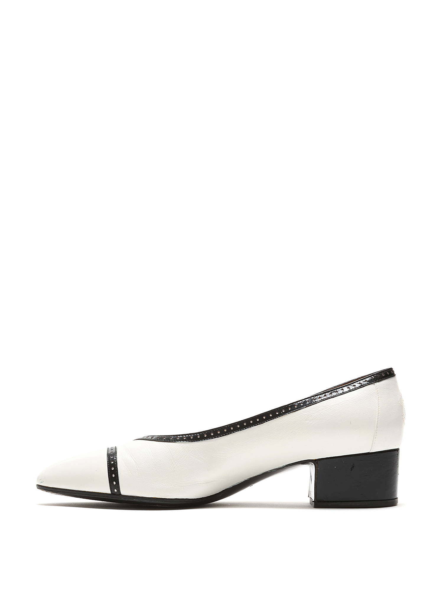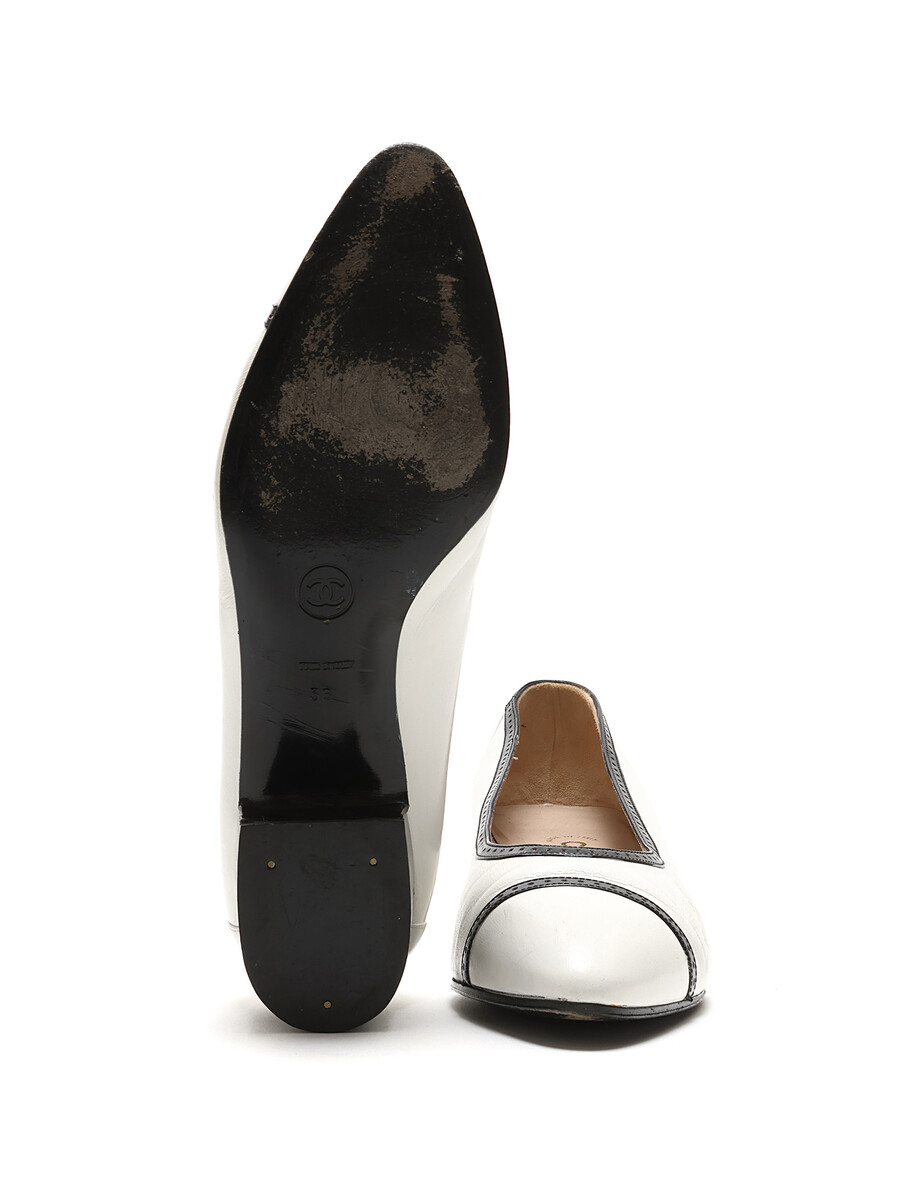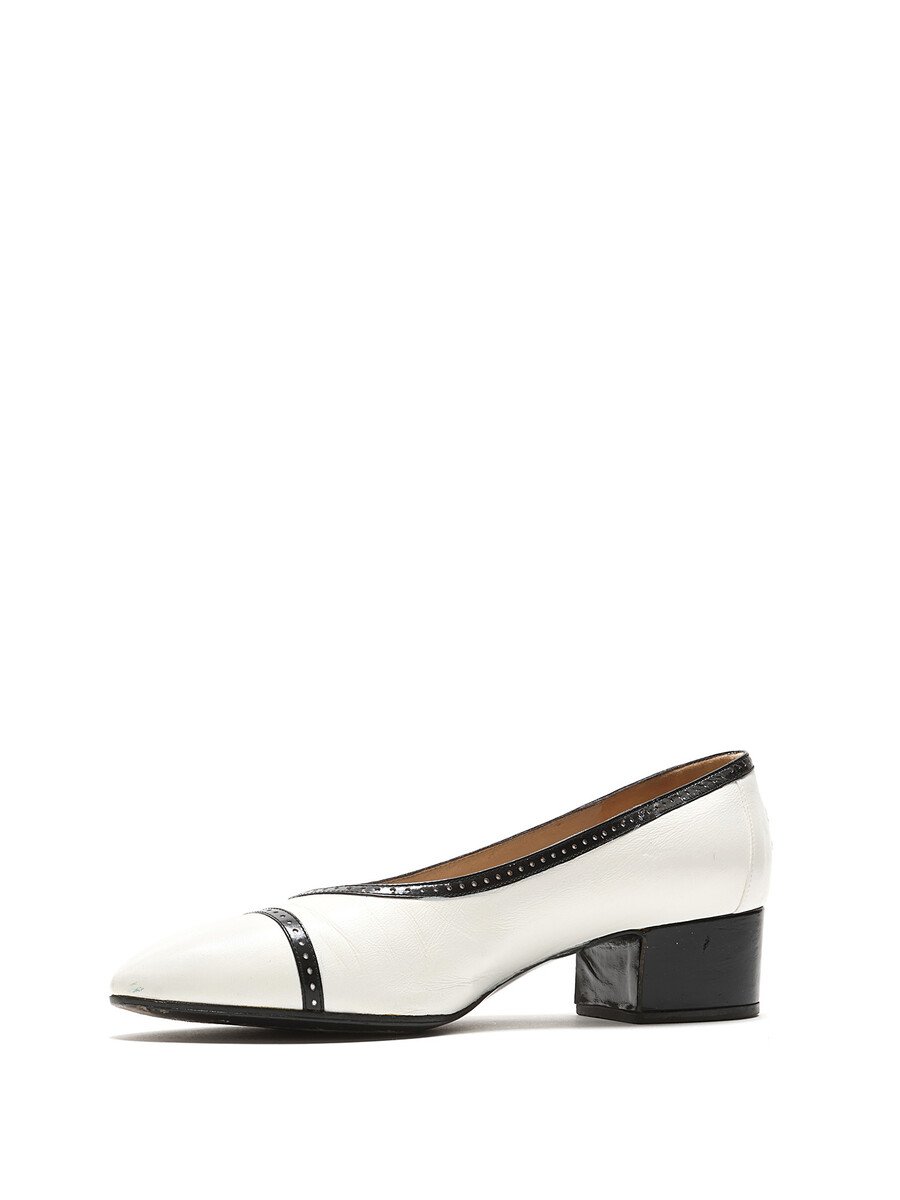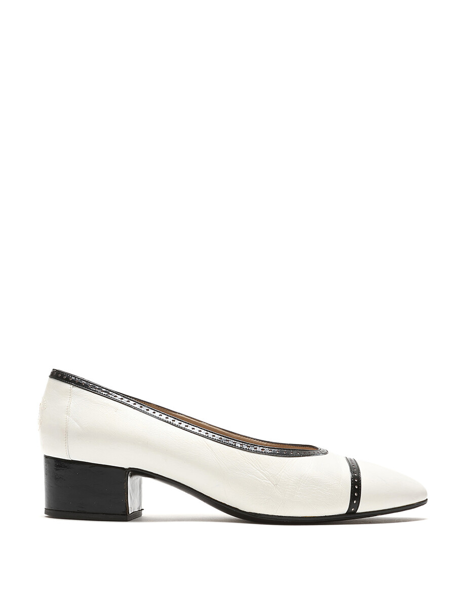 Mocassins en cuir blanc avec bordures noires. Style à enfiler avec bout pointu. Semelle en cuir.