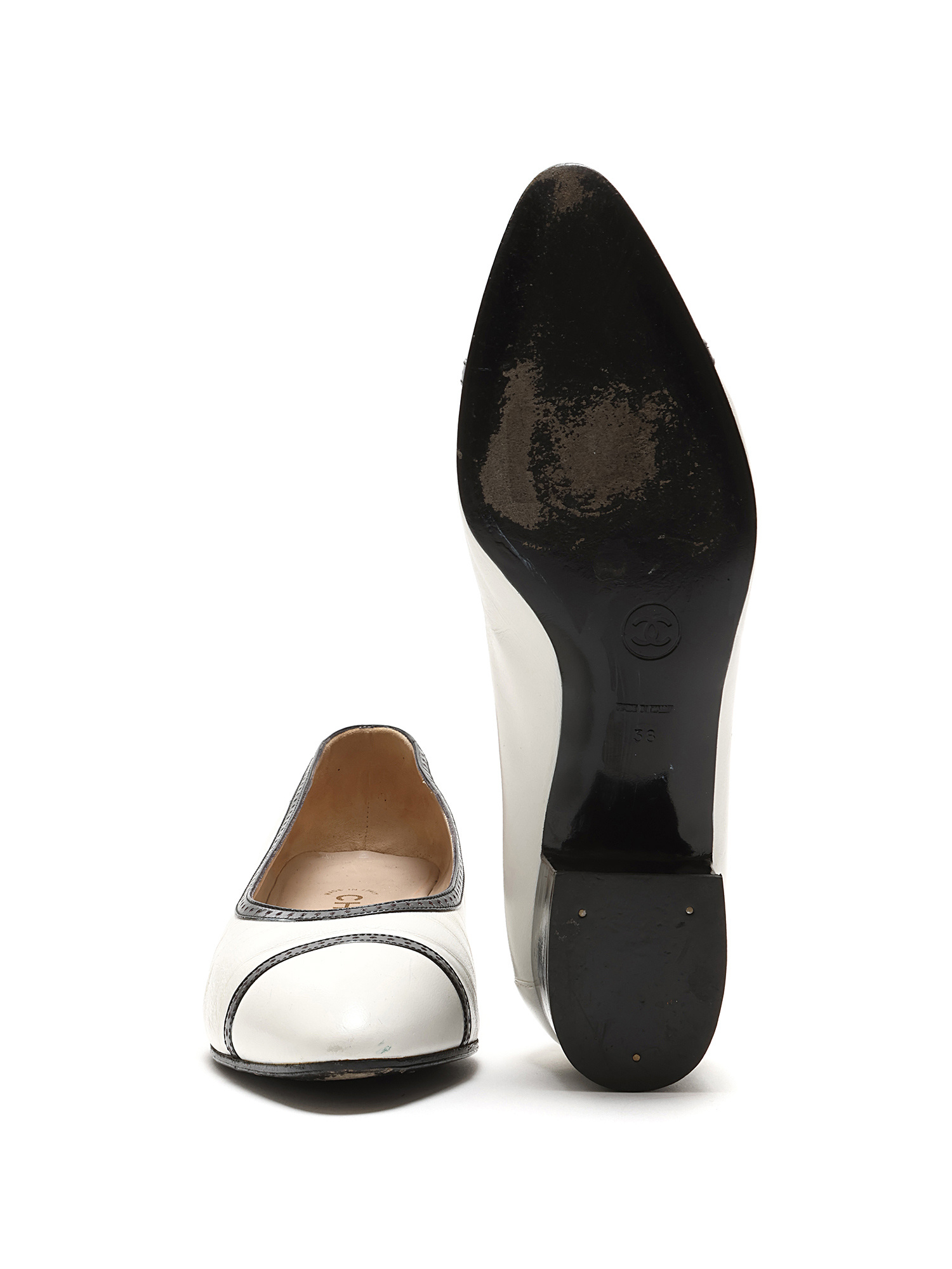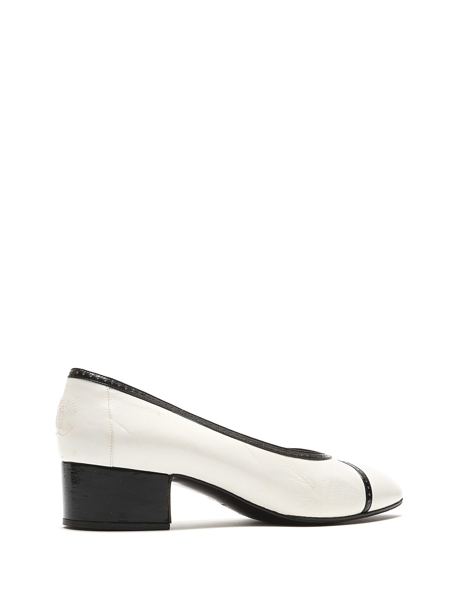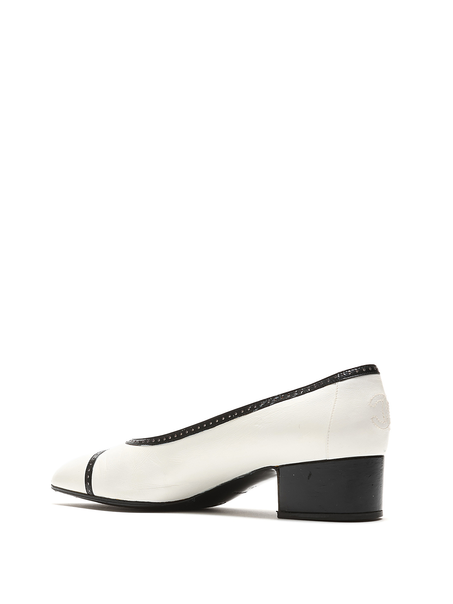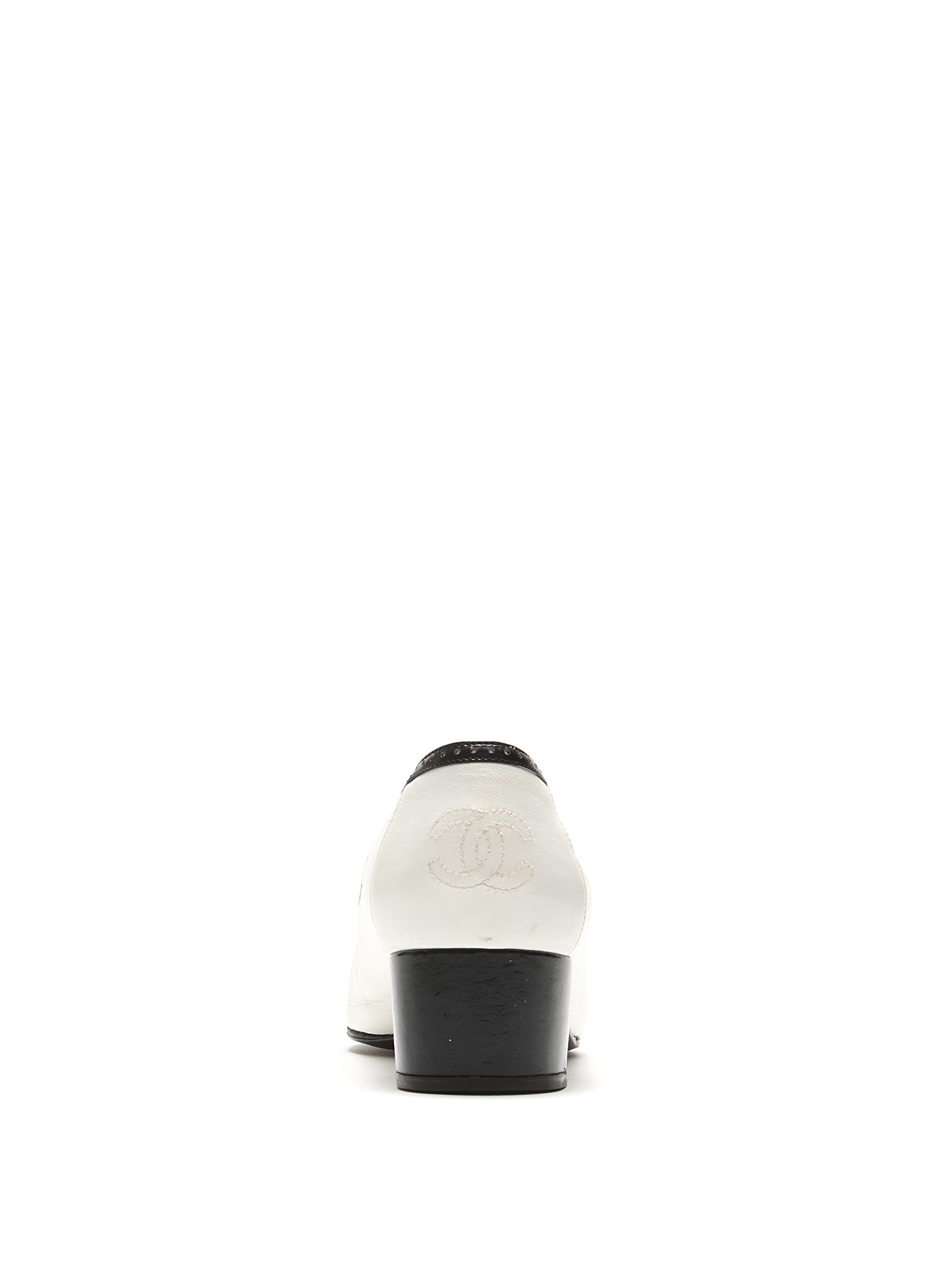 Mocassins en cuir blanc avec bordures noires. Style à enfiler avec bout pointu. Semelle en cuir.