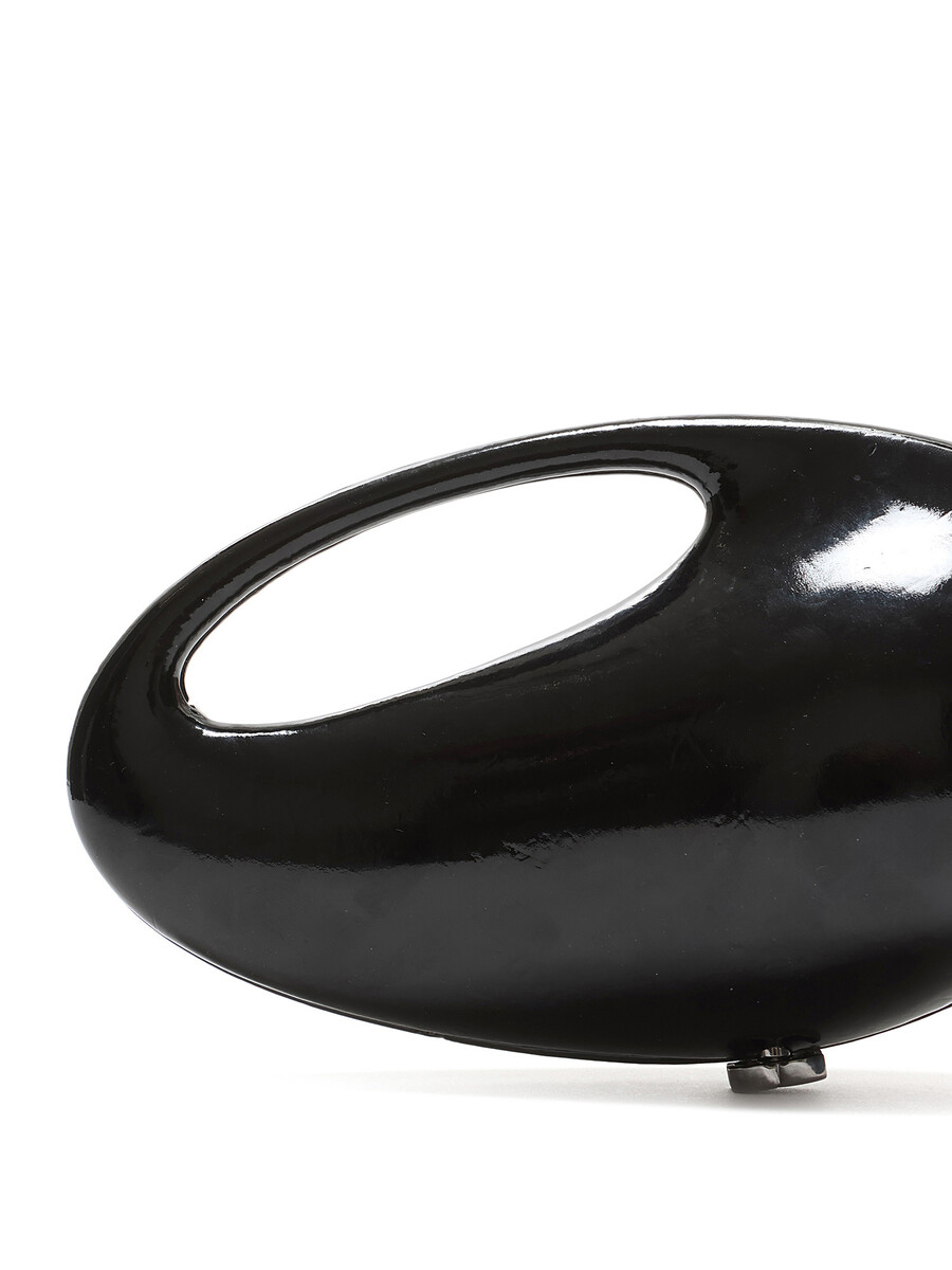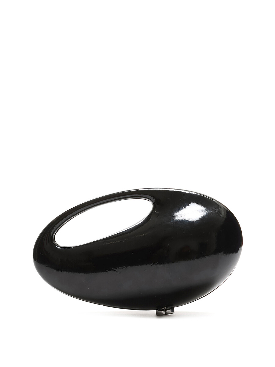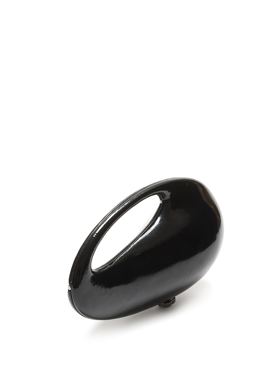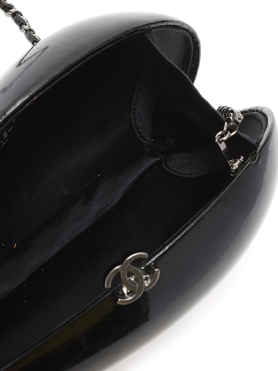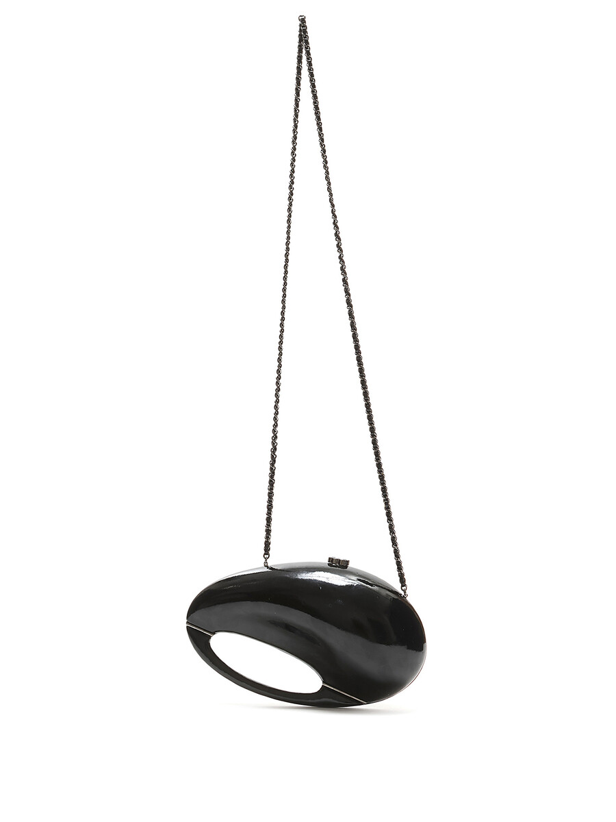 Minaudière sculpturale en cuir verni noir avec plaque à logo 'CC' au rabat. Sangle en chaîne et en cuir argentée.