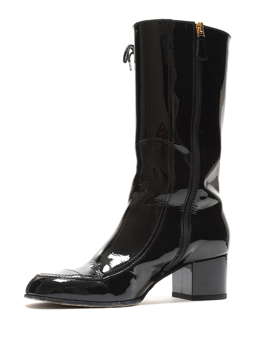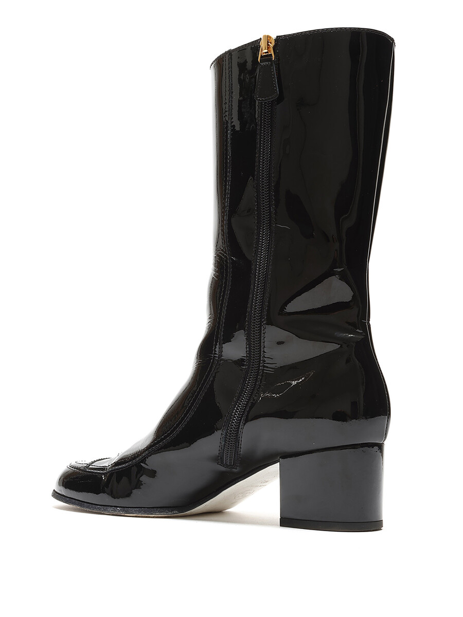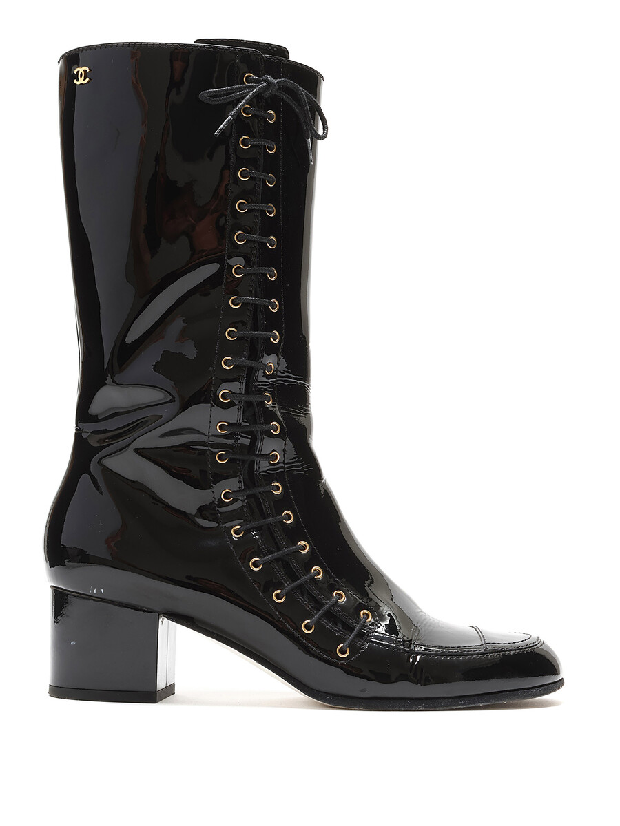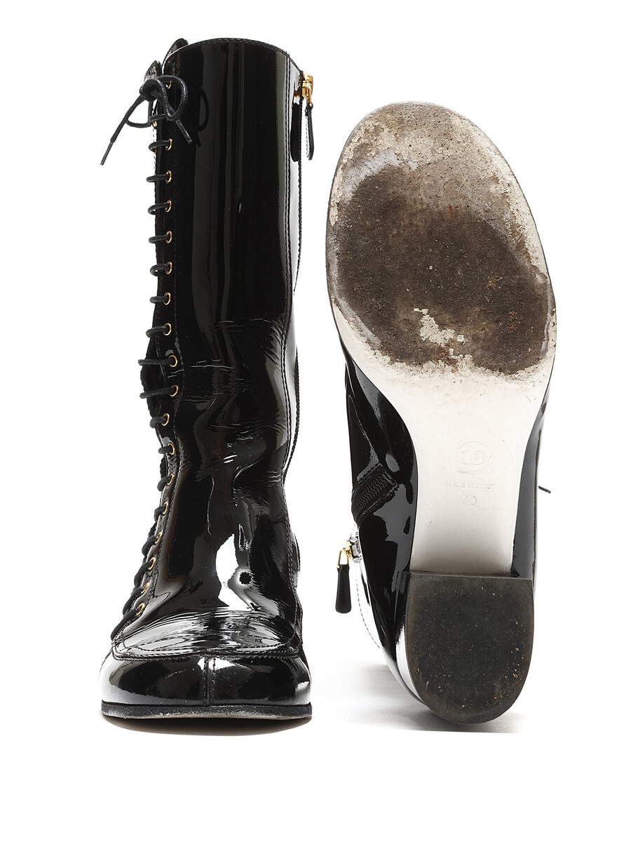 Bottes à lacets en cuir verni noir avec motif matelassé et logo doré. Bout rond. Semelle en cuir. Livrées avec un sac de protection.