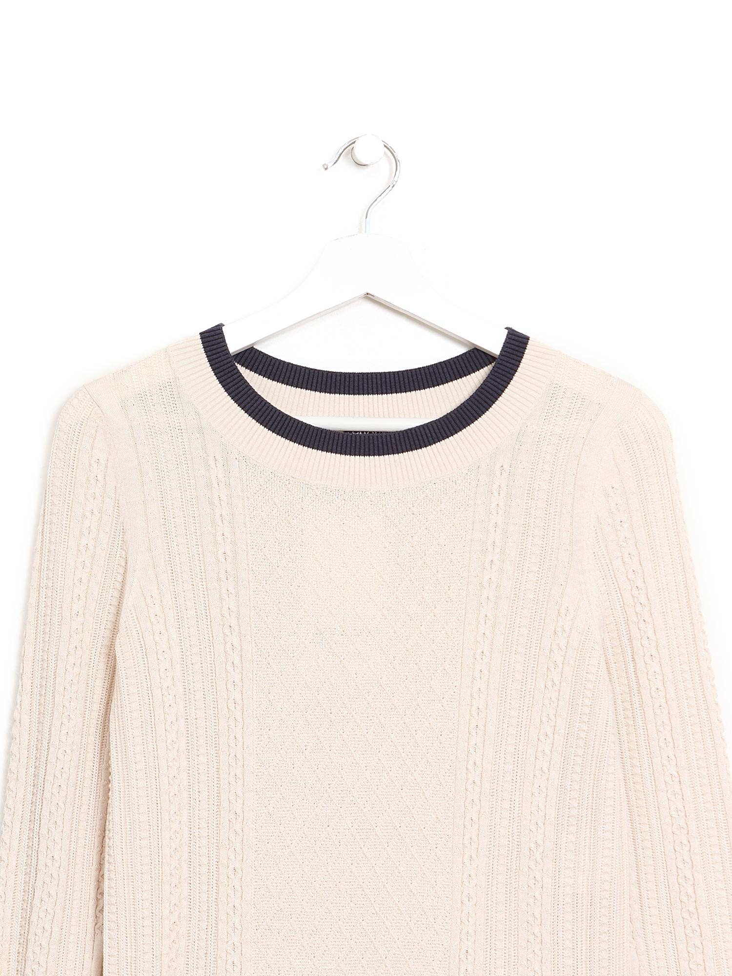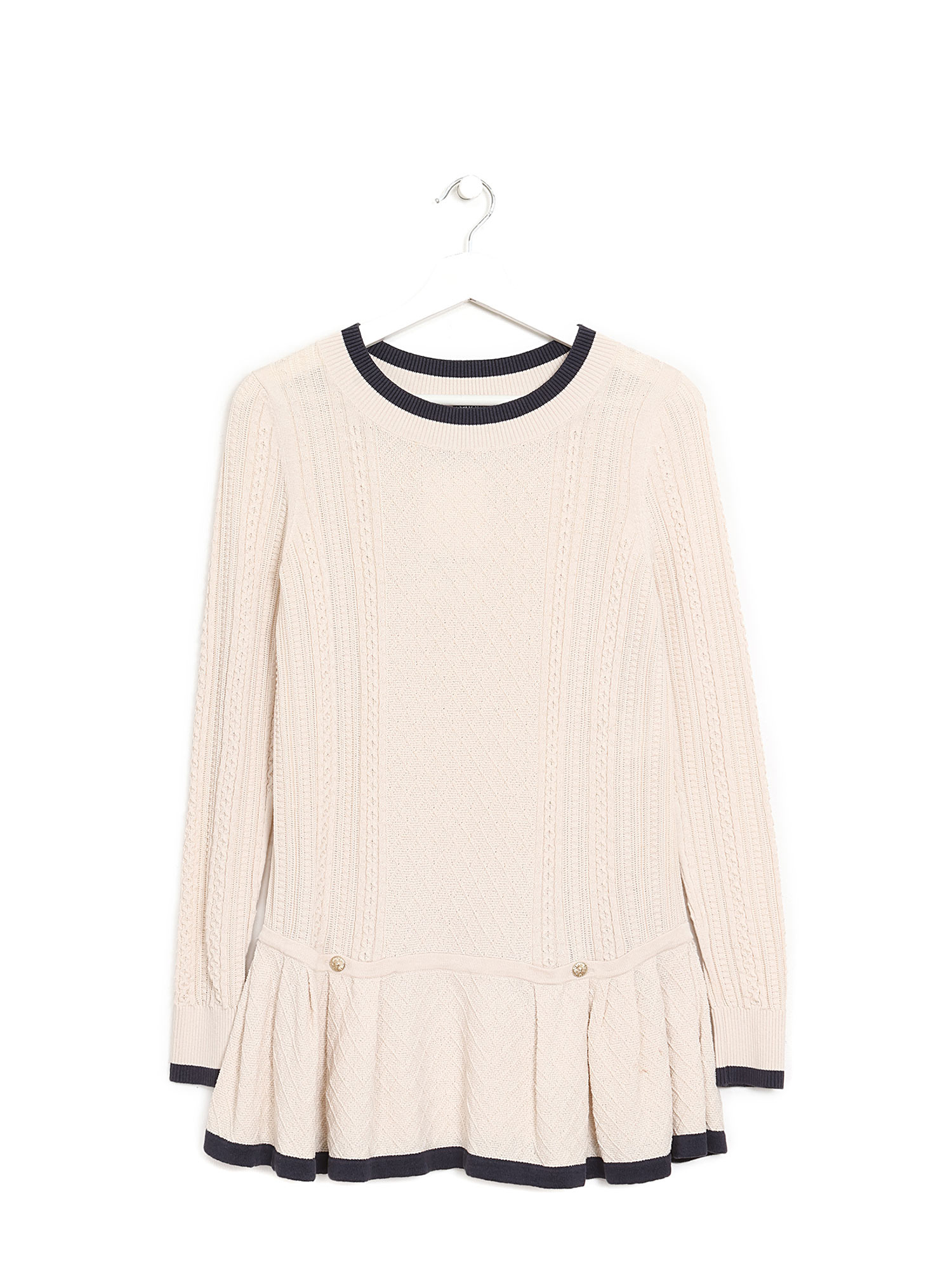 Robe en tricot à manches longues blanche avec des détails de garniture bleue. Boutons de marque sur la patte avant.