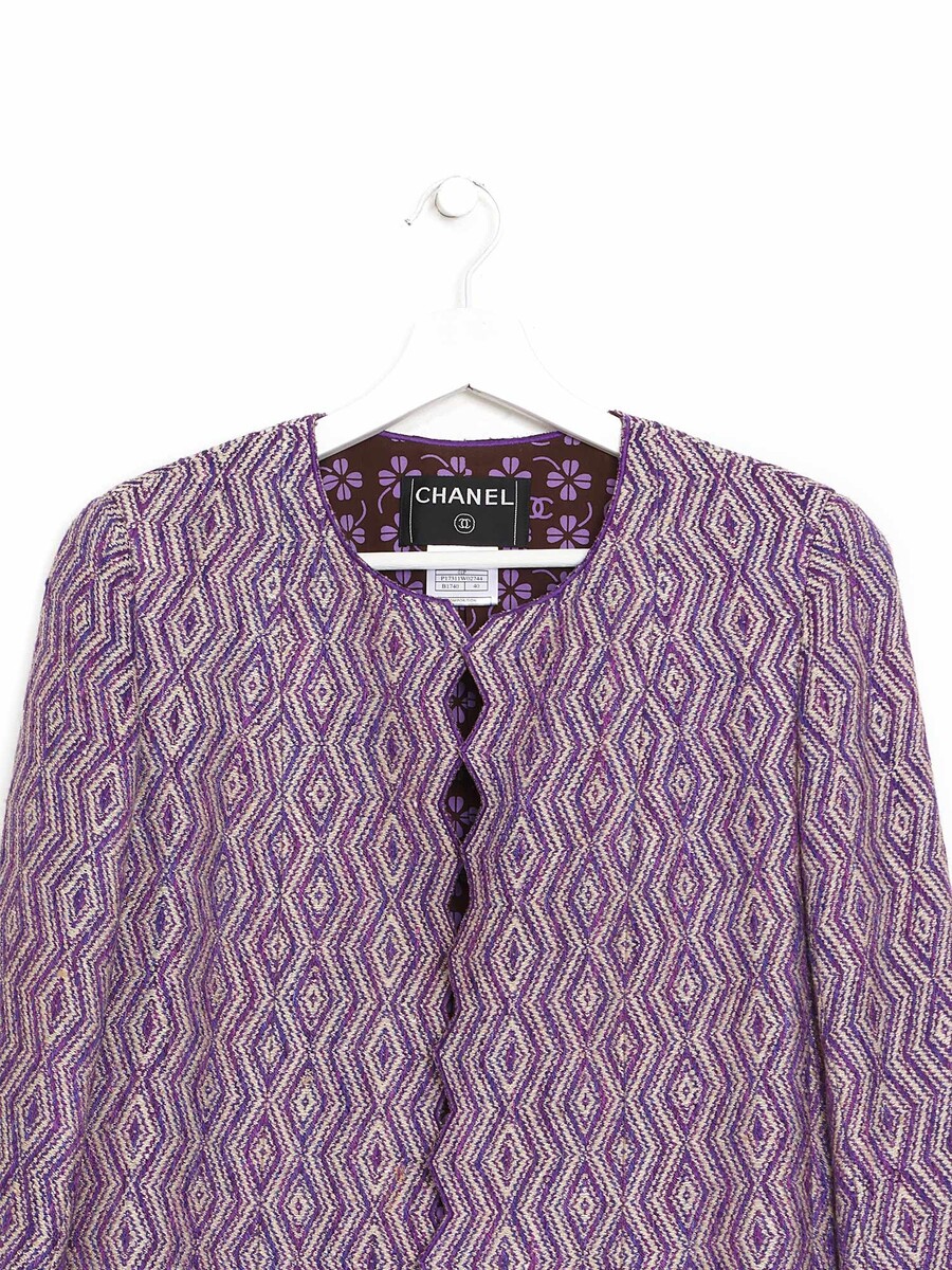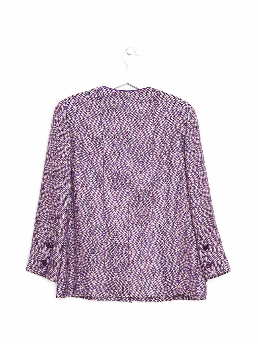 Veston à manches longues avec motif géométrique en violet. Fermeture boutonnée sur le devant et poignets à boutons.