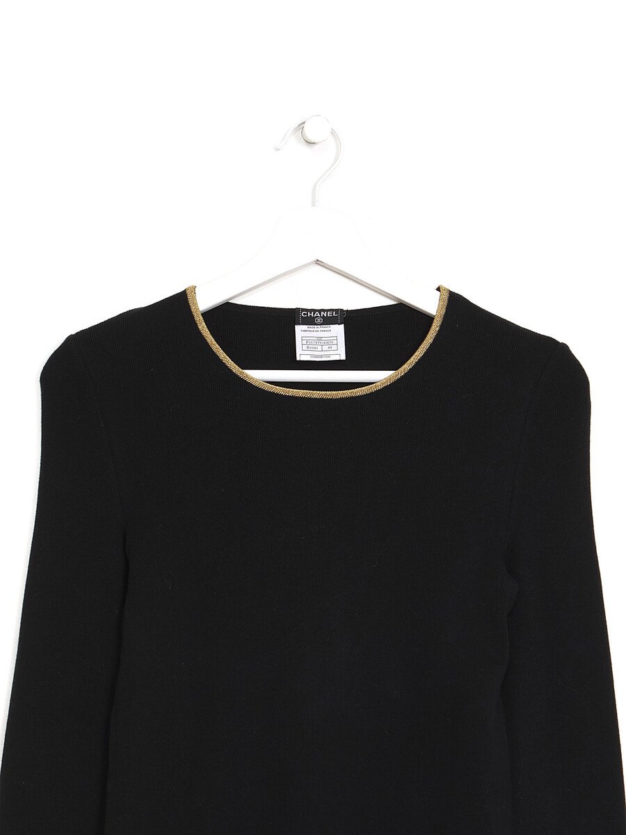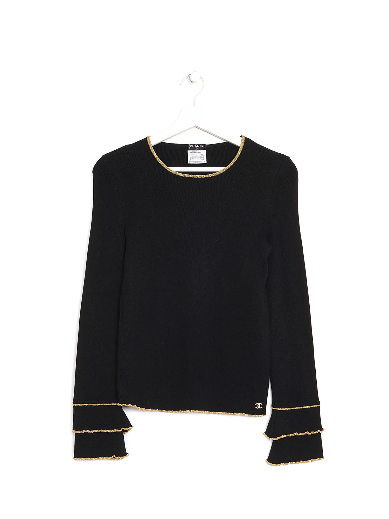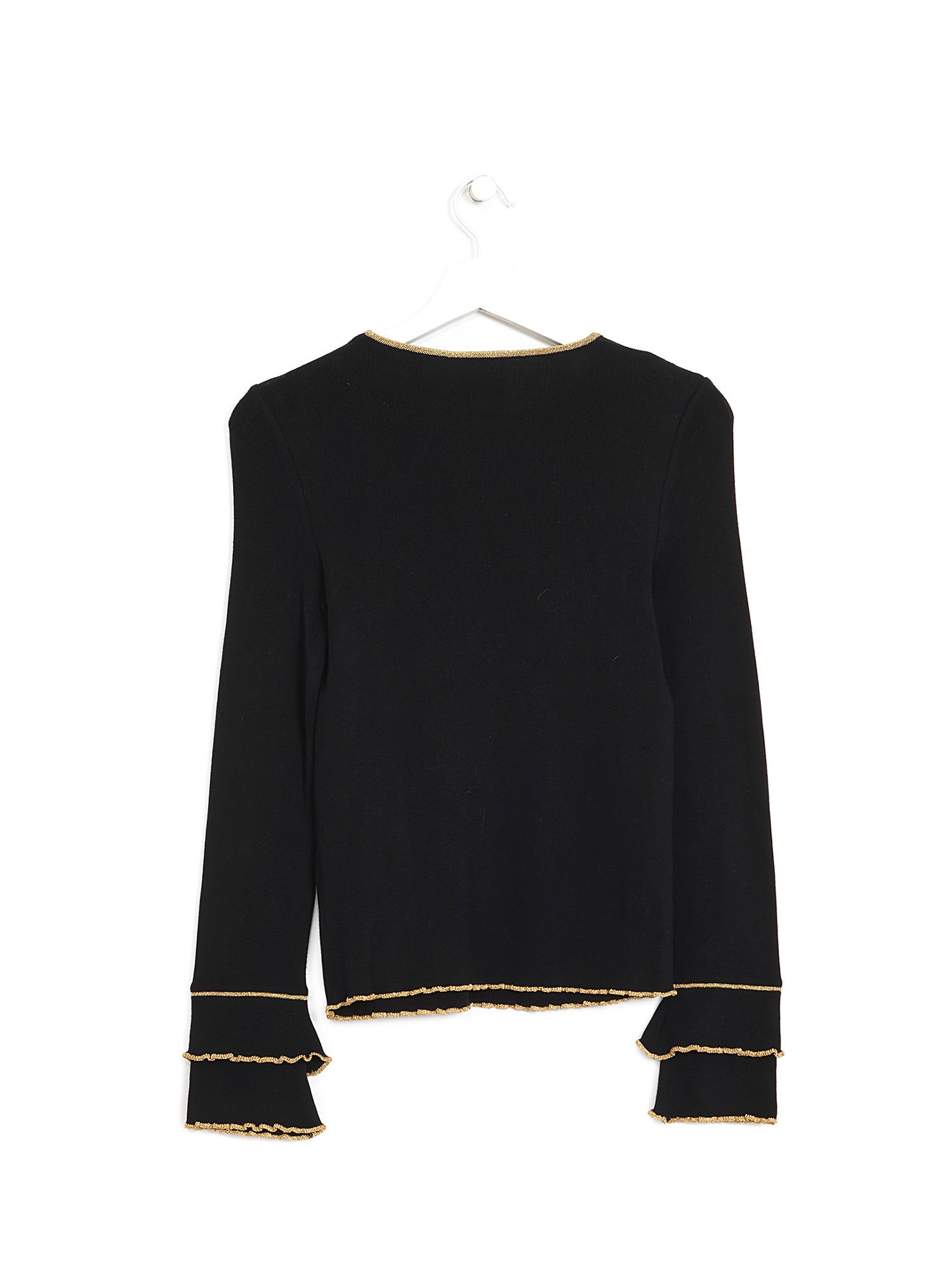 Pull noir à manches longues avec garniture dorée. Col rond. Silhouette légèrement ajustée avec poignets et ourlet côtelés.