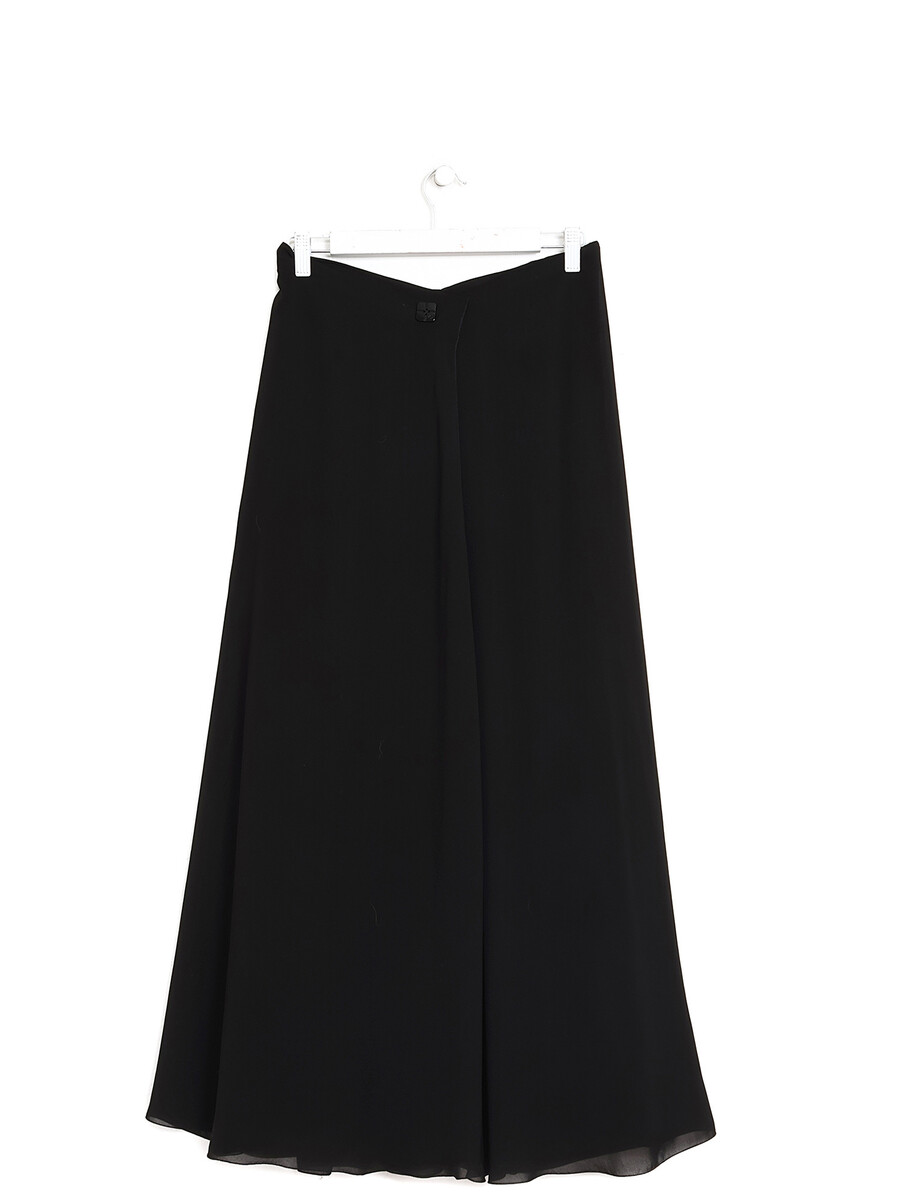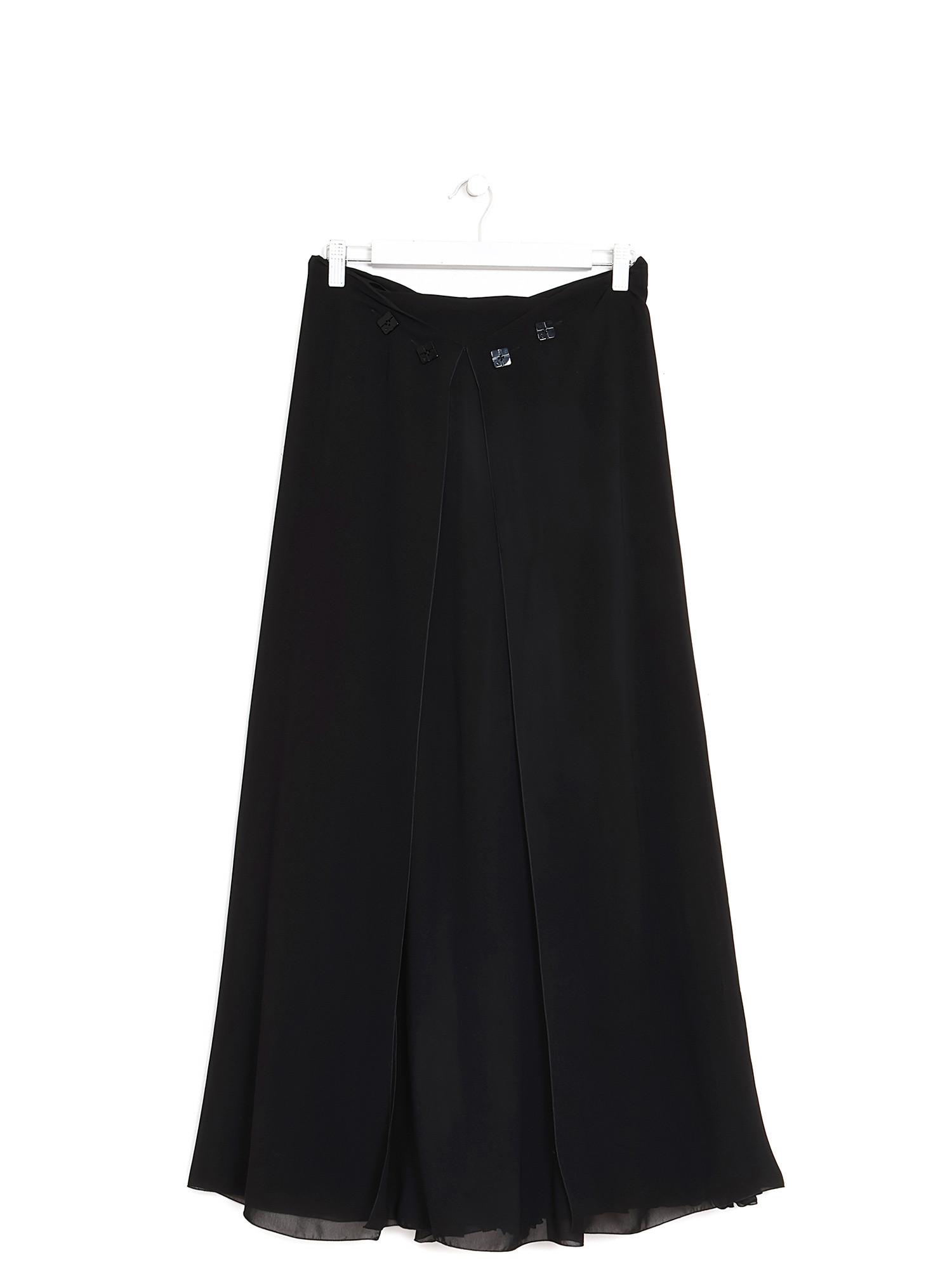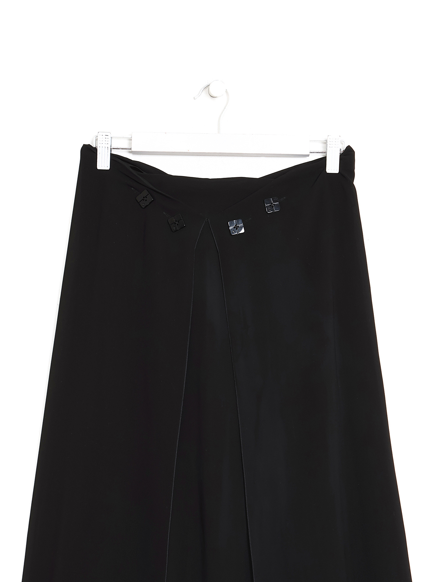 Jupe mi-longue asymétrique en noir avec un design plissé. Fermeture à boutons à l'avant. Accents métalliques subtils.