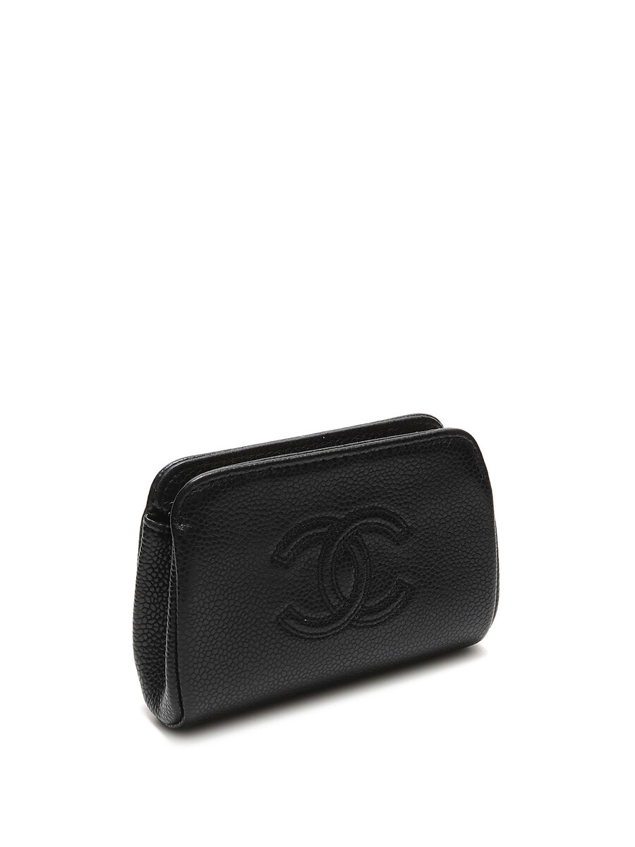 Porte-monnaie en cuir caviar noir par Chanel. Ferrures en métal doré. Fermeture à glissière. Avec boîte.