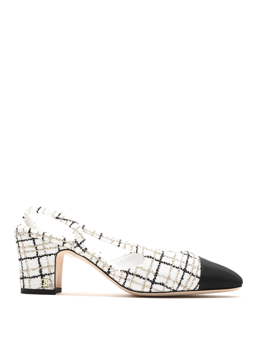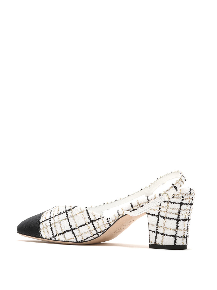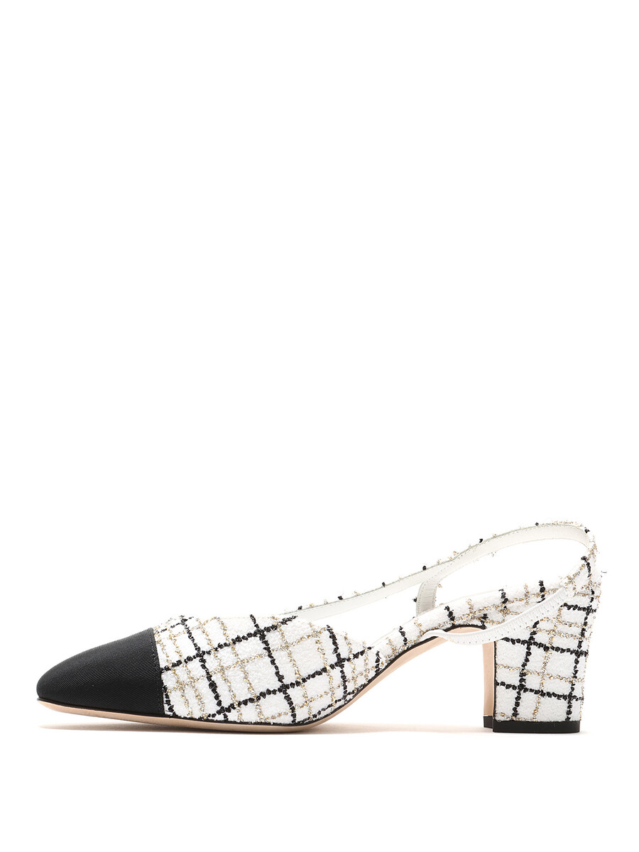 Escarpins slingback en tweed avec bout contrastant. Bride arrière élastique pour plus de confort. Semelle en cuir pour plus de durabilité.