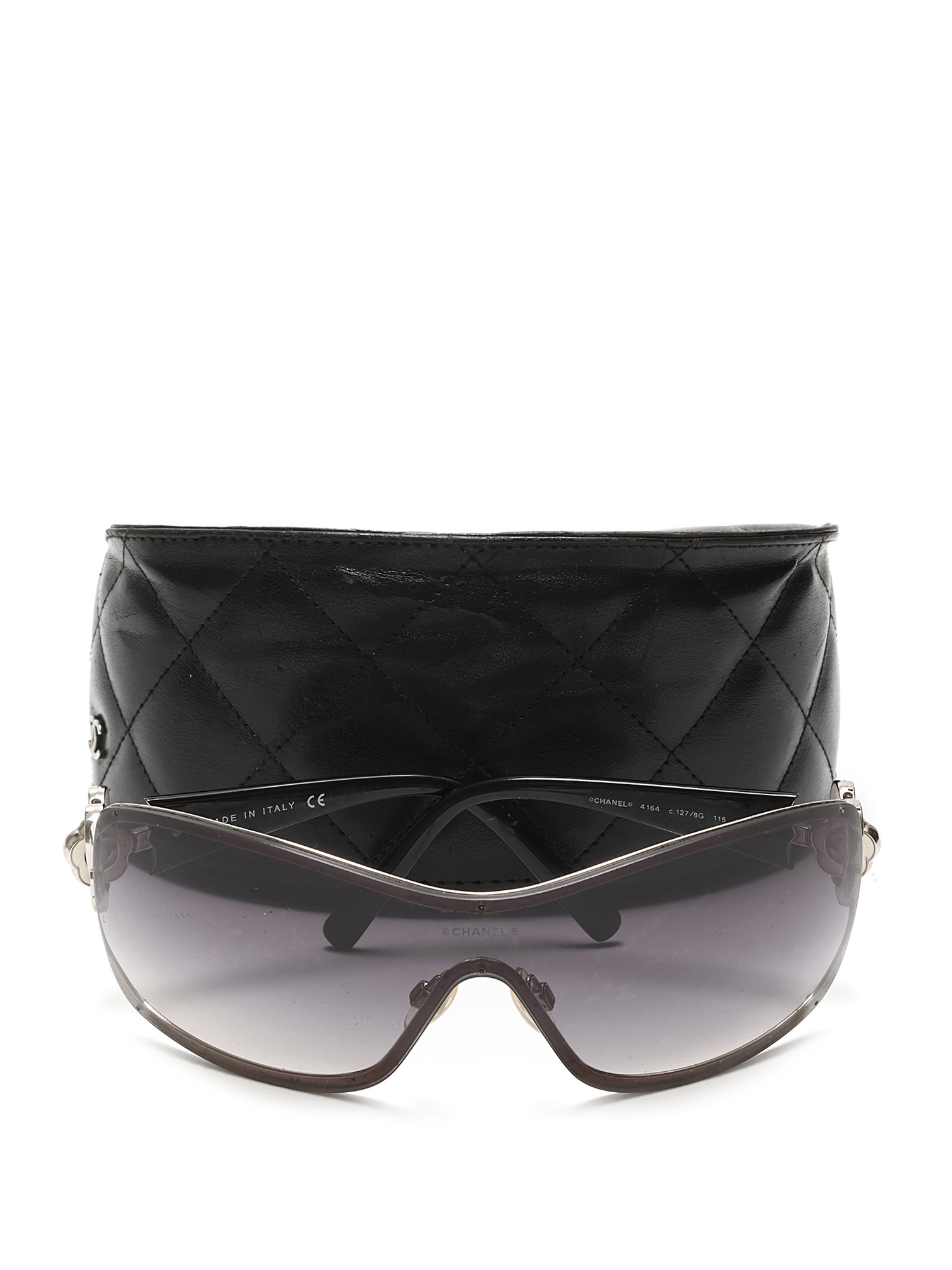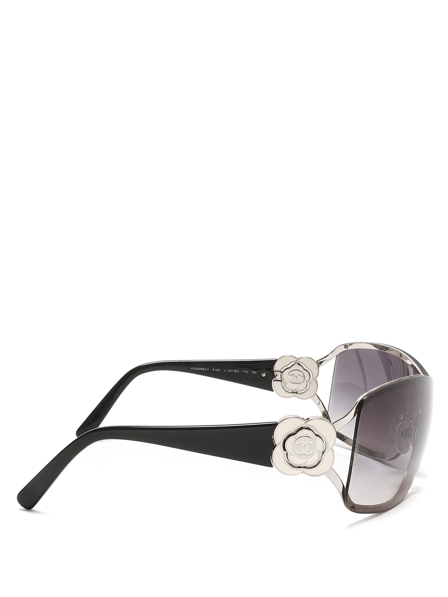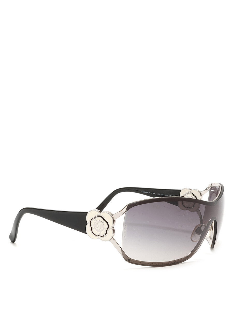 Lunettes de soleil enveloppantes en acétate noir. Quincaillerie argentée avec décoration florale blanche et logo.