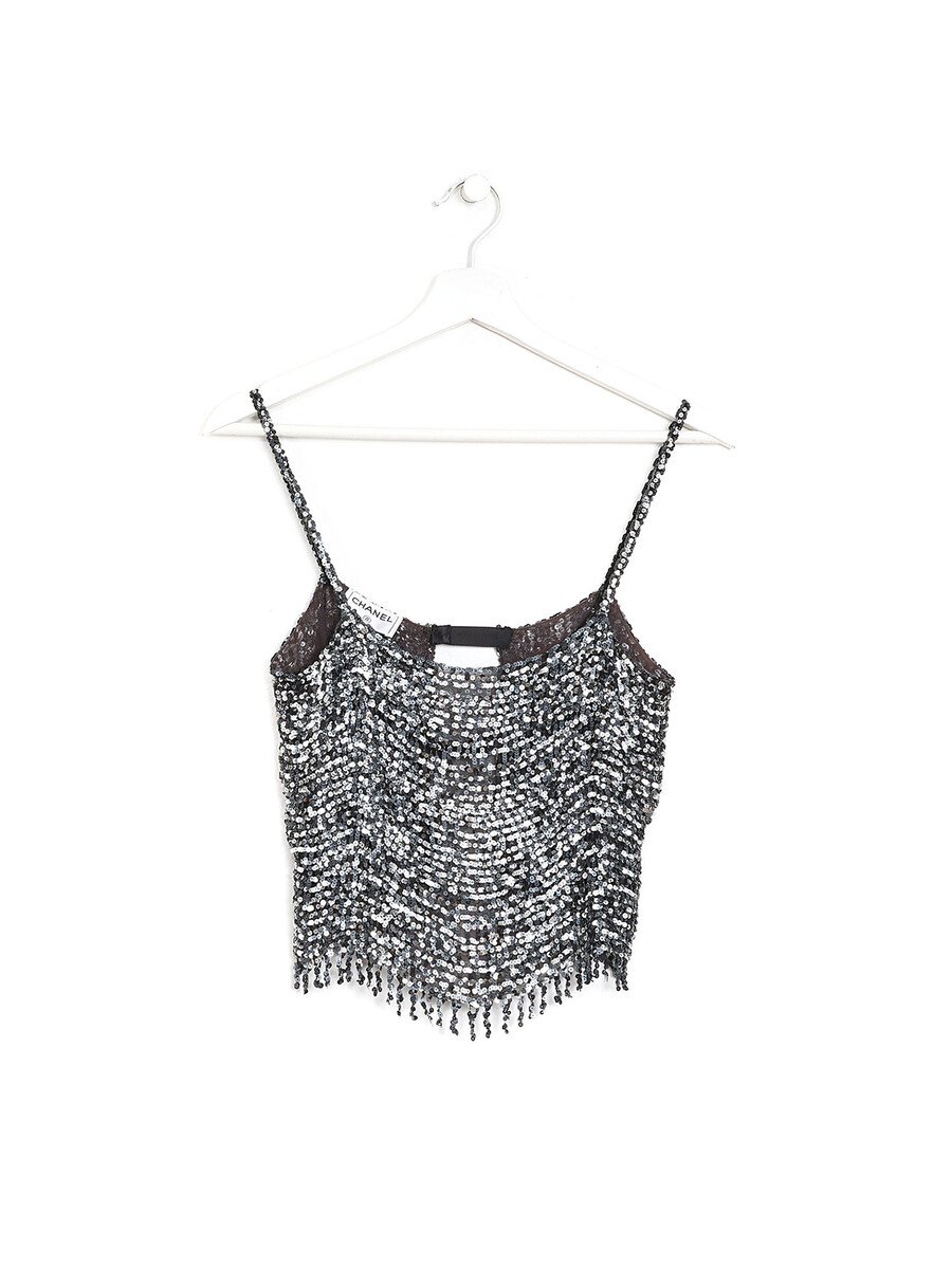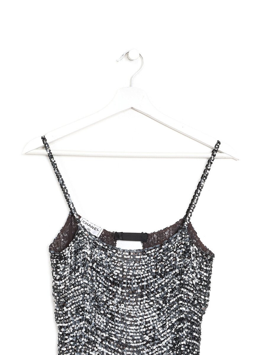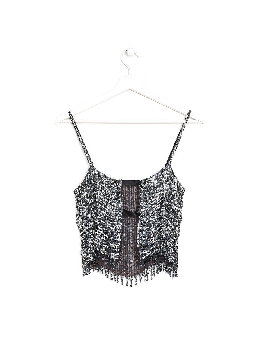 Haut sans manches avec motif de sequins brodés dans un argent chatoyant. Encolure carrée. Dos ouvert avec fermeture à bouton par fine bretelle