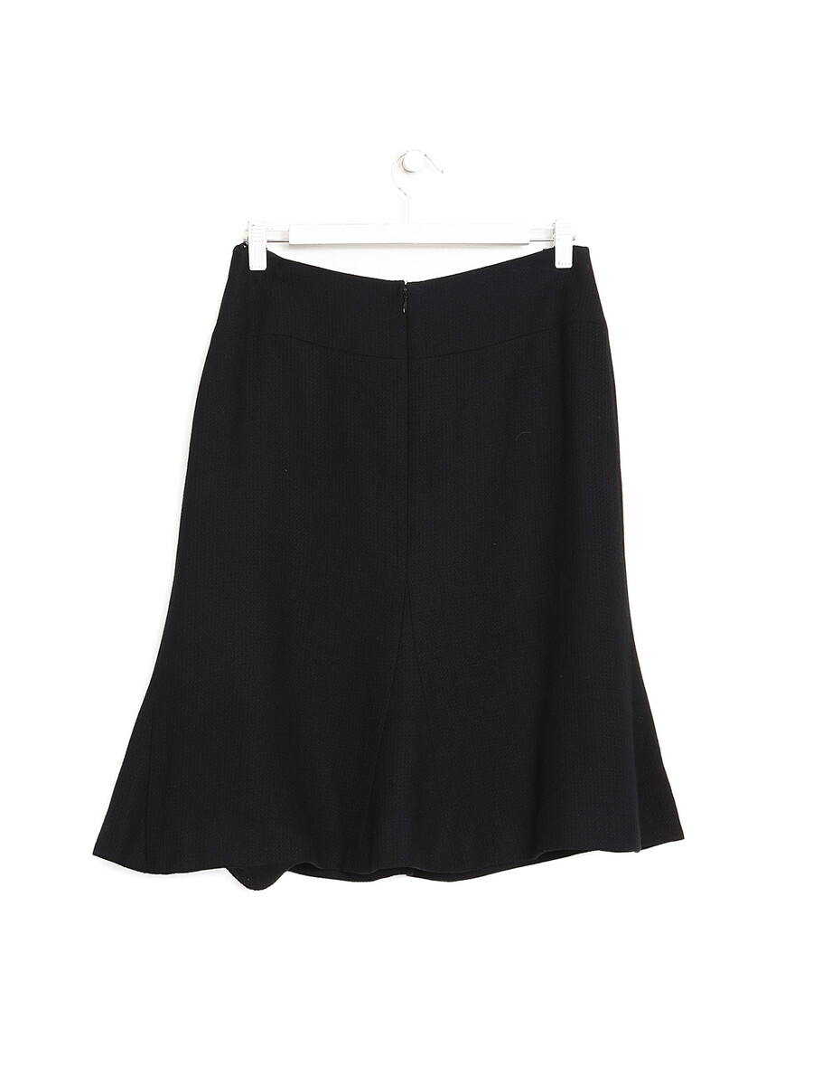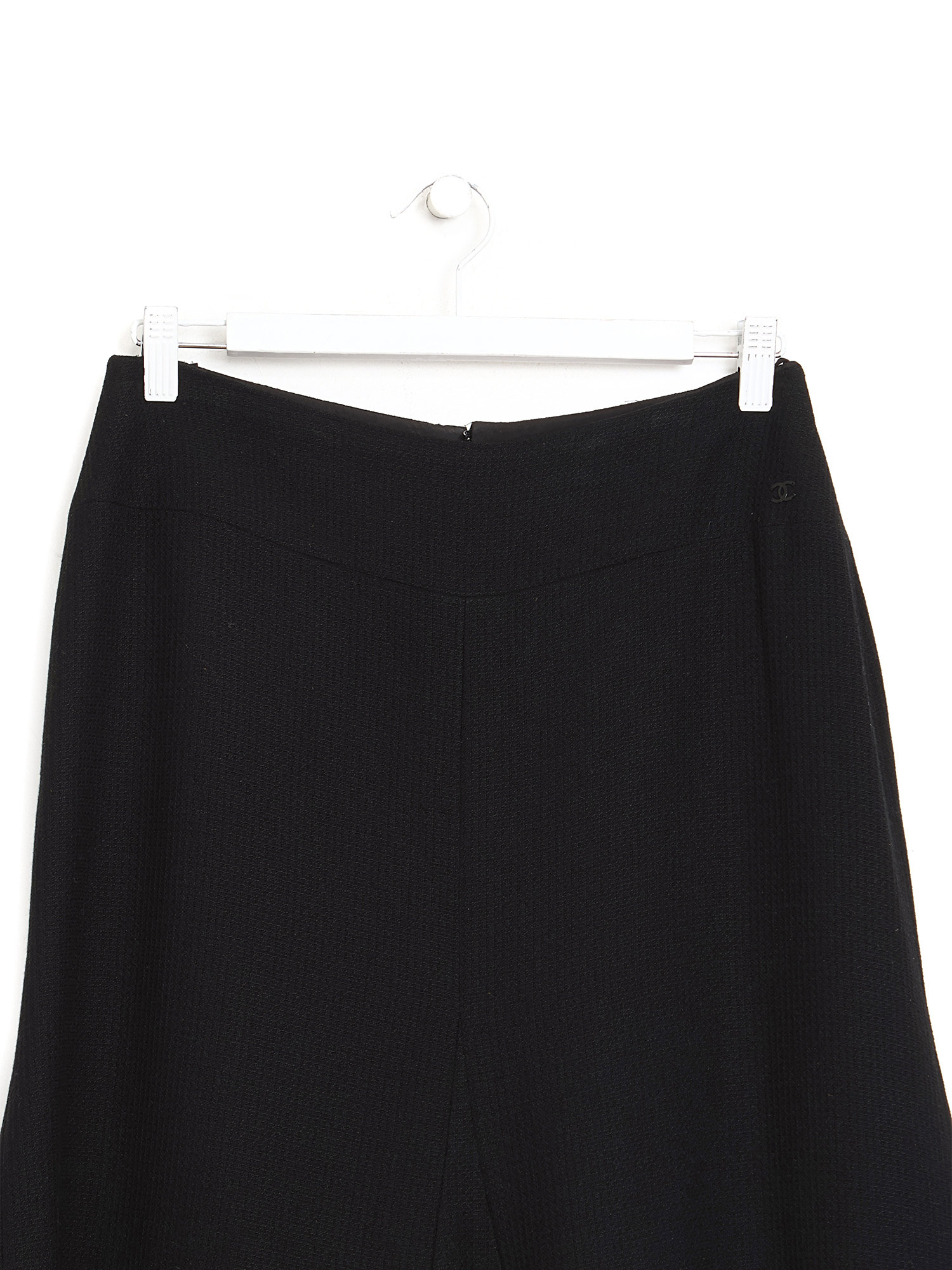 Jupe mi-longue en laine noire avec un petit logo Chanel à la hanche. Fermeture à glissière. Doublure en soie.