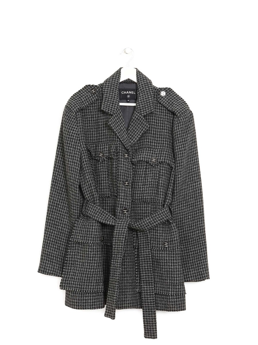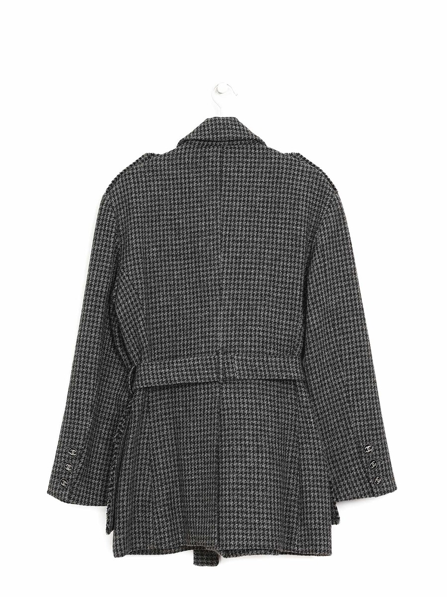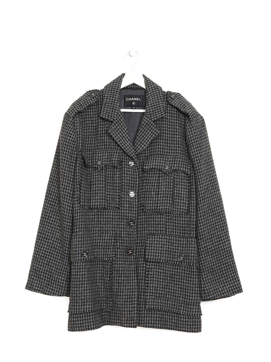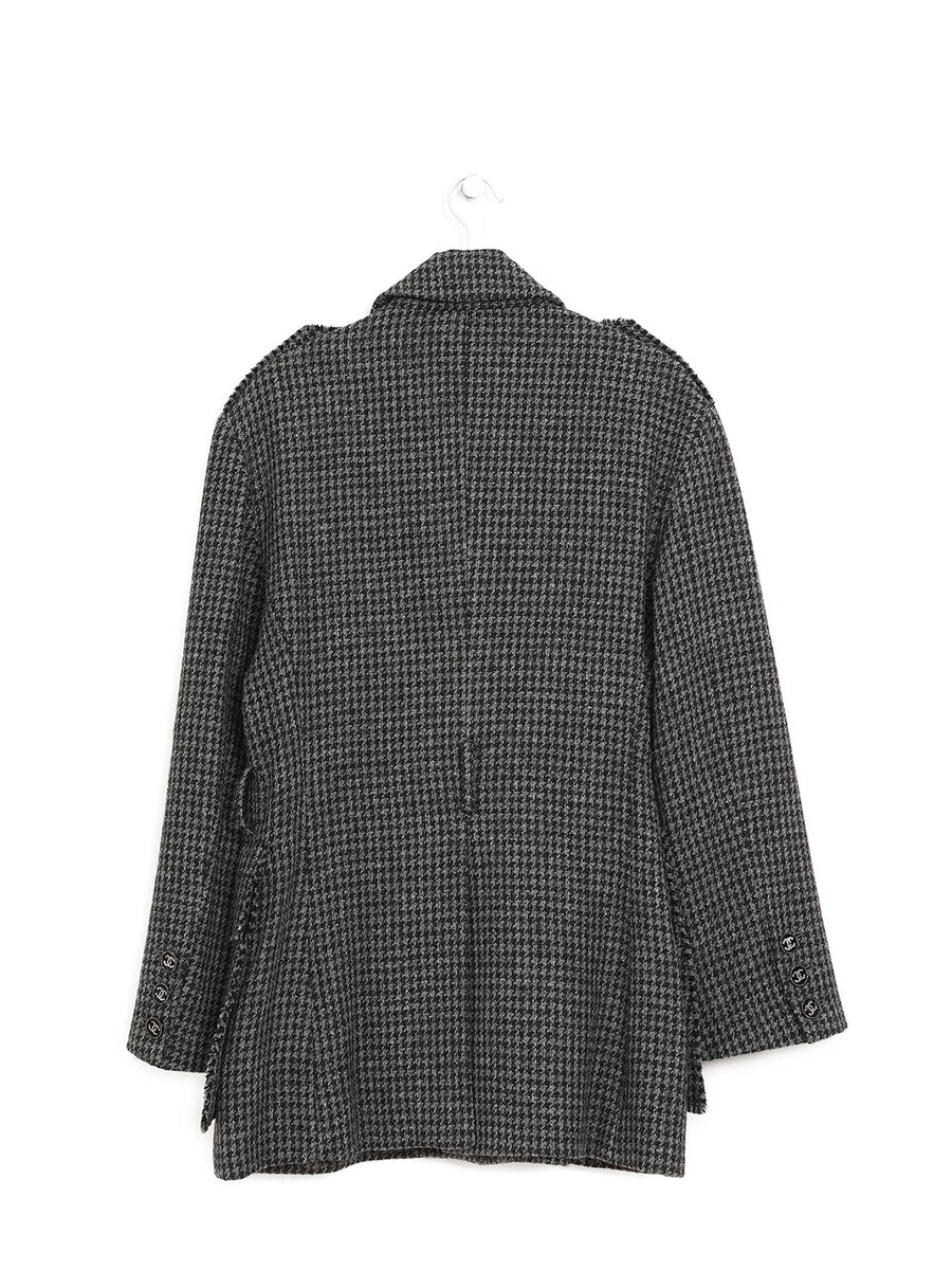 Veste mi-longue en laine à carreaux dans les tons de gris. Fermeture à boutons logo CC entrelacé avec strass, tons de gris et noir. Col à revers cranté. Quatre poches. Épaulettes.