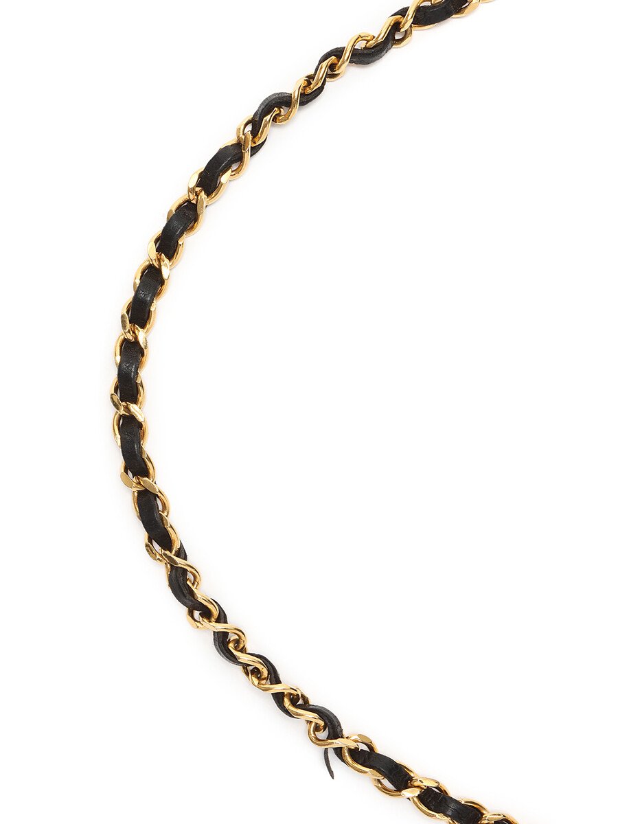 Ceinture à chaîne en cuir tressé avec des maillons dorés, ornée d'un logo CC gravé sur le pendentif. Fermoir à crochet. Quincaillerie dorée.