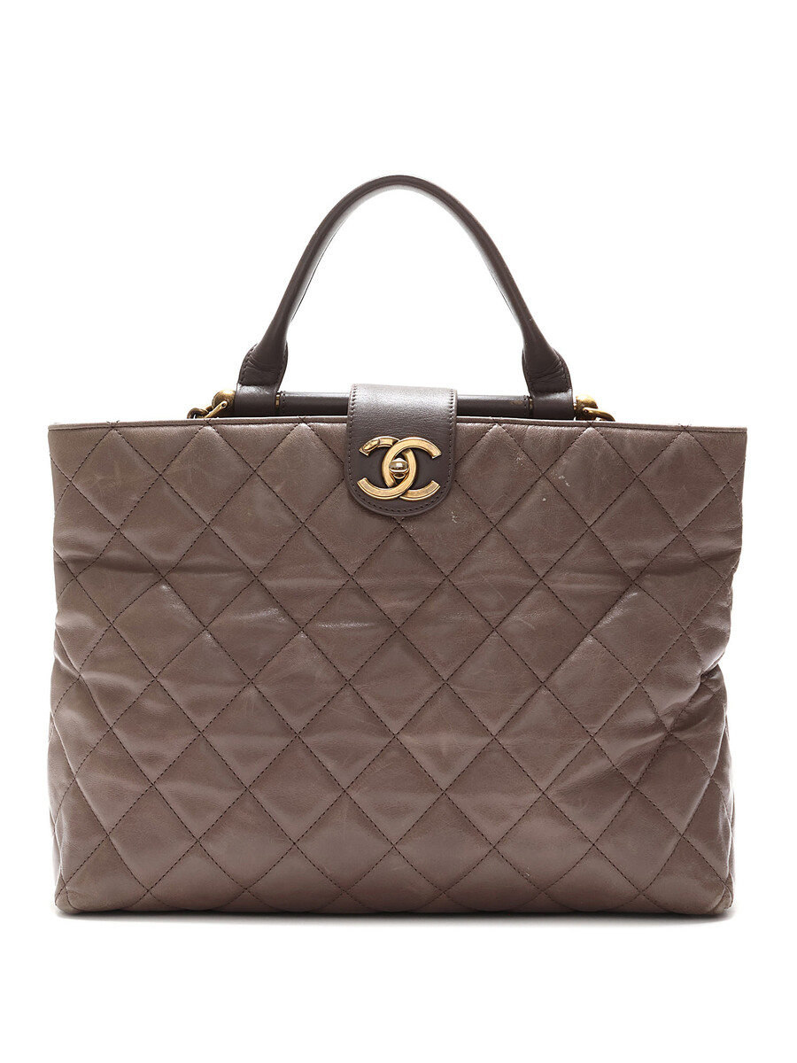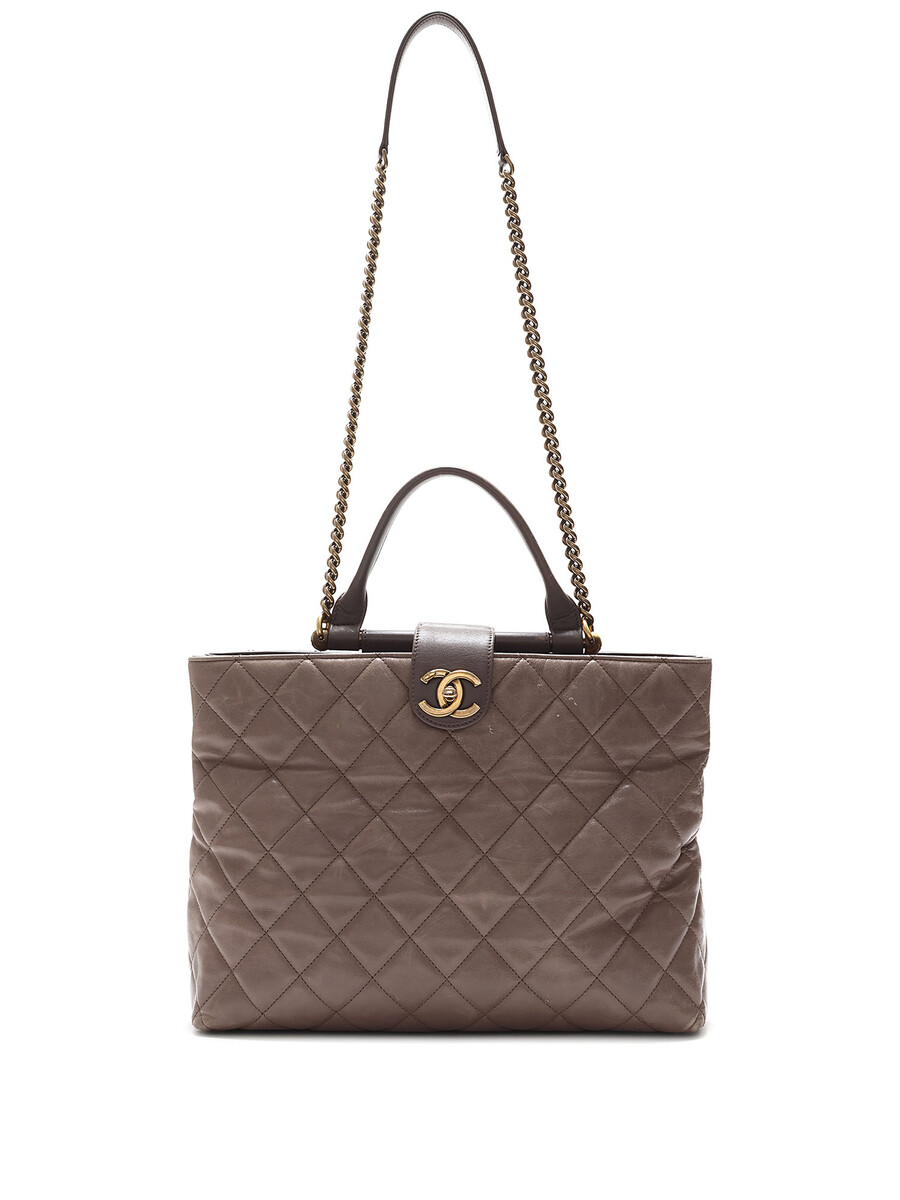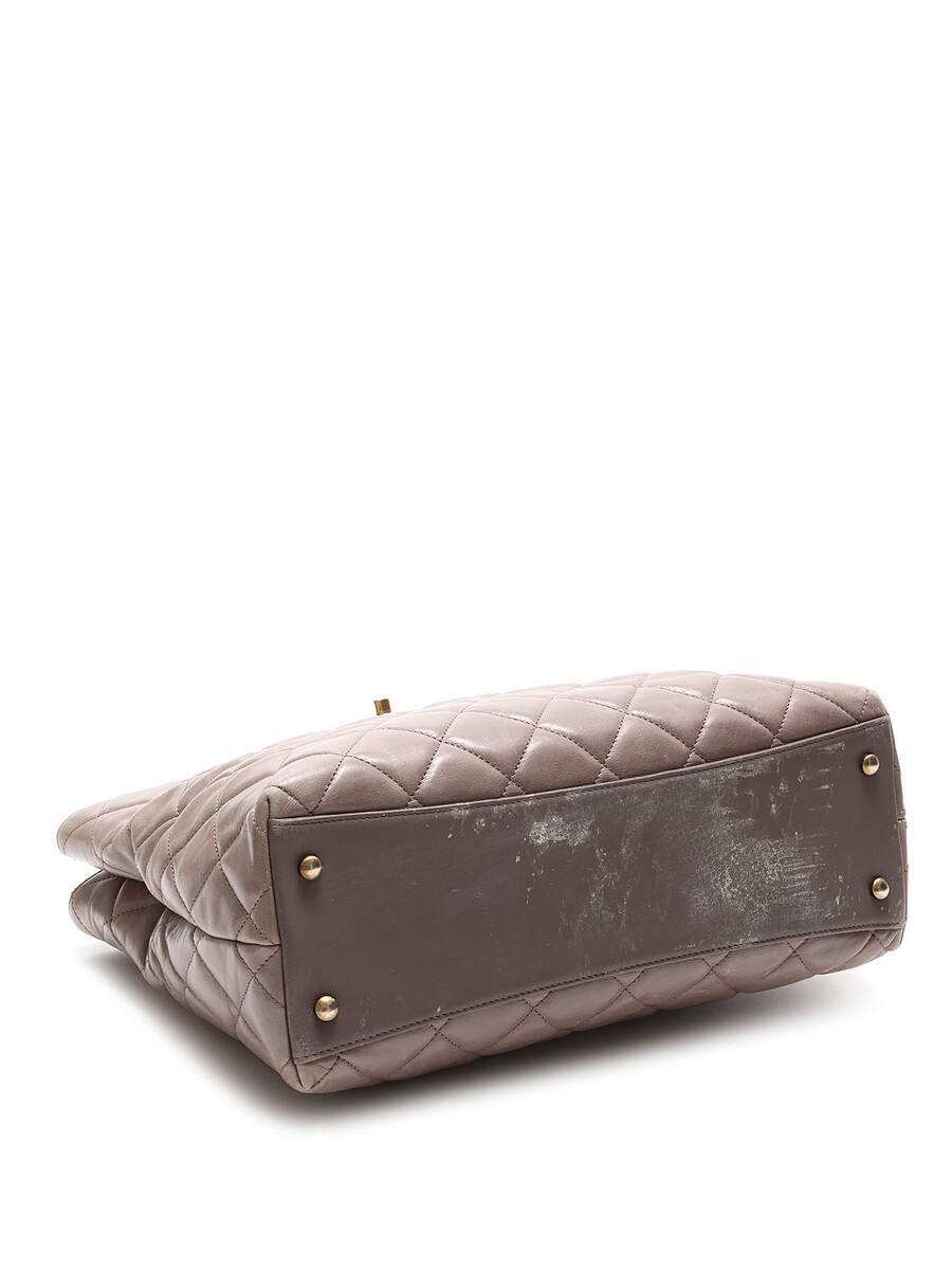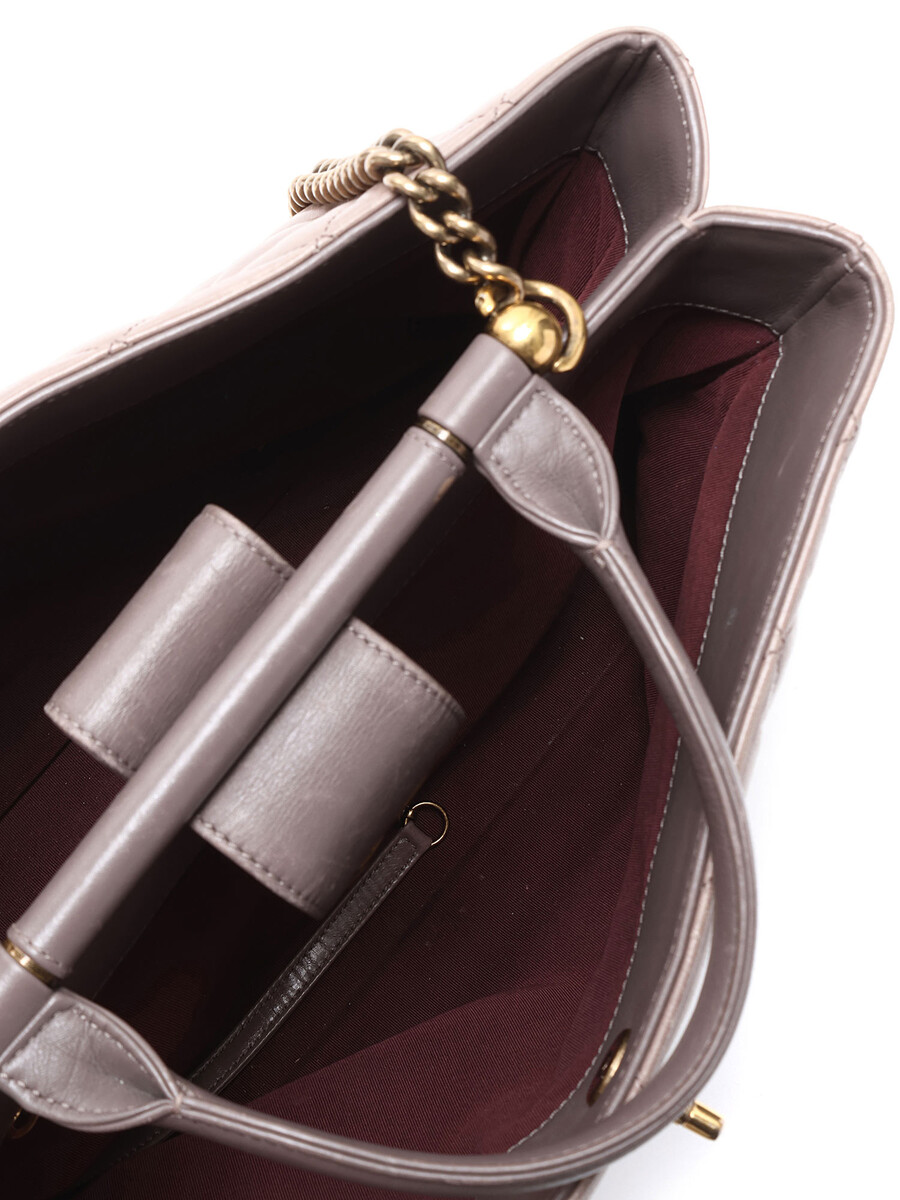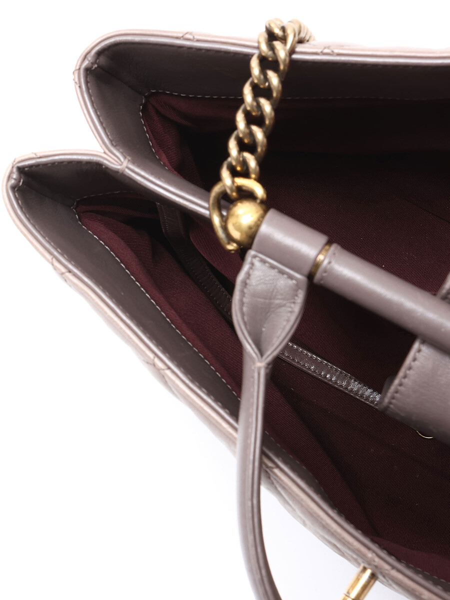 Sac à bandoulière en cuir matelassé gris avec fermeture à tourniquet. Bandoulière en chaîne et cuir entrelacés. Quincaillerie dorée.