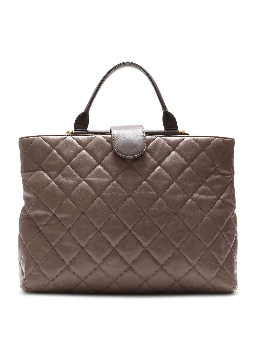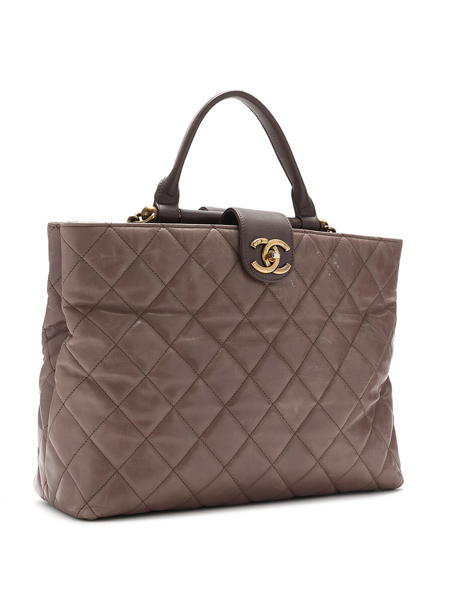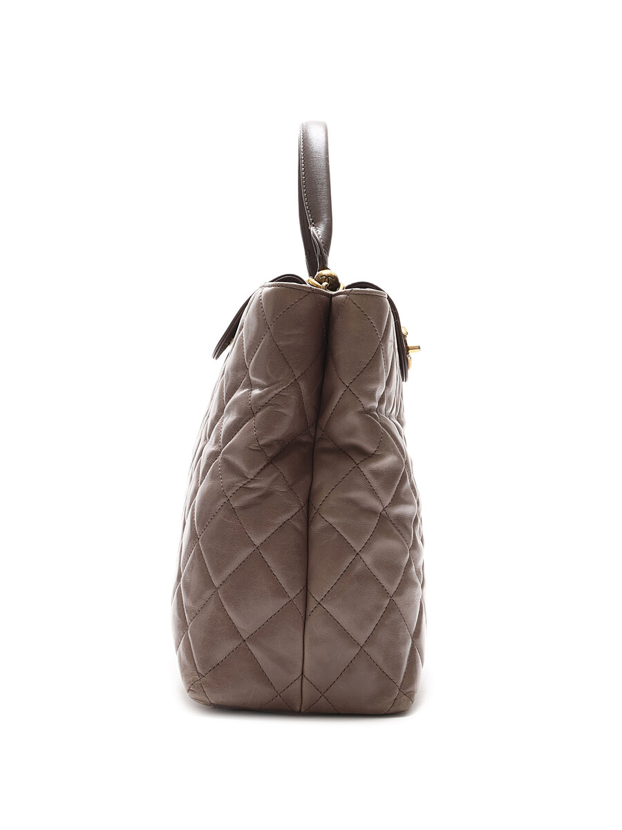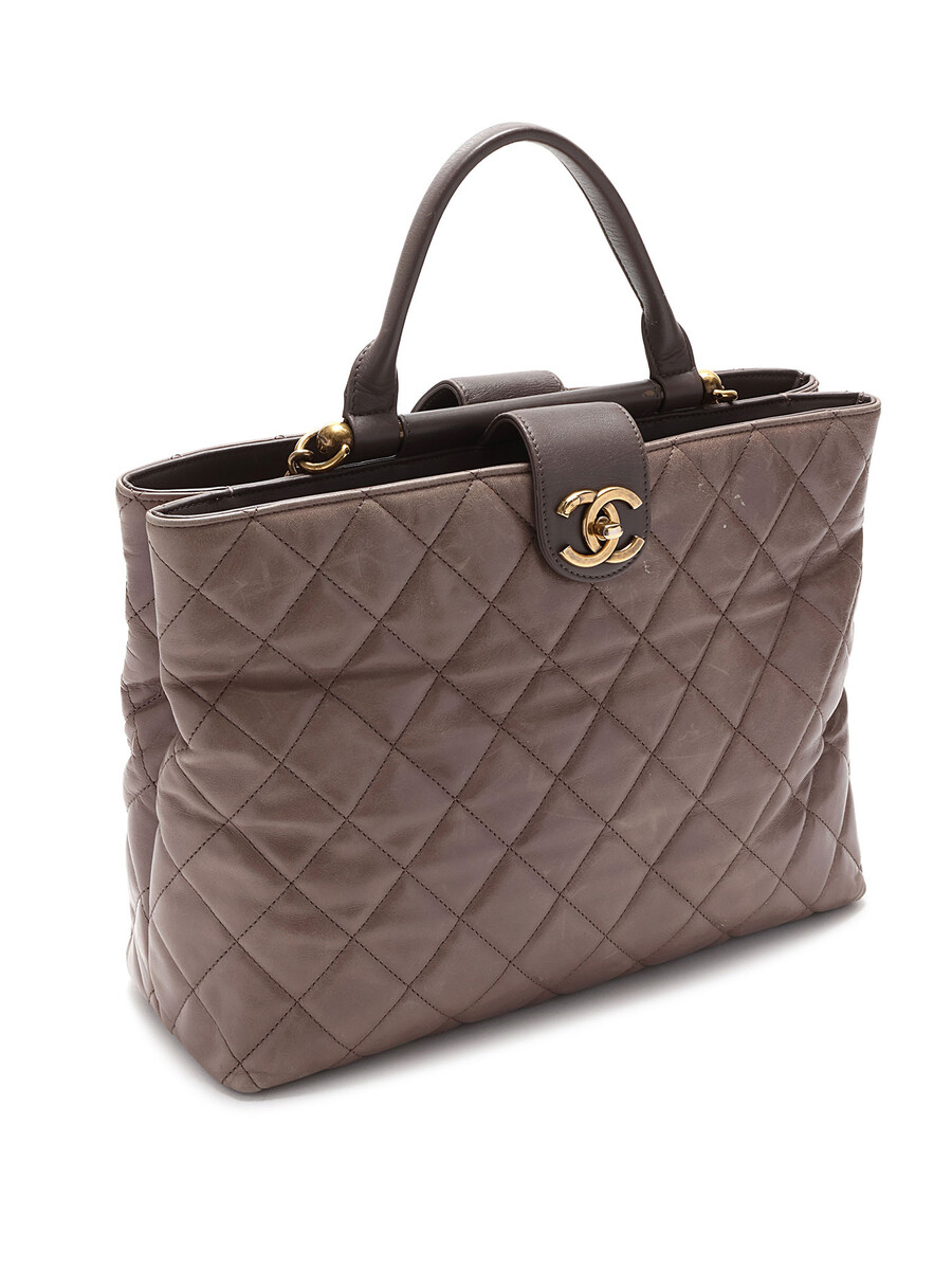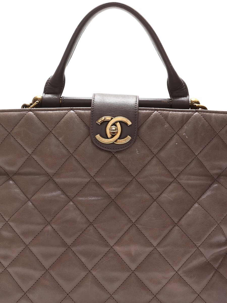 Sac à bandoulière en cuir matelassé gris avec fermeture à tourniquet. Bandoulière en chaîne et cuir entrelacés. Quincaillerie dorée.