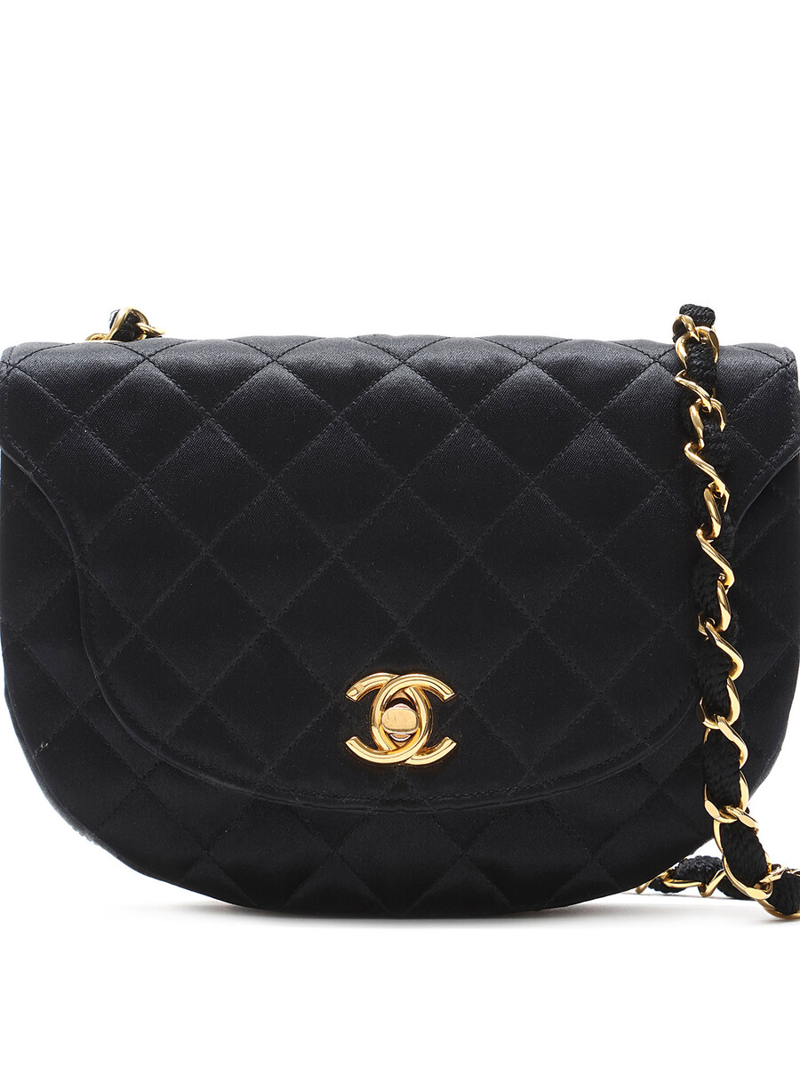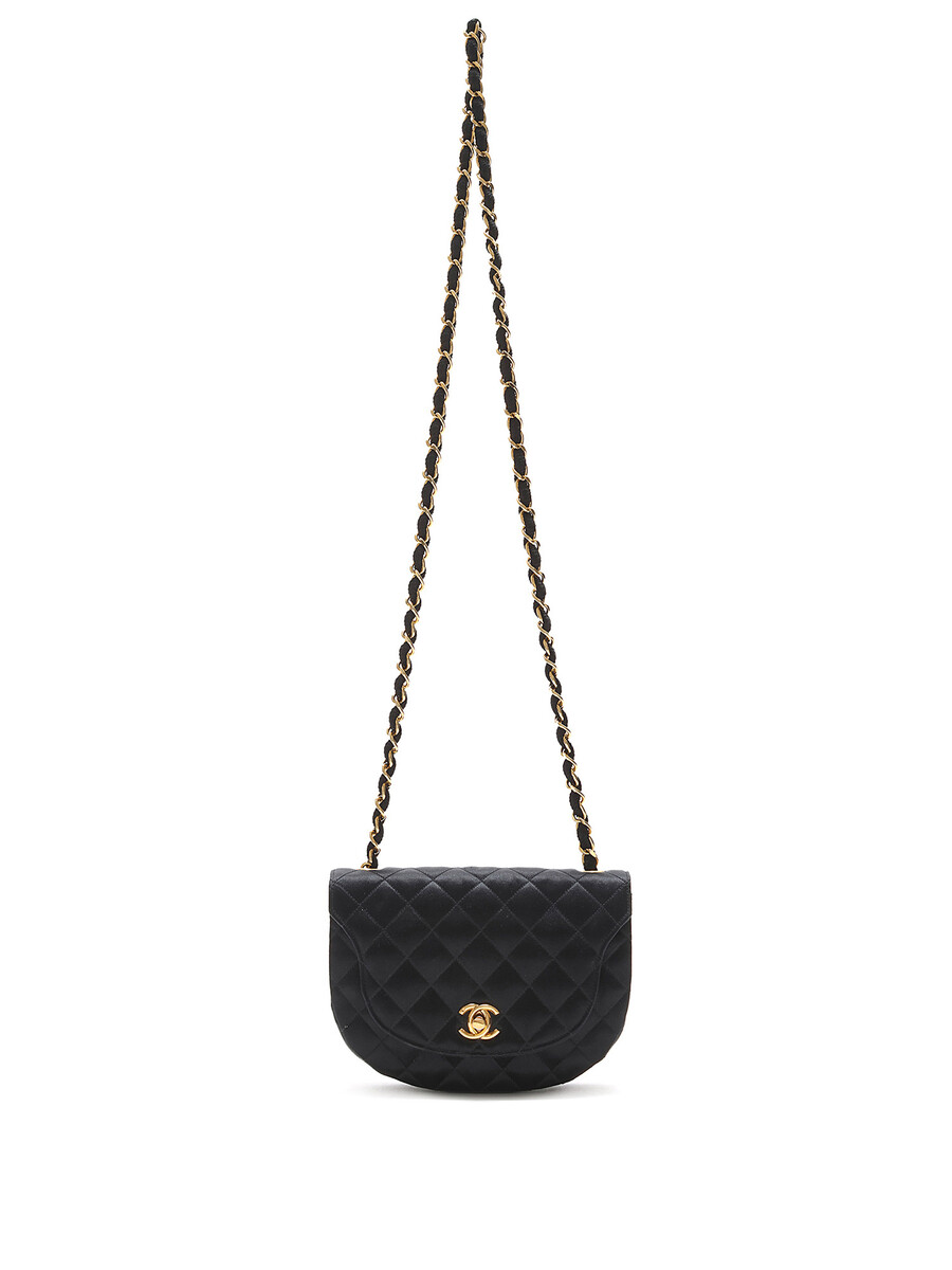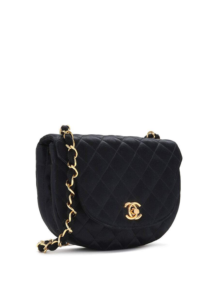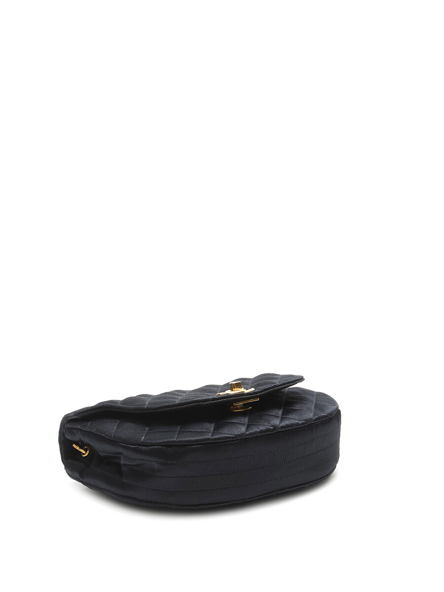 Mini sac à l'épaule en tissu matelassé noir. Fermeture à tourniquet. Bandoulière en chaîne entrelacée de tissu. Quincaillerie dorée.