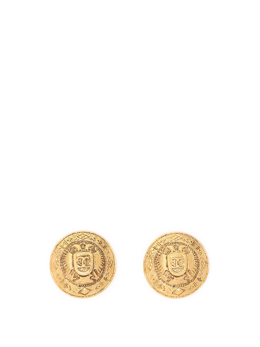 Boucles d'oreilles en métal doré avec médaillon rond, motif d'armoirie et logo CHANEL. Fermeture à clip.