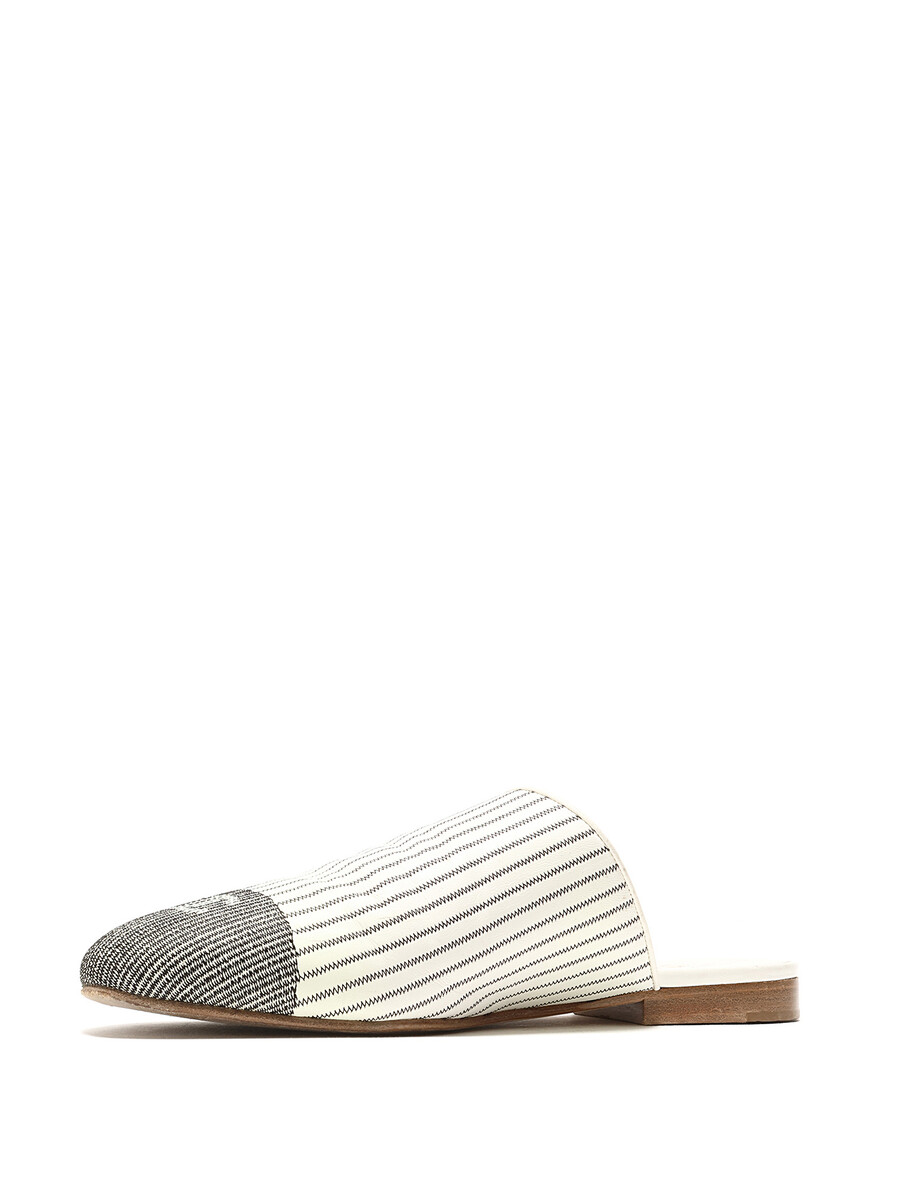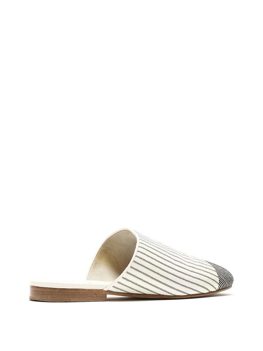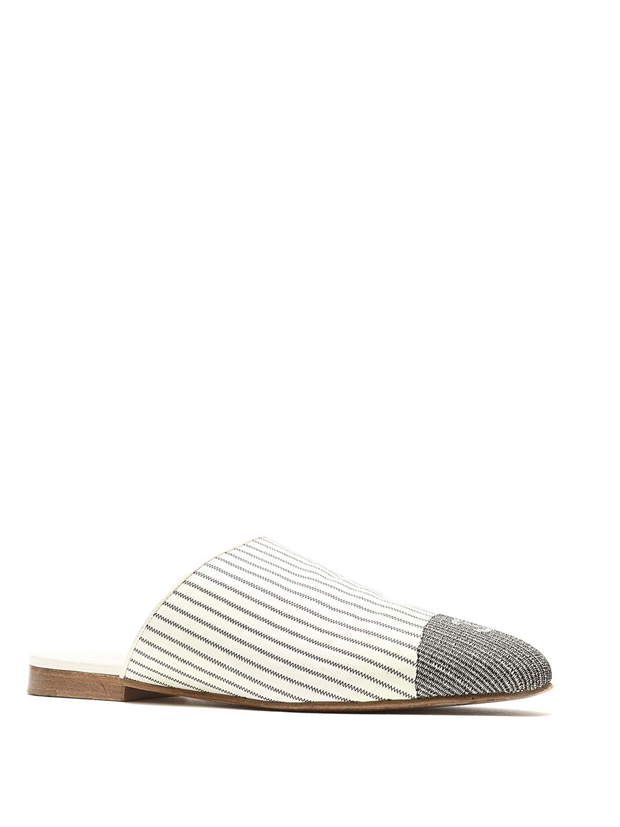 Mules en toile rayée noir et blanc avec détails de logo. Style sans attache avec bout rond fermé. Semelle en cuir.