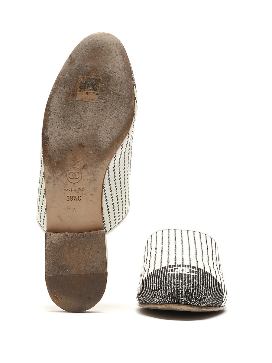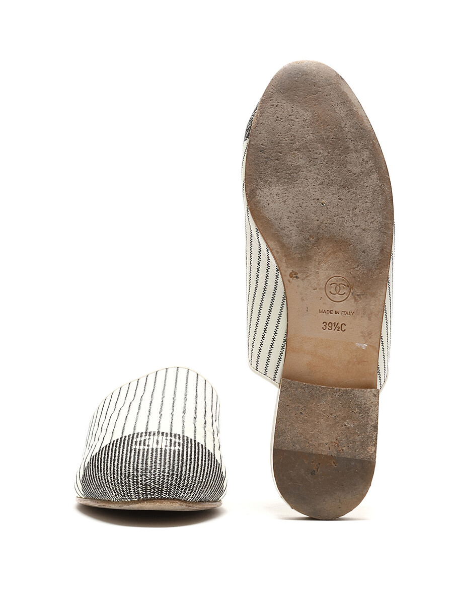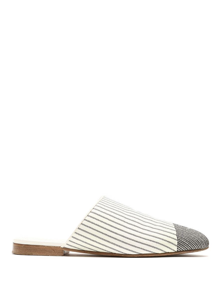 Mules en toile rayée noir et blanc avec détails de logo. Style sans attache avec bout rond fermé. Semelle en cuir.