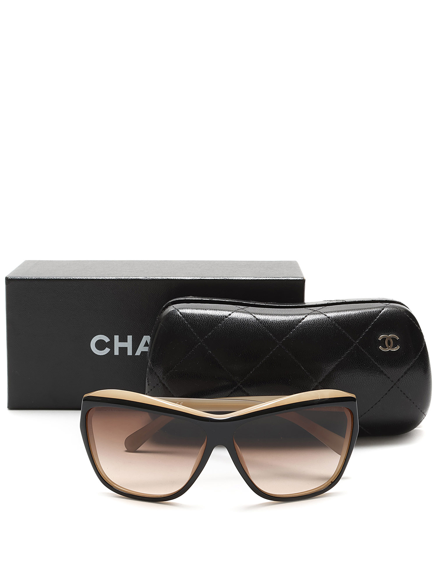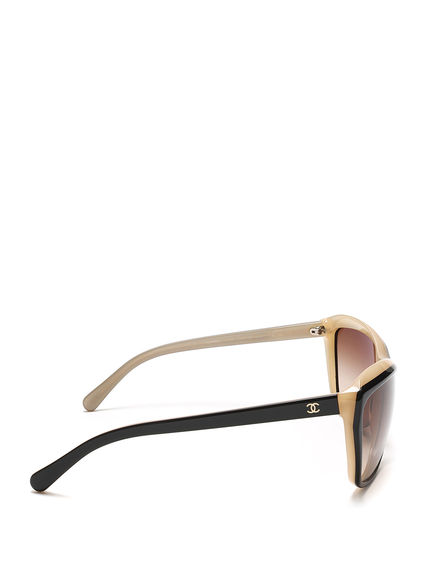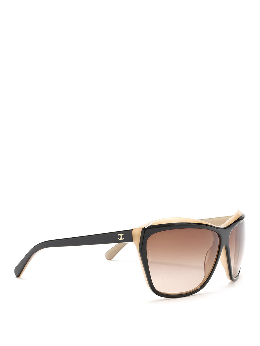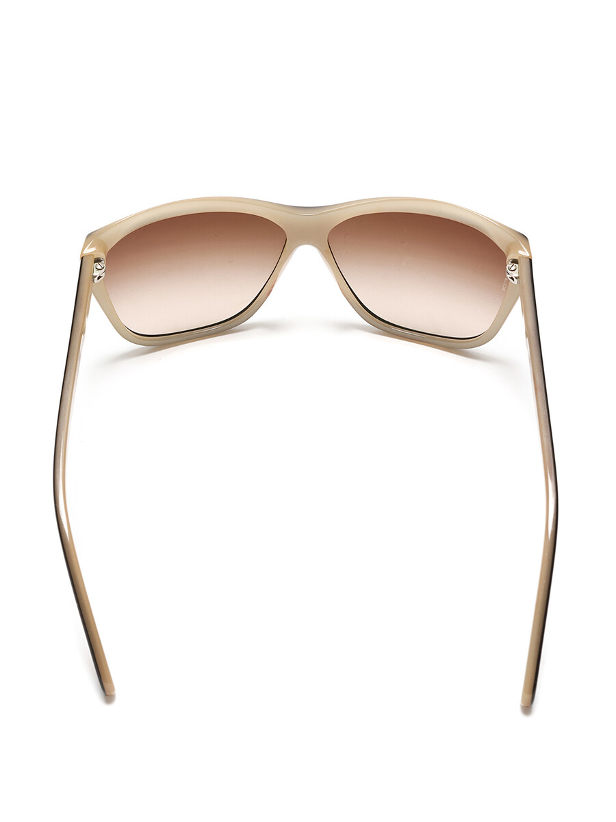 Lunettes de soleil en œil-de-chat en acétate beige et noir. Ferrures argentées aux branches.