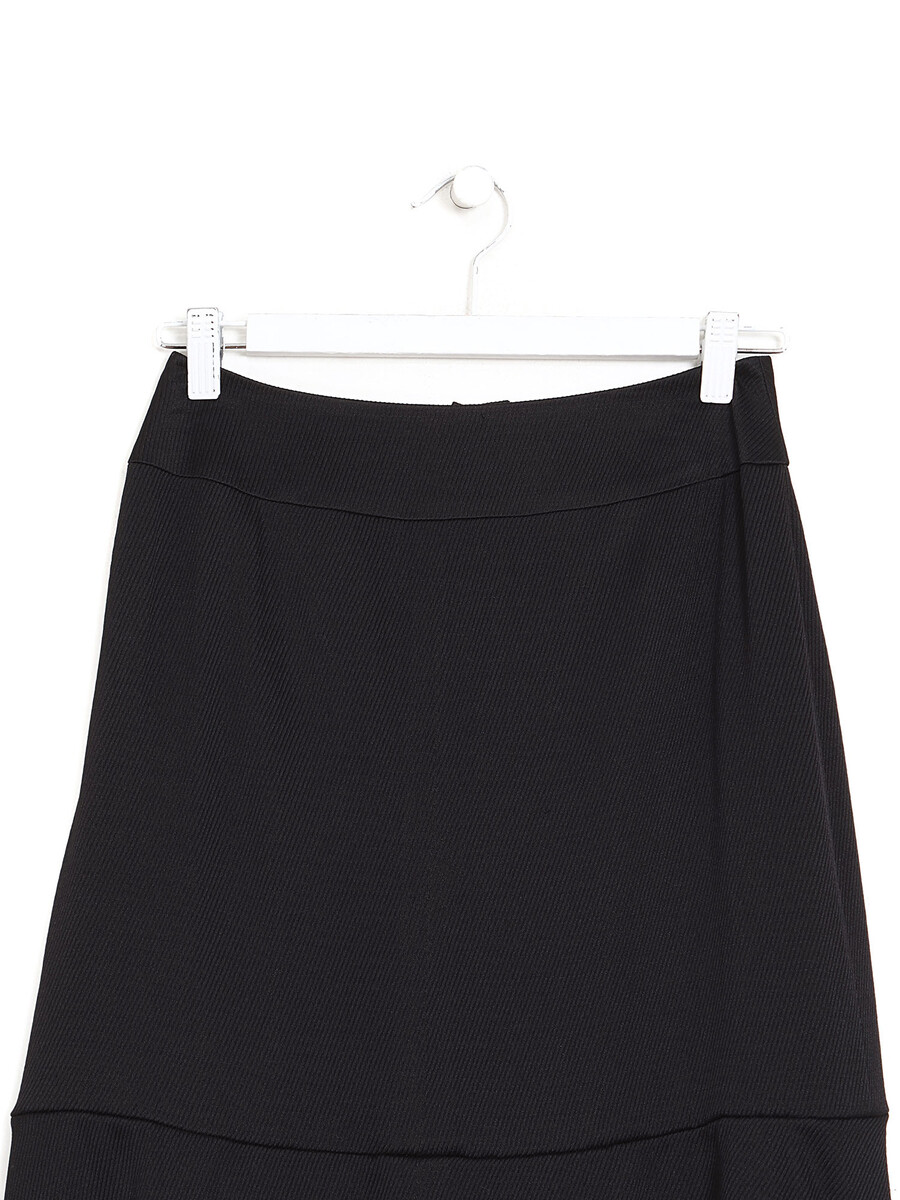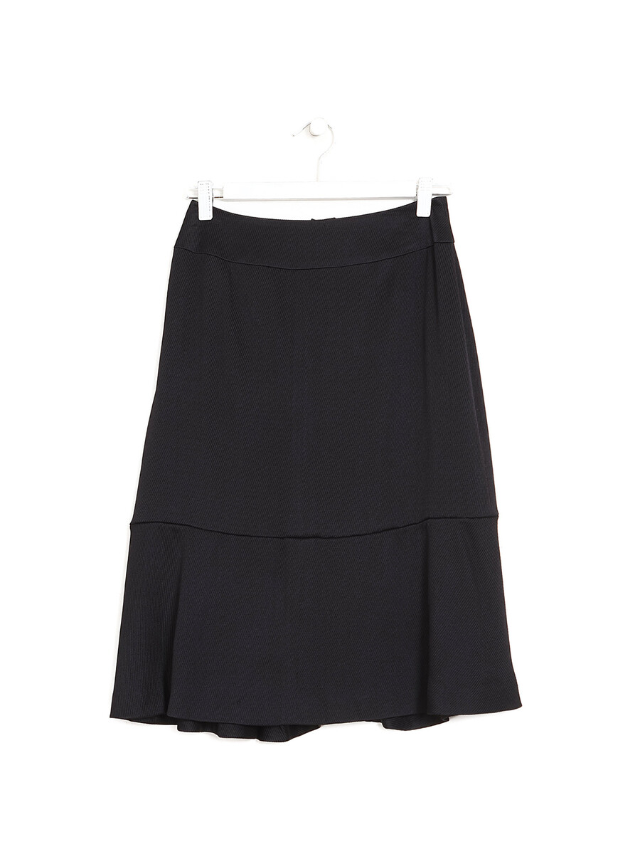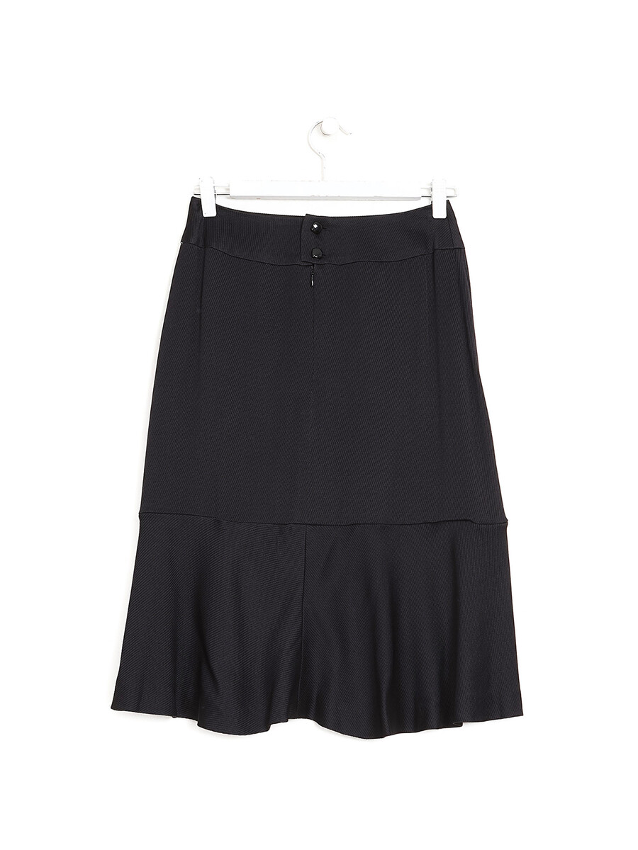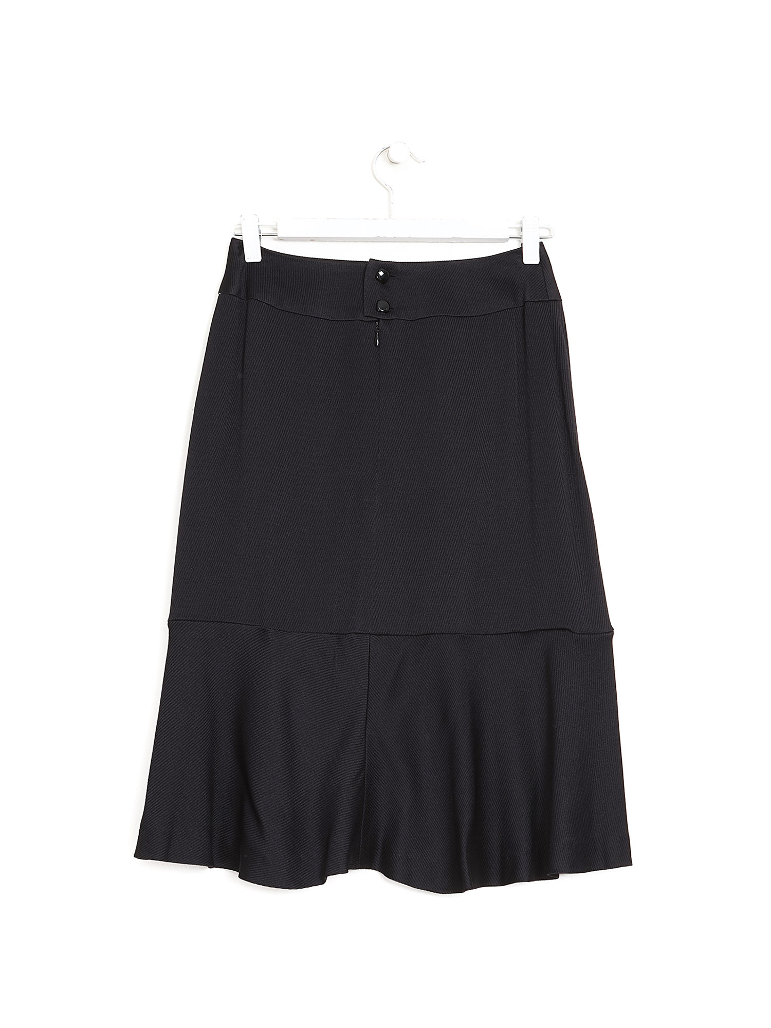Jupe mi-longue noire à boutons griffés. Fermeture éclair. Coupe droite.