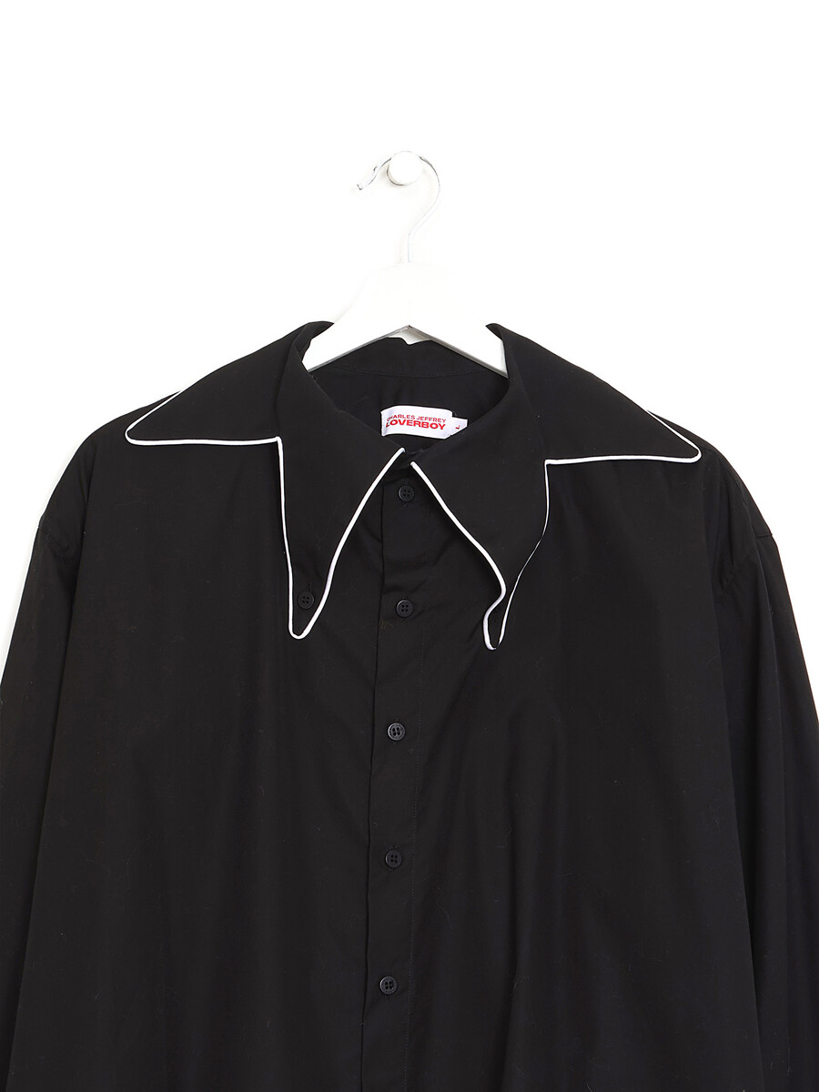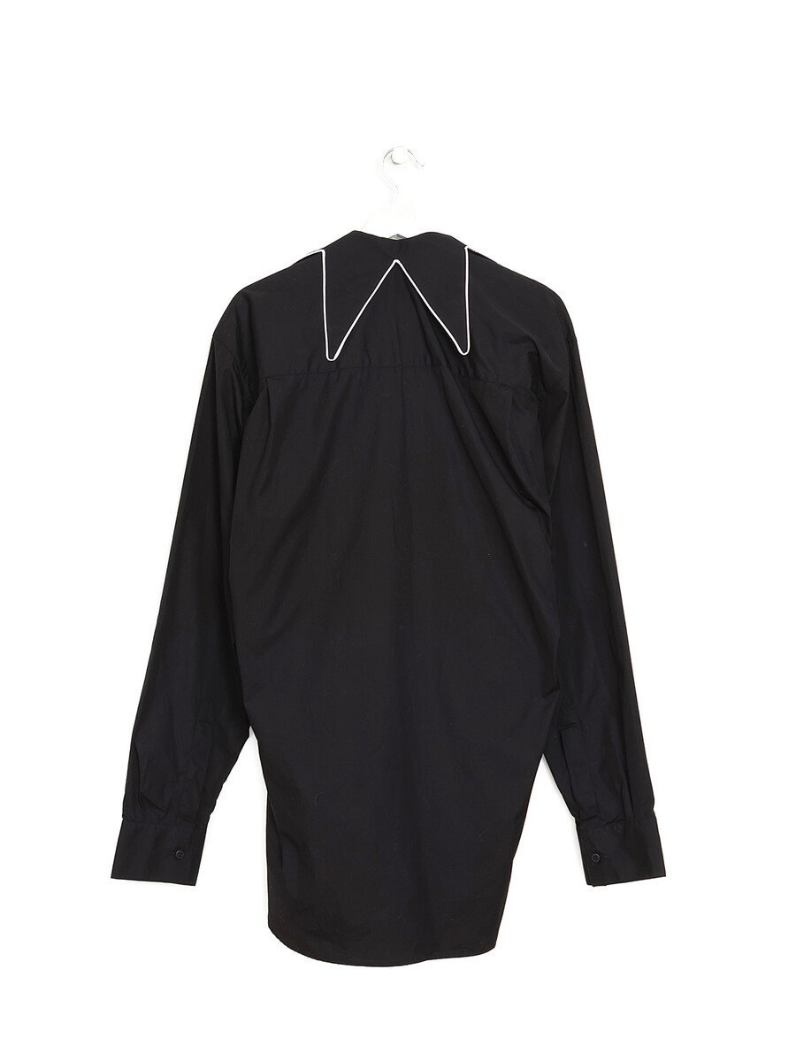 Chemise à manches longues noire avec col exagérément large. Fermeture à boutons.