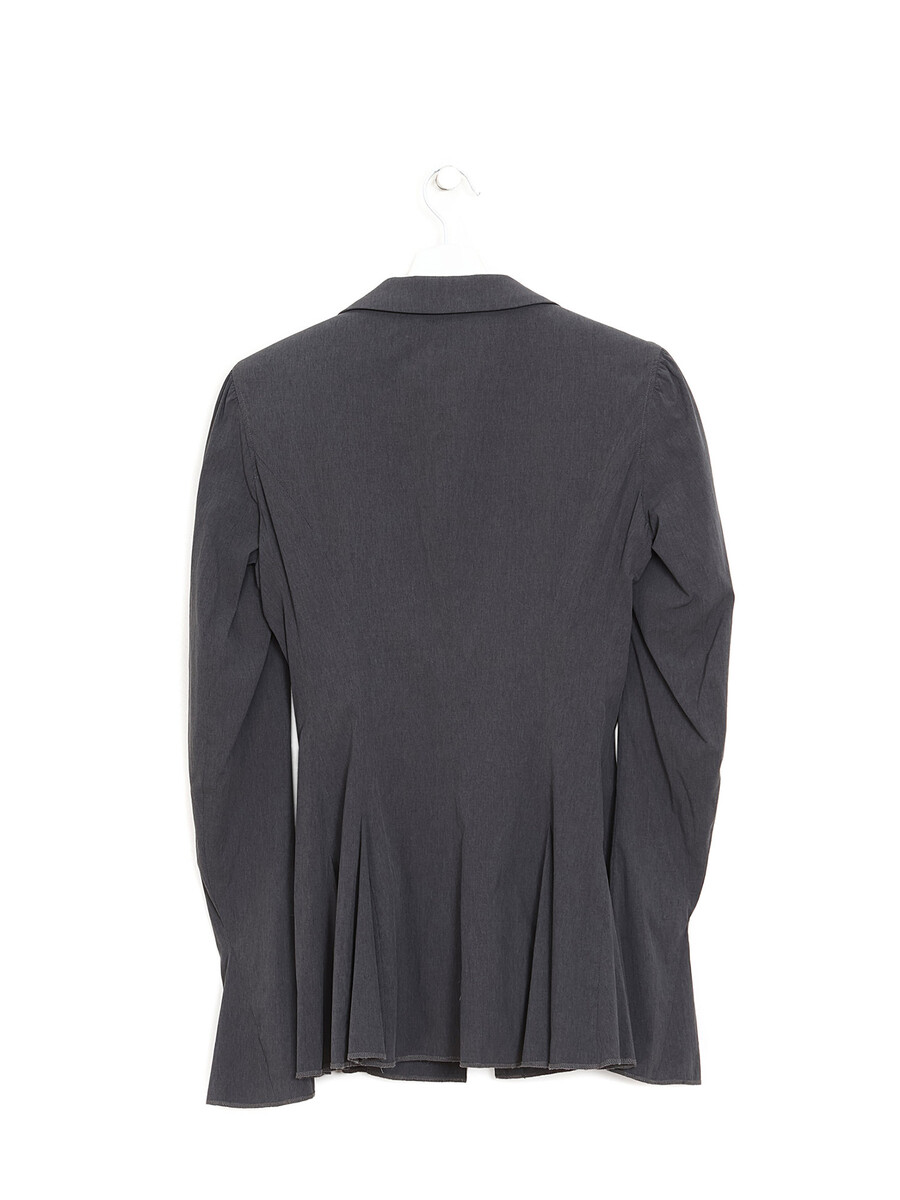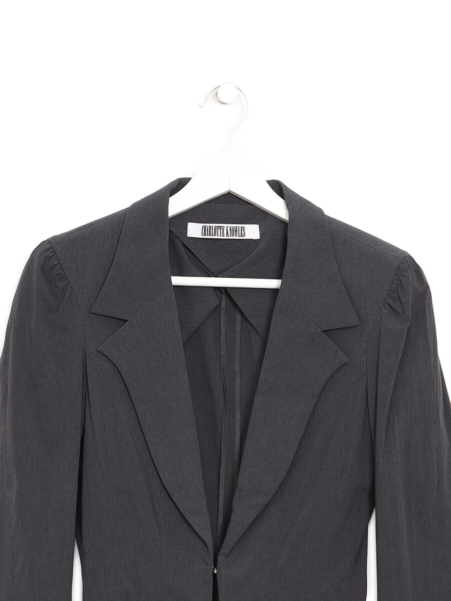 Veston à manches longues en gris foncé avec encolure profonde et fermeture à agrafes. Col chemise avec une coupe ajustée et élégante.
