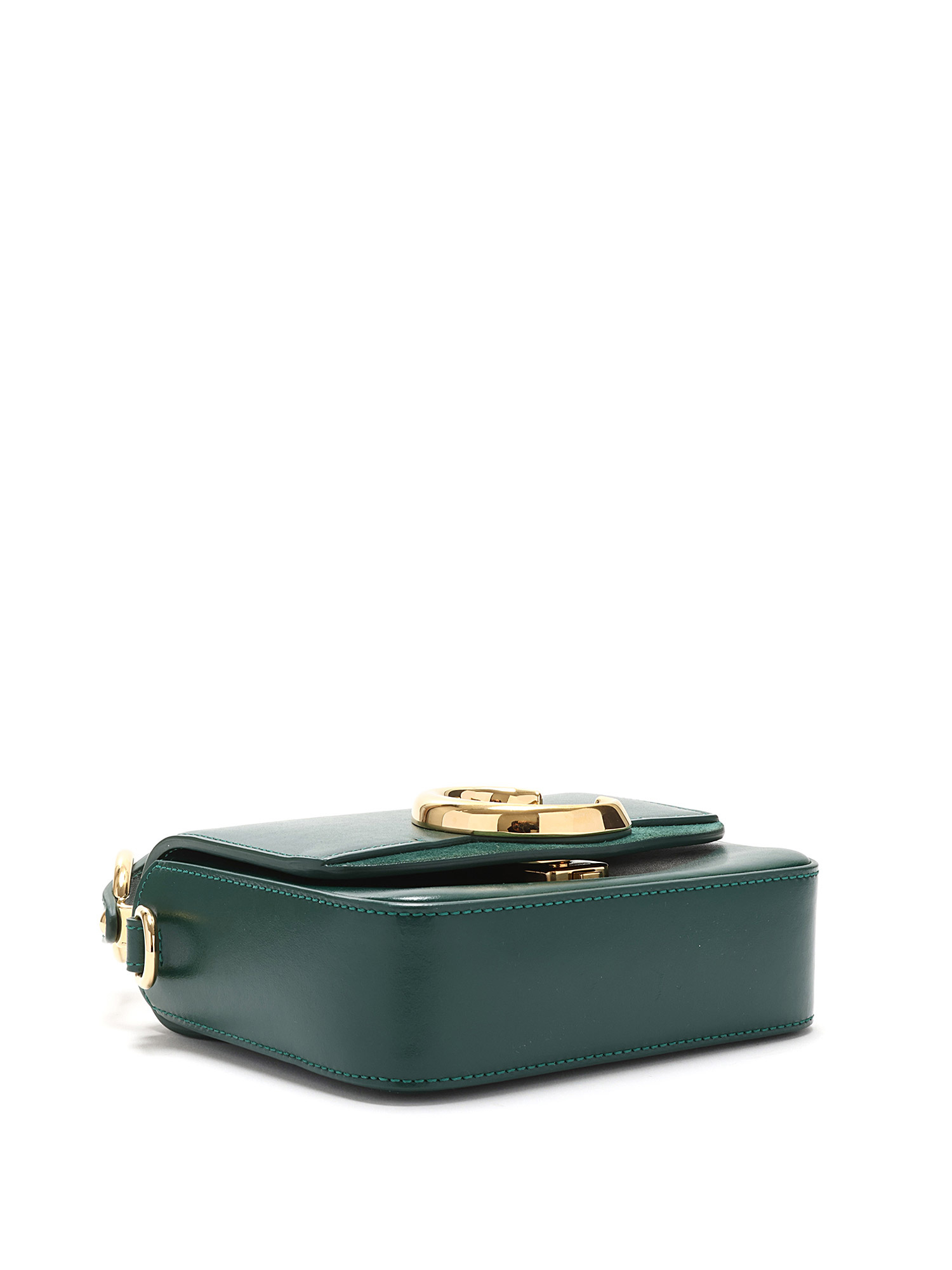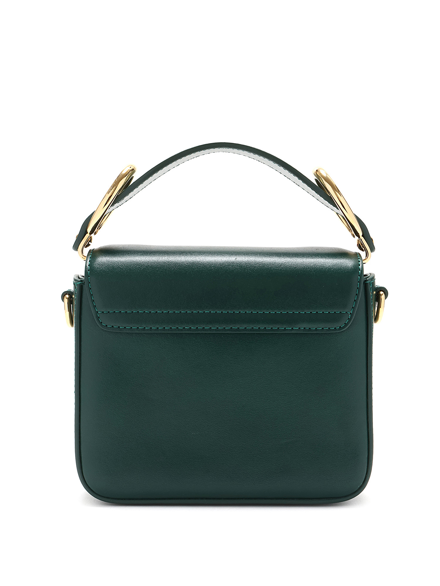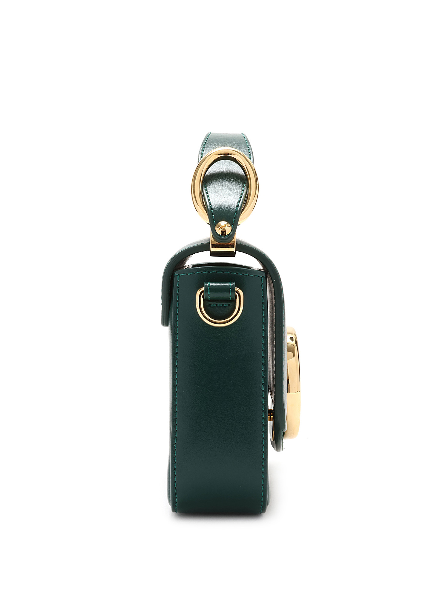 Sac bandoulière en cuir vert foncé avec détail de bague dorée. Fermeture à rabat magnétique. Bandoulière ajustable et amovible. Ferrures dorées.
