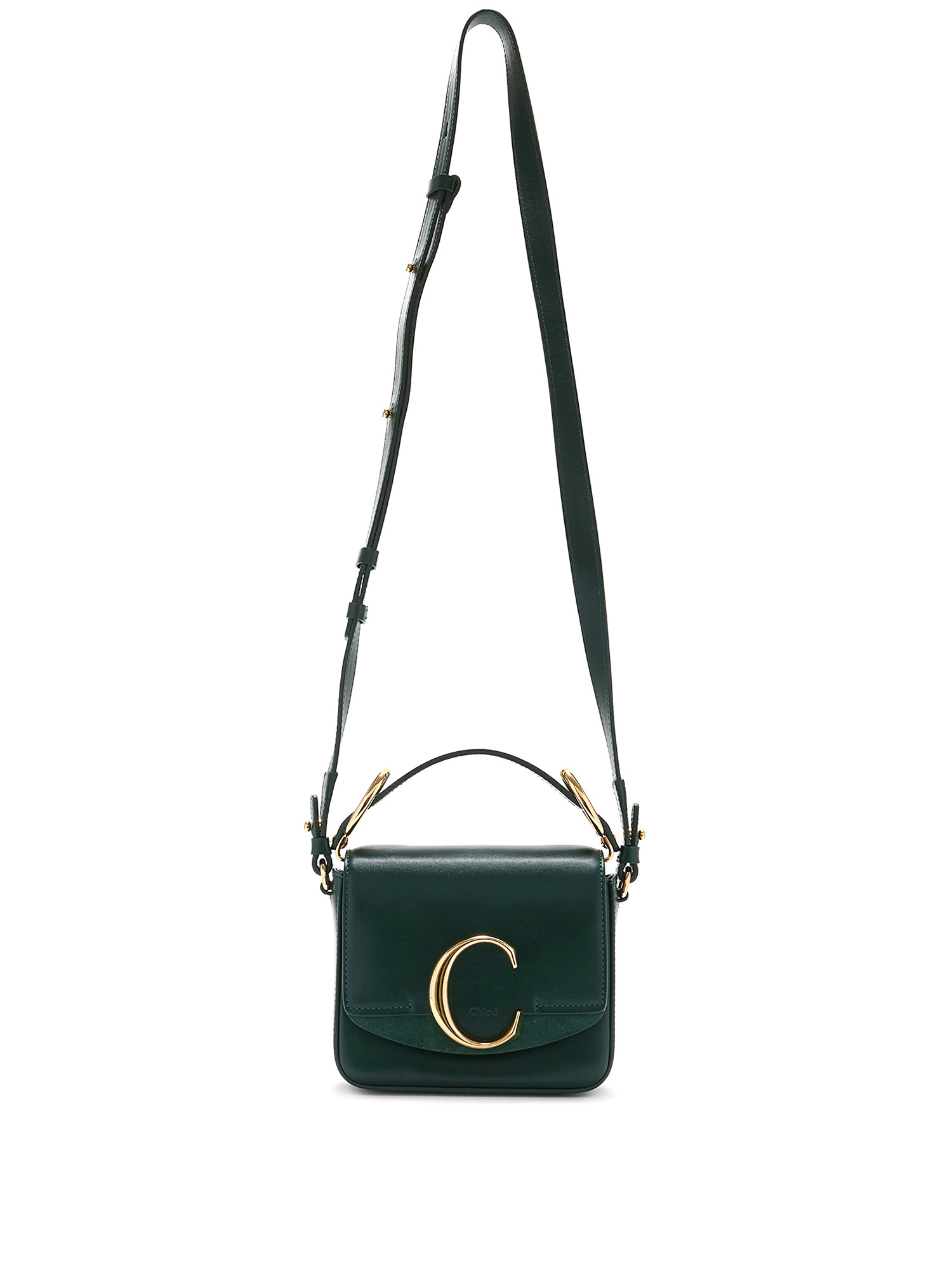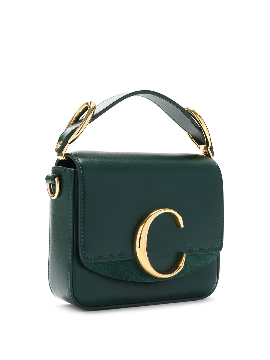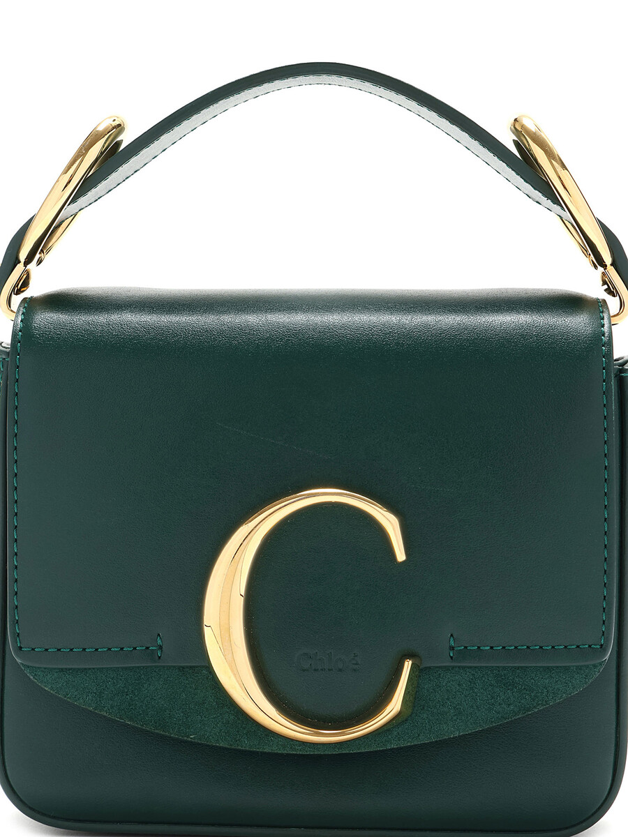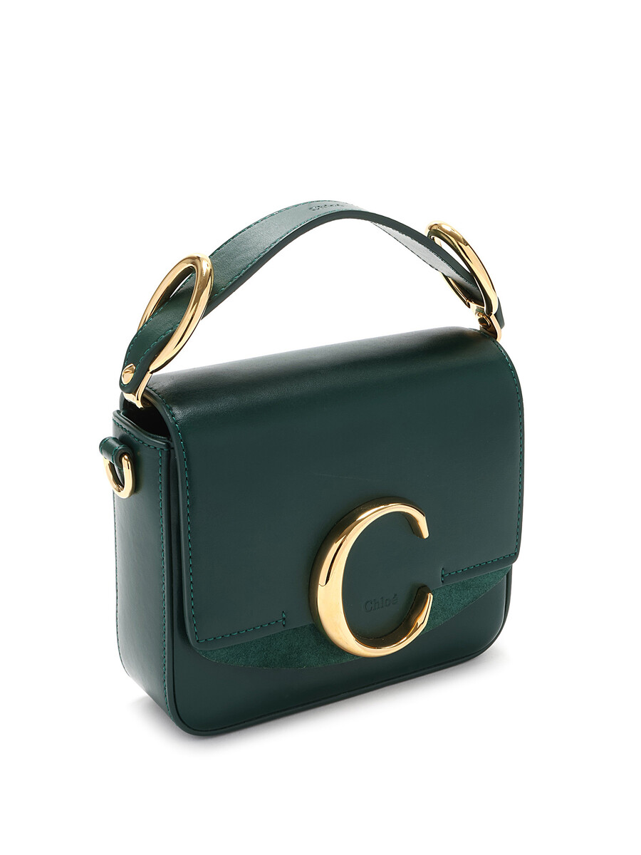 Sac bandoulière en cuir vert foncé avec détail de bague dorée. Fermeture à rabat magnétique. Bandoulière ajustable et amovible. Ferrures dorées.