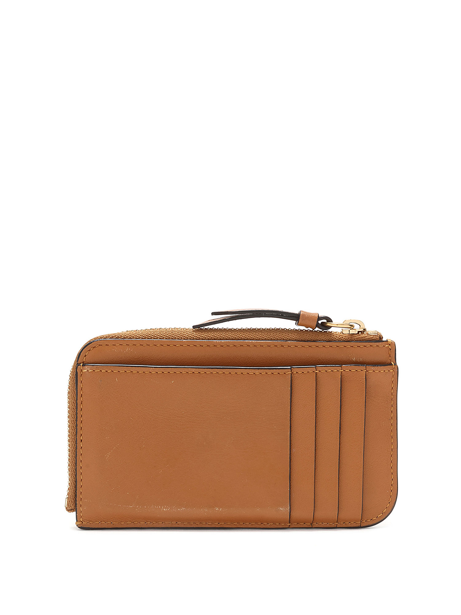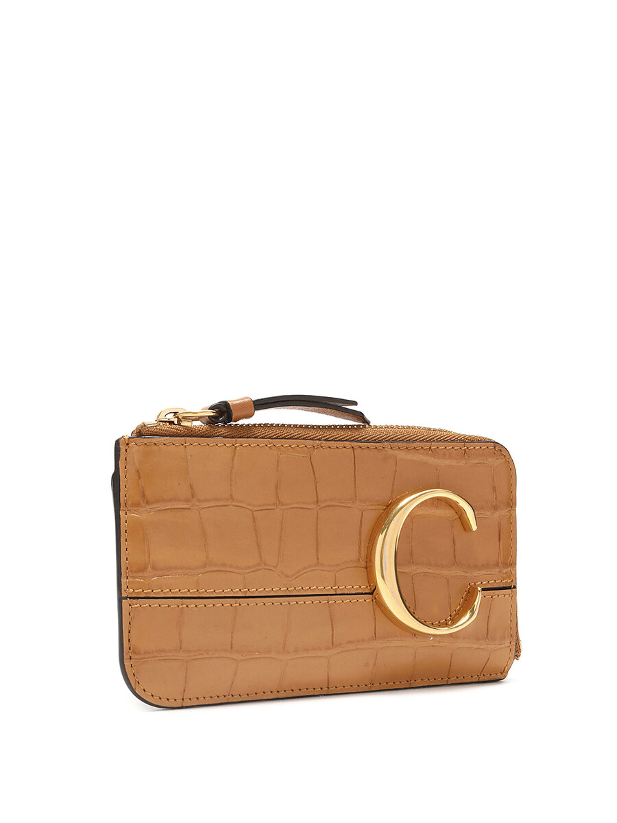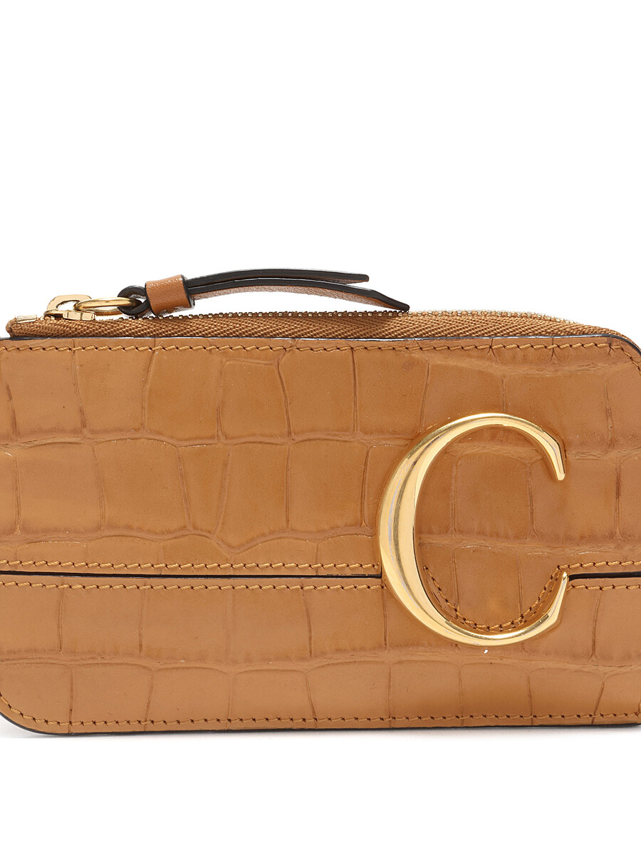 Portefeuille en cuir embossé crocodile avec fermeture à glissière. Ferrure en anneau doré. Coutures ton sur ton. Compact et élégant.
