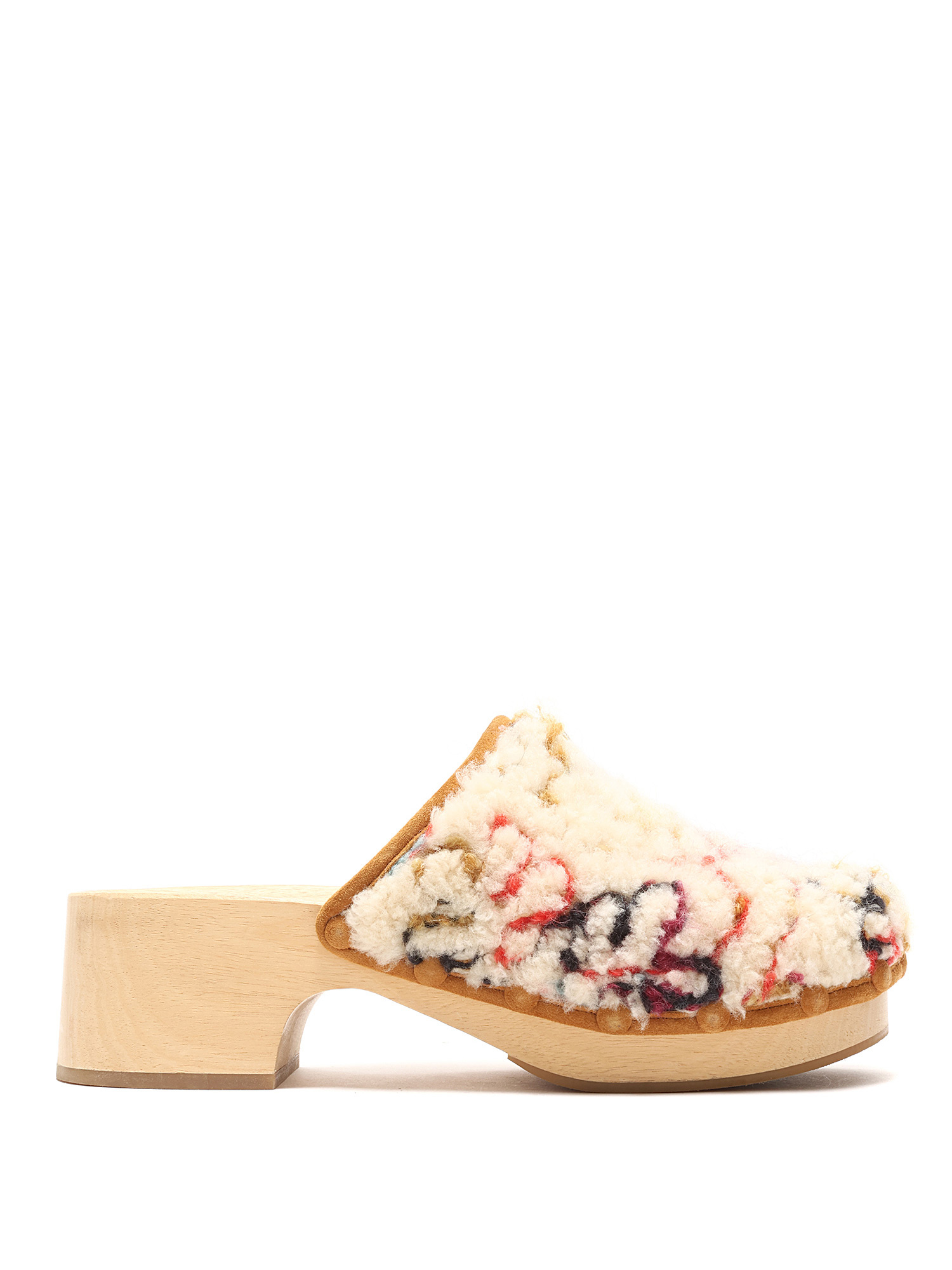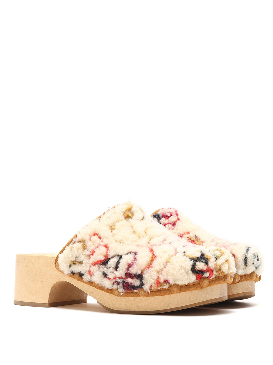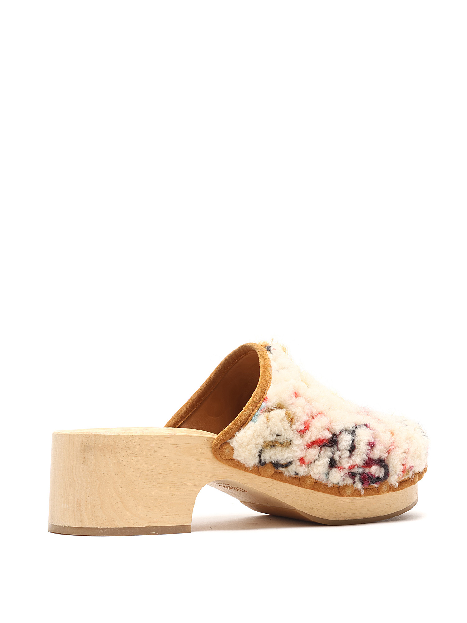 Sabots en shearling avec motif abstrait coloré. Style à enfiler avec bout rond fermé et semelle en cuir.