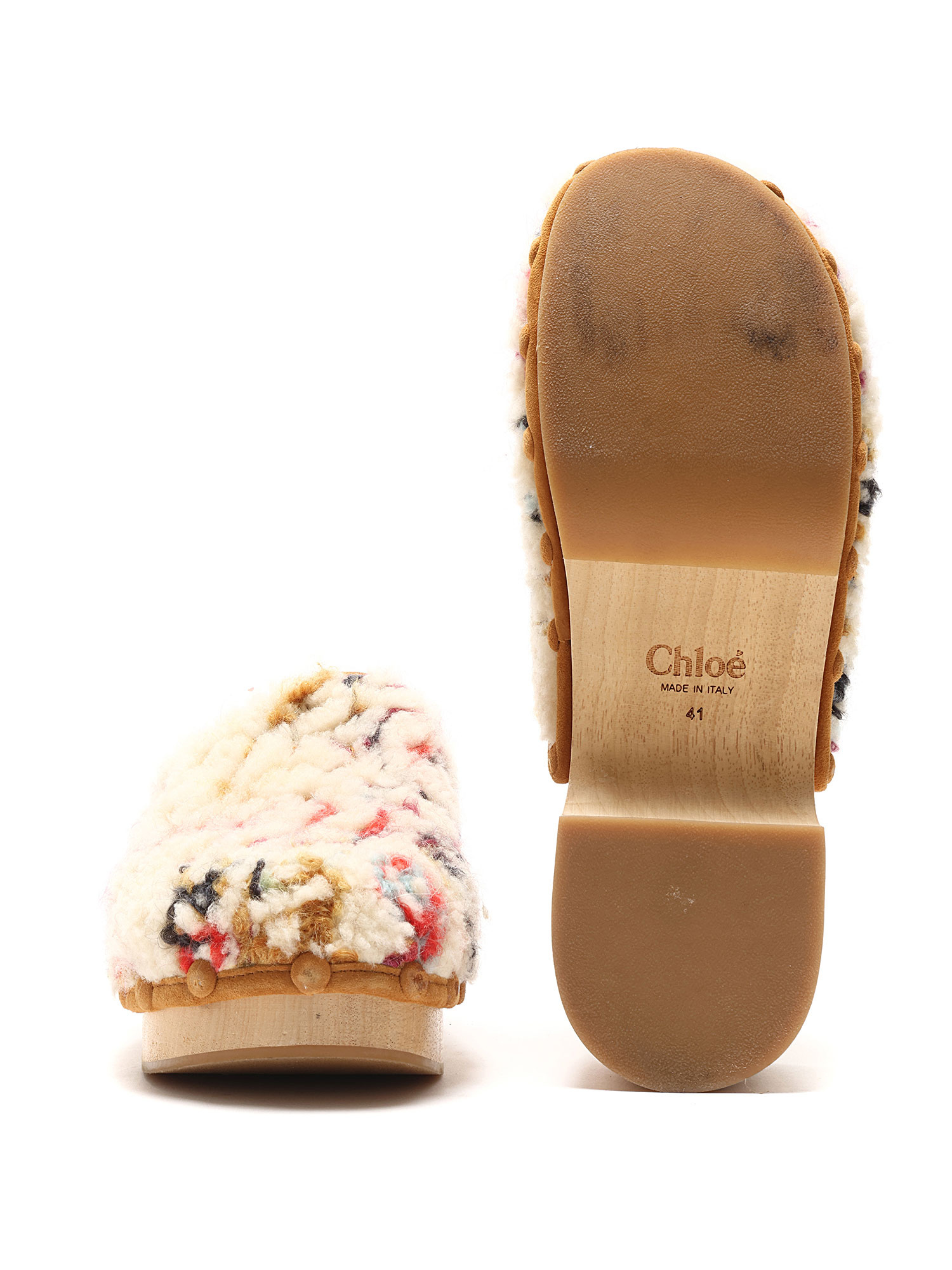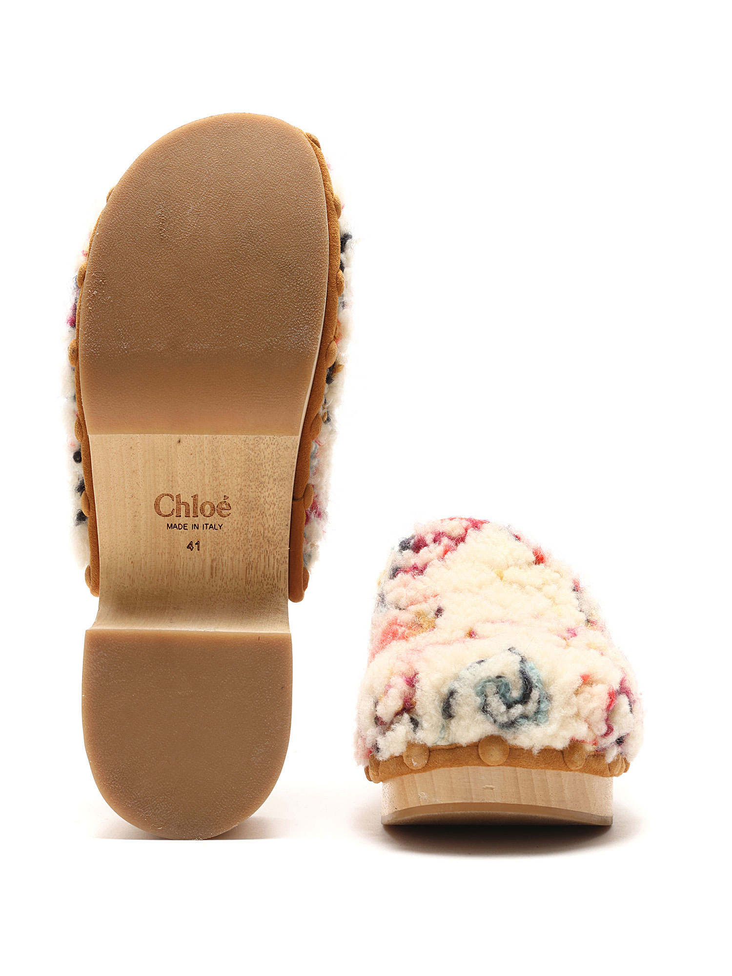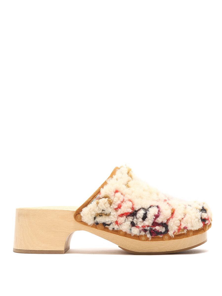 Sabots en shearling avec motif abstrait coloré. Style à enfiler avec bout rond fermé et semelle en cuir.