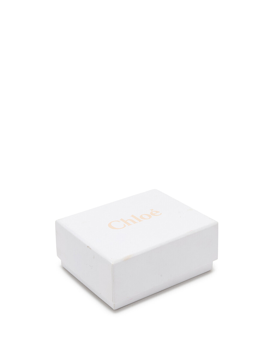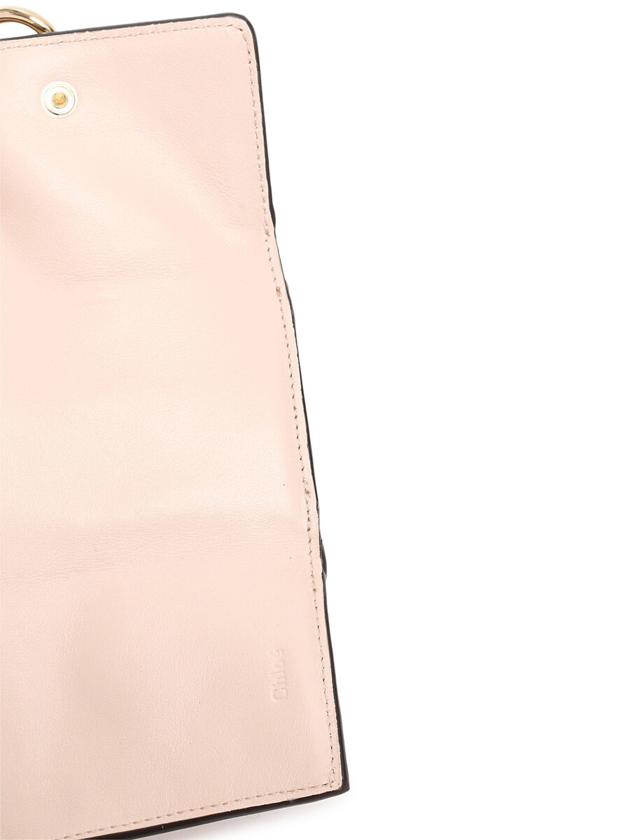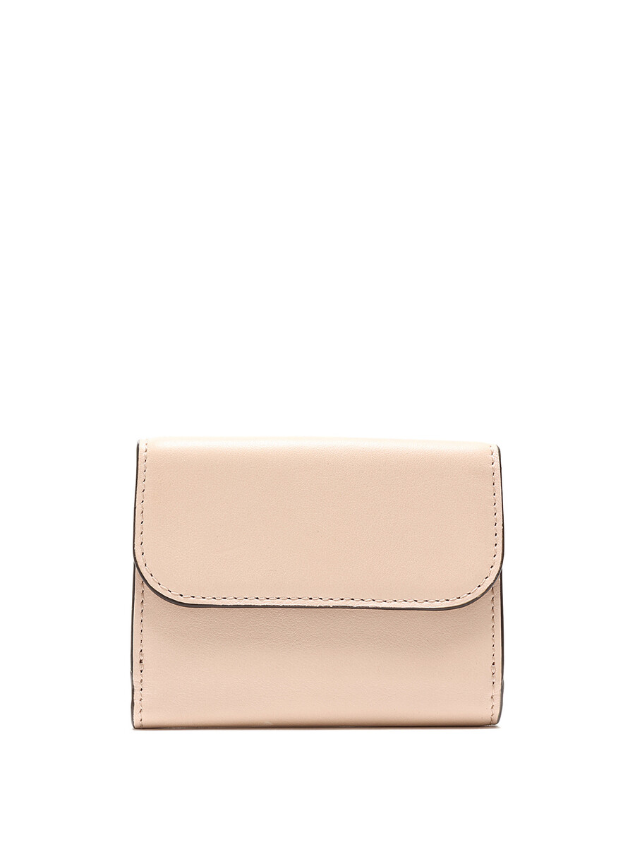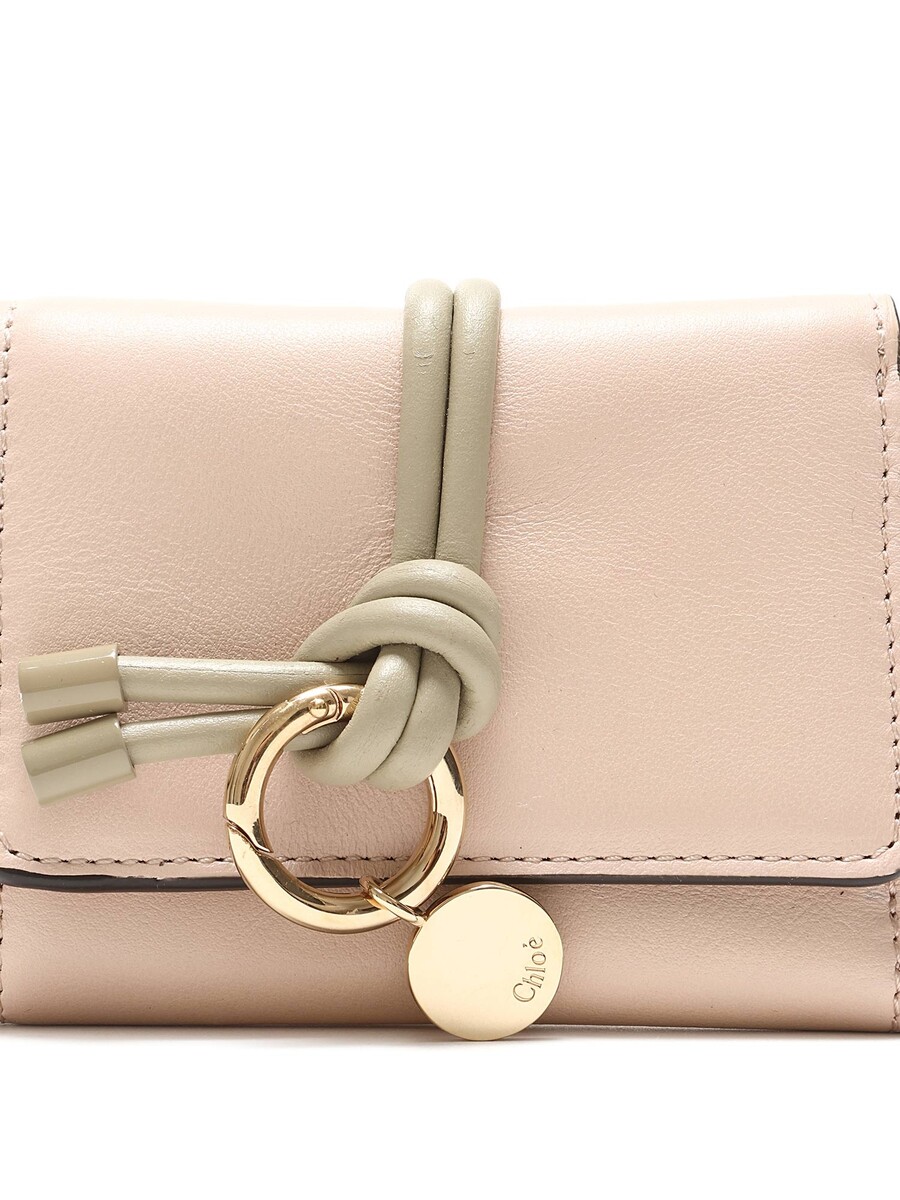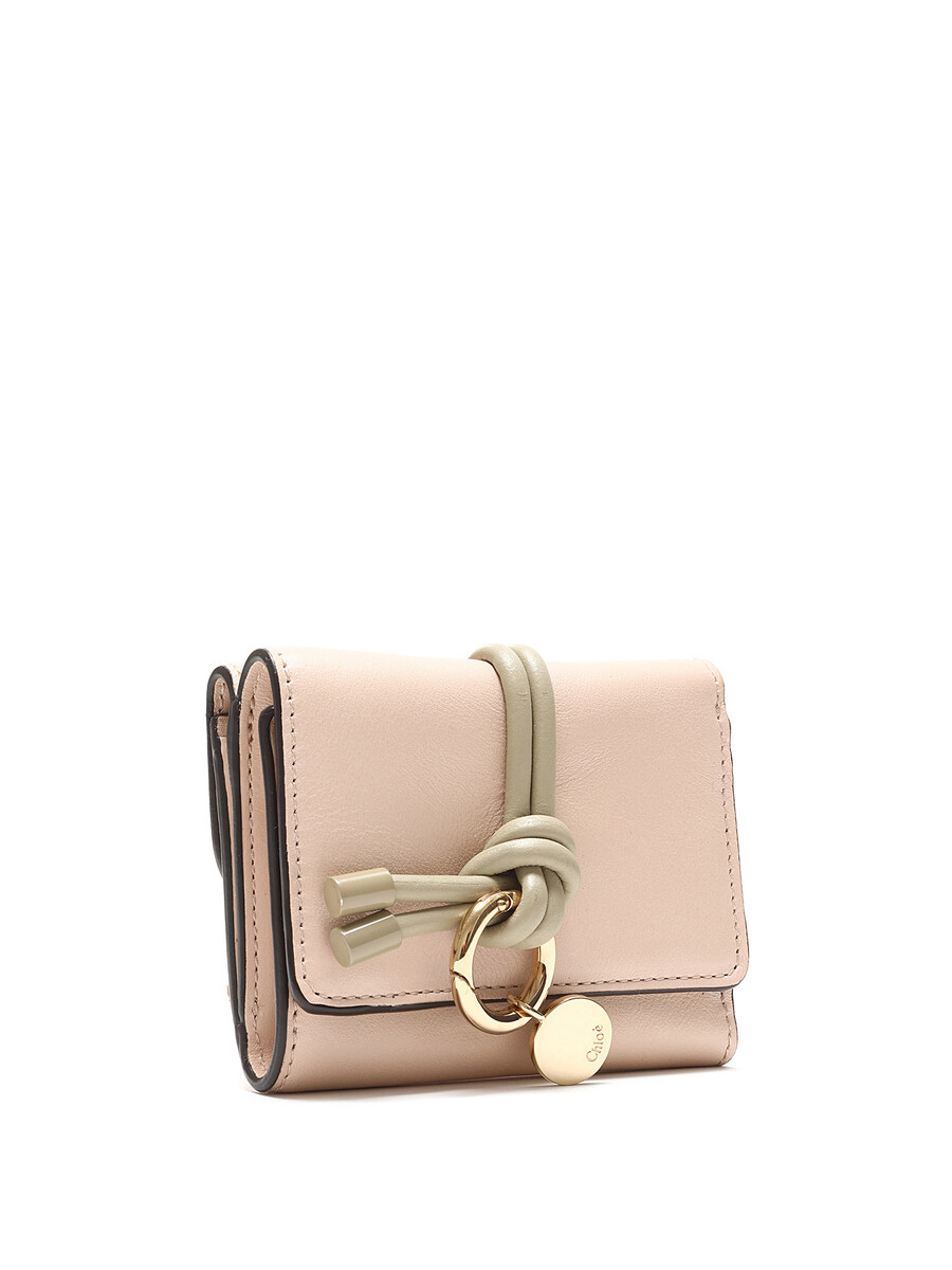 Mini portefeuille en cuir de veau beige clair. Détail de nœud en cuir avec une quincaillerie dorée en anneau. Fermeture à bouton-pression.