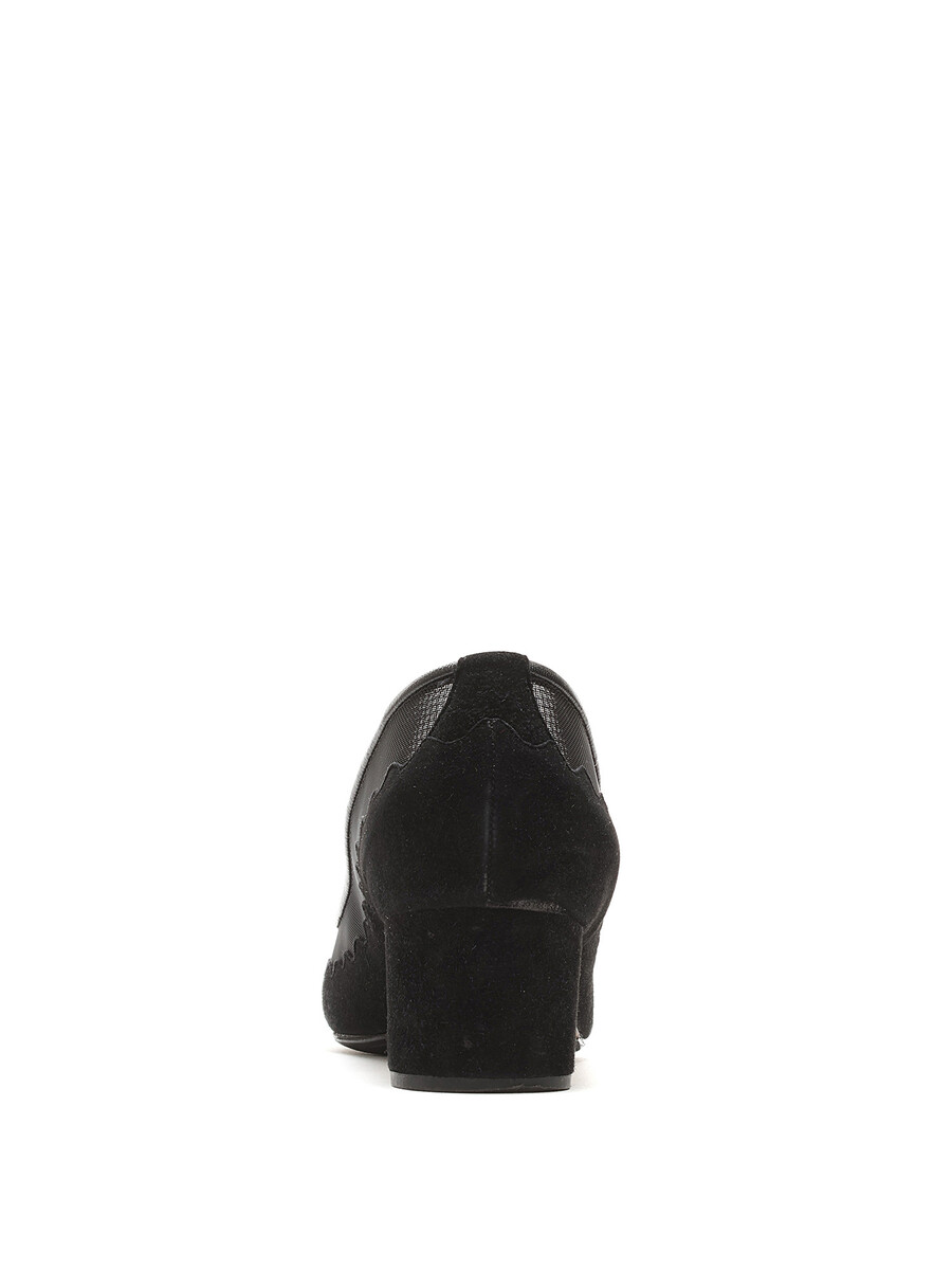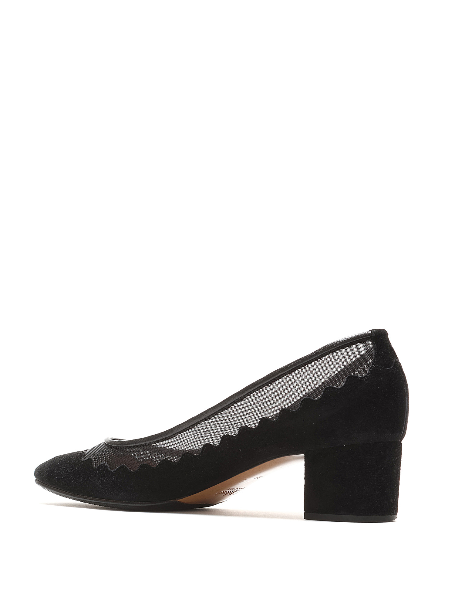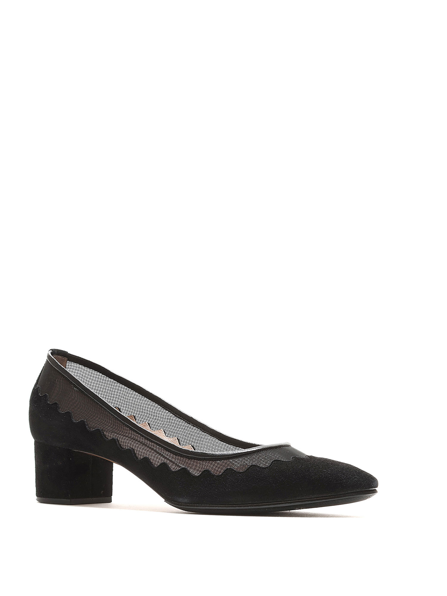 Ballerines en suède noir avec bords festonnés et détail en filet. Bout pointu. Style sans lacets. Semelle en cuir.