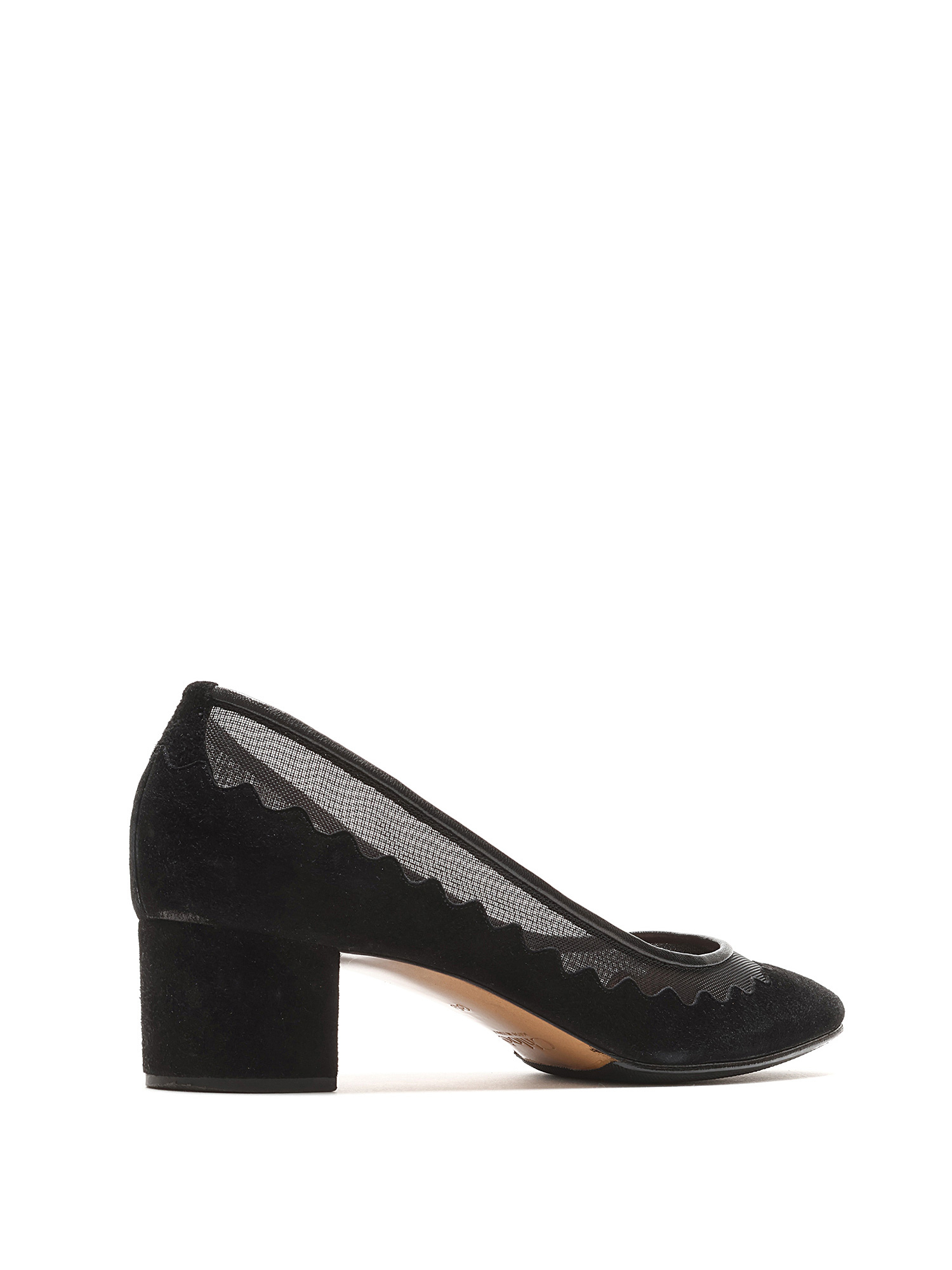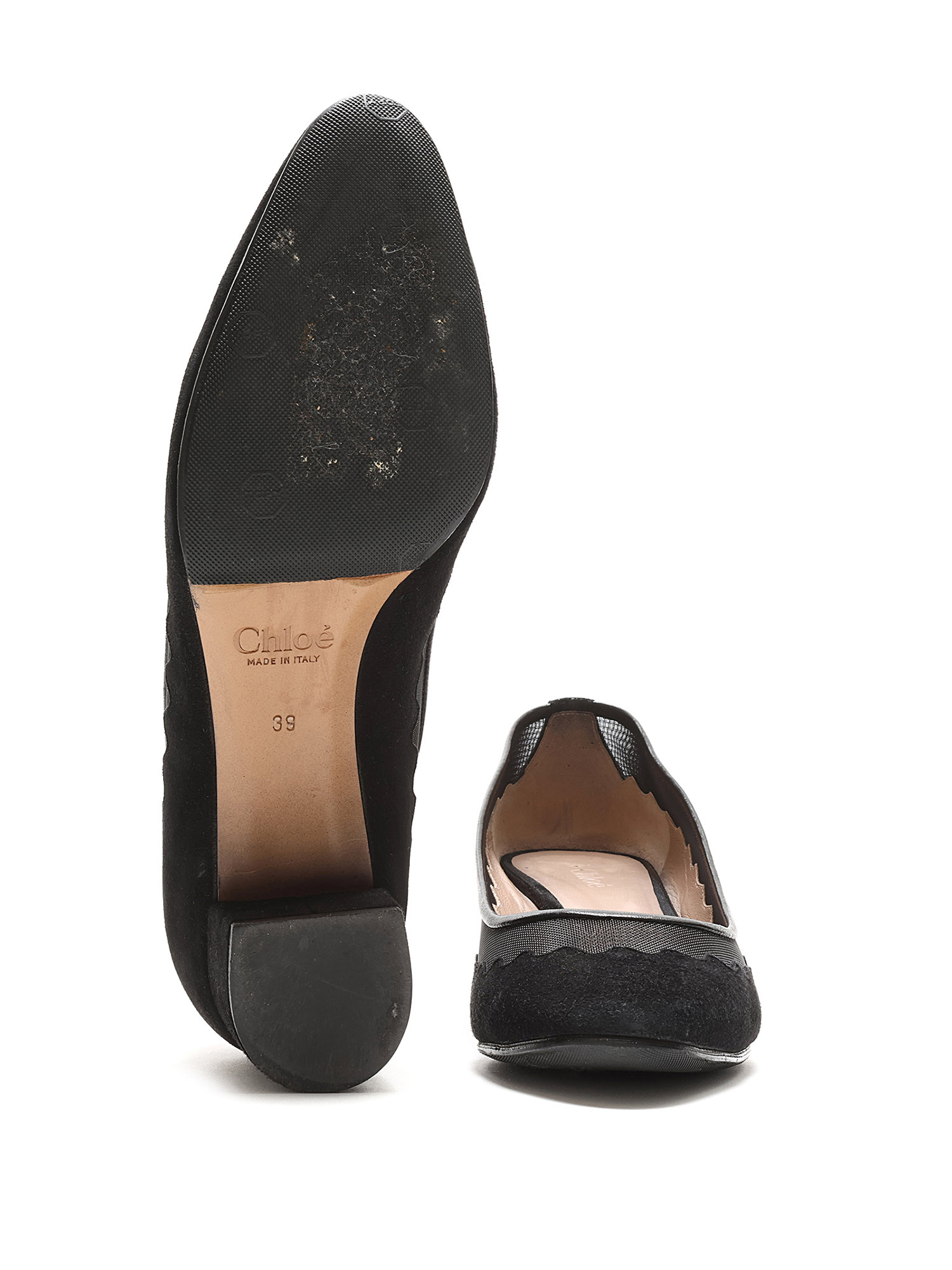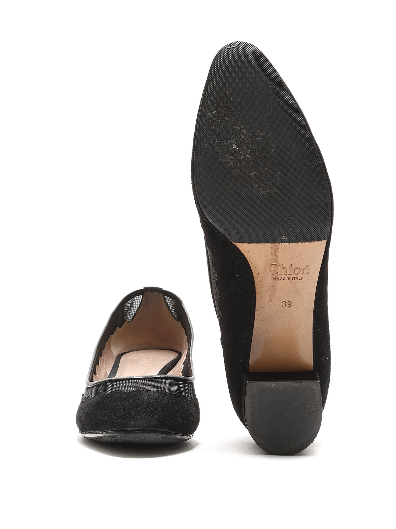 Ballerines en suède noir avec bords festonnés et détail en filet. Bout pointu. Style sans lacets. Semelle en cuir.