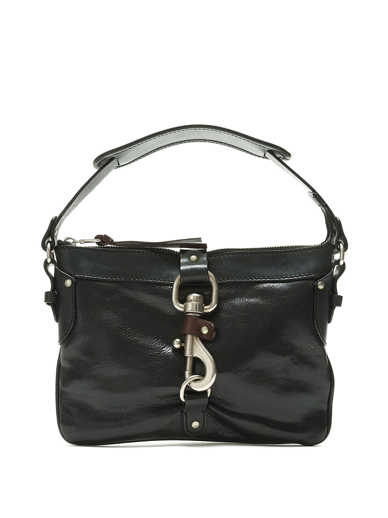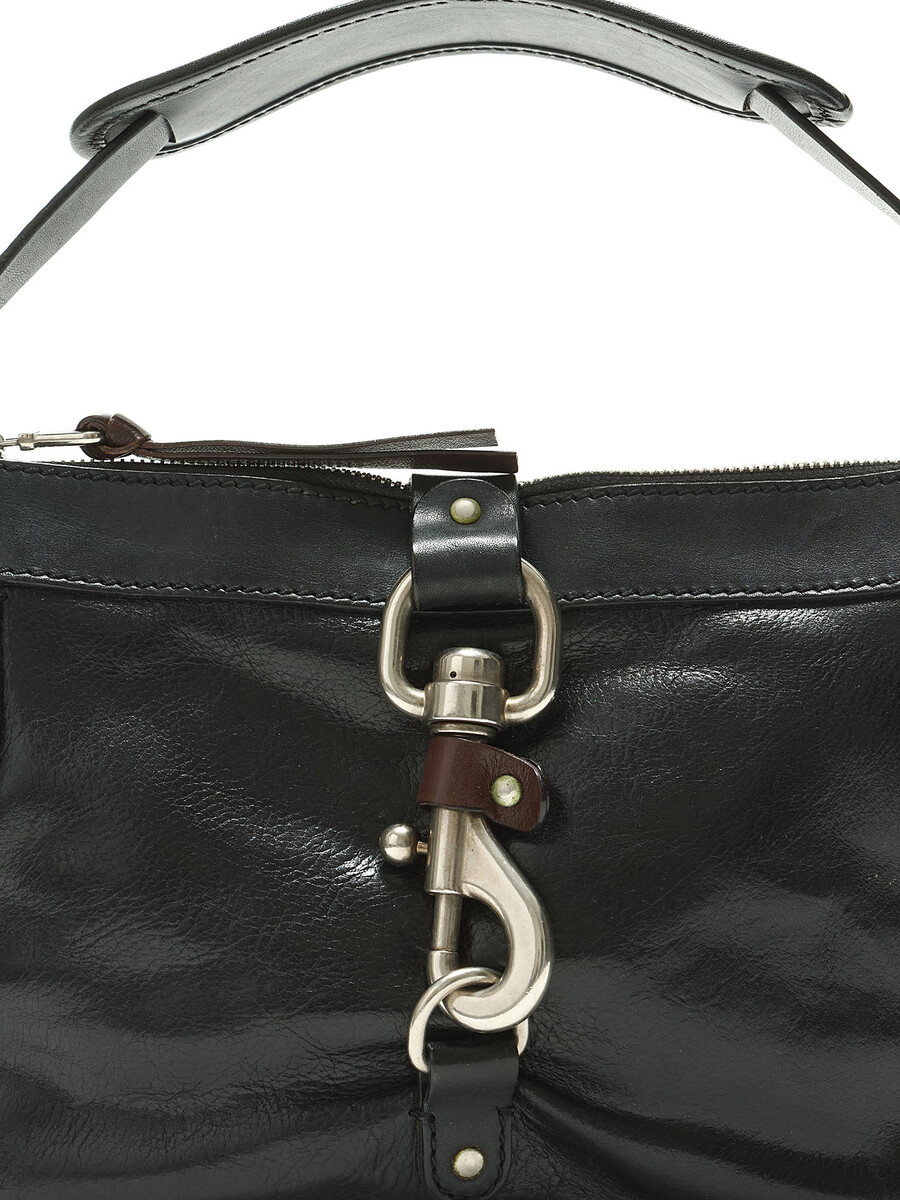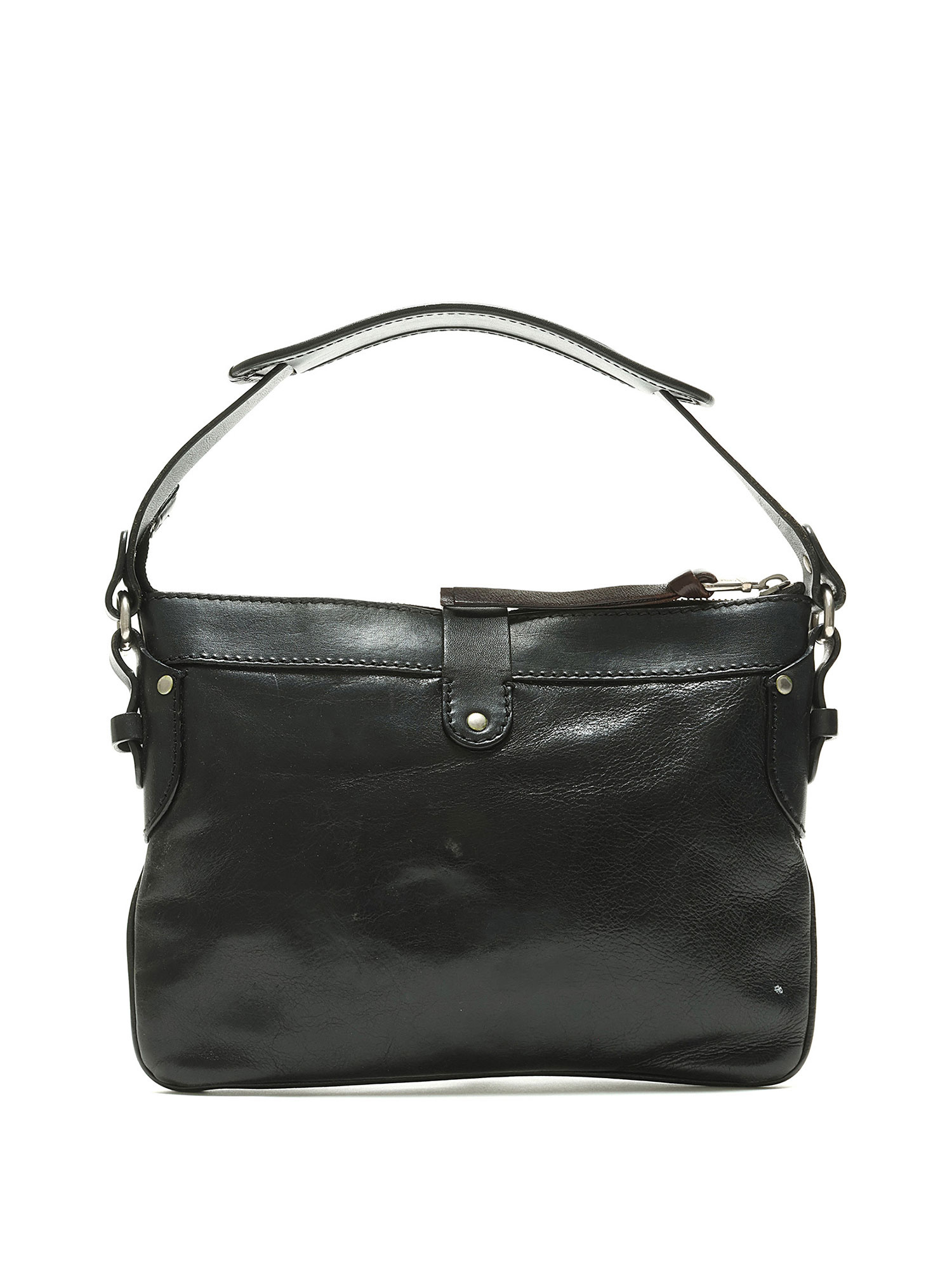 Sac à main en cuir noir avec quincaillerie argentée. Fermeture à crochet. Finitions en cuir brun foncé.