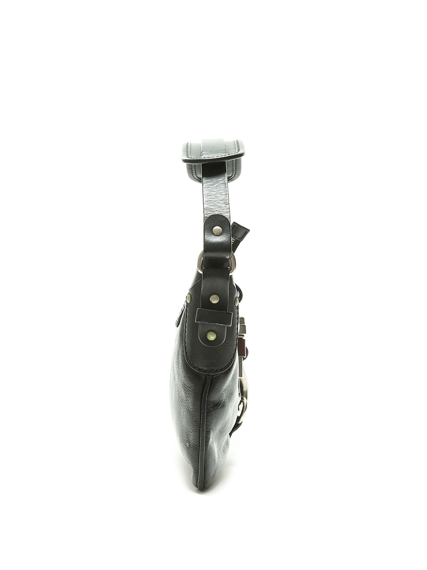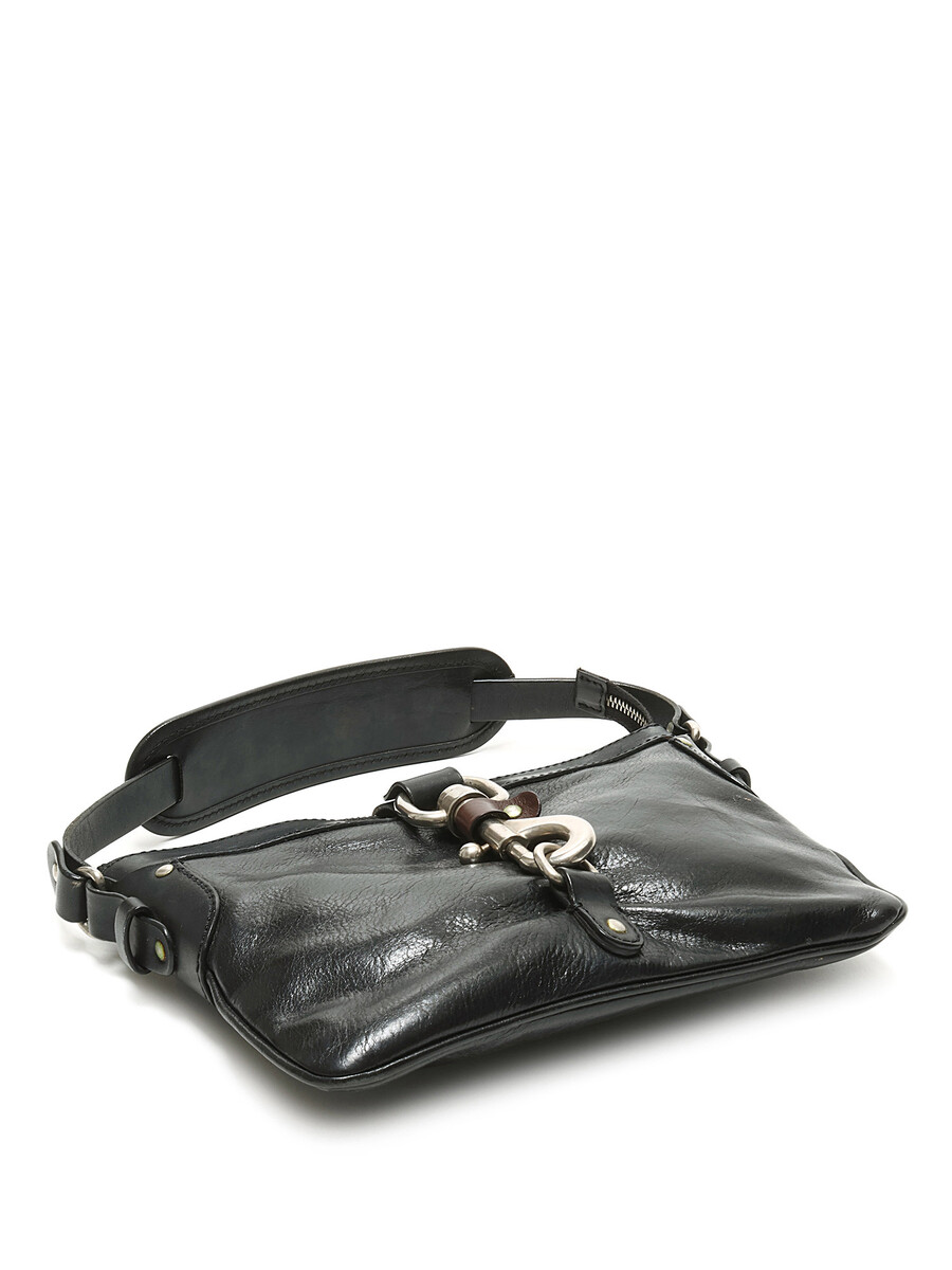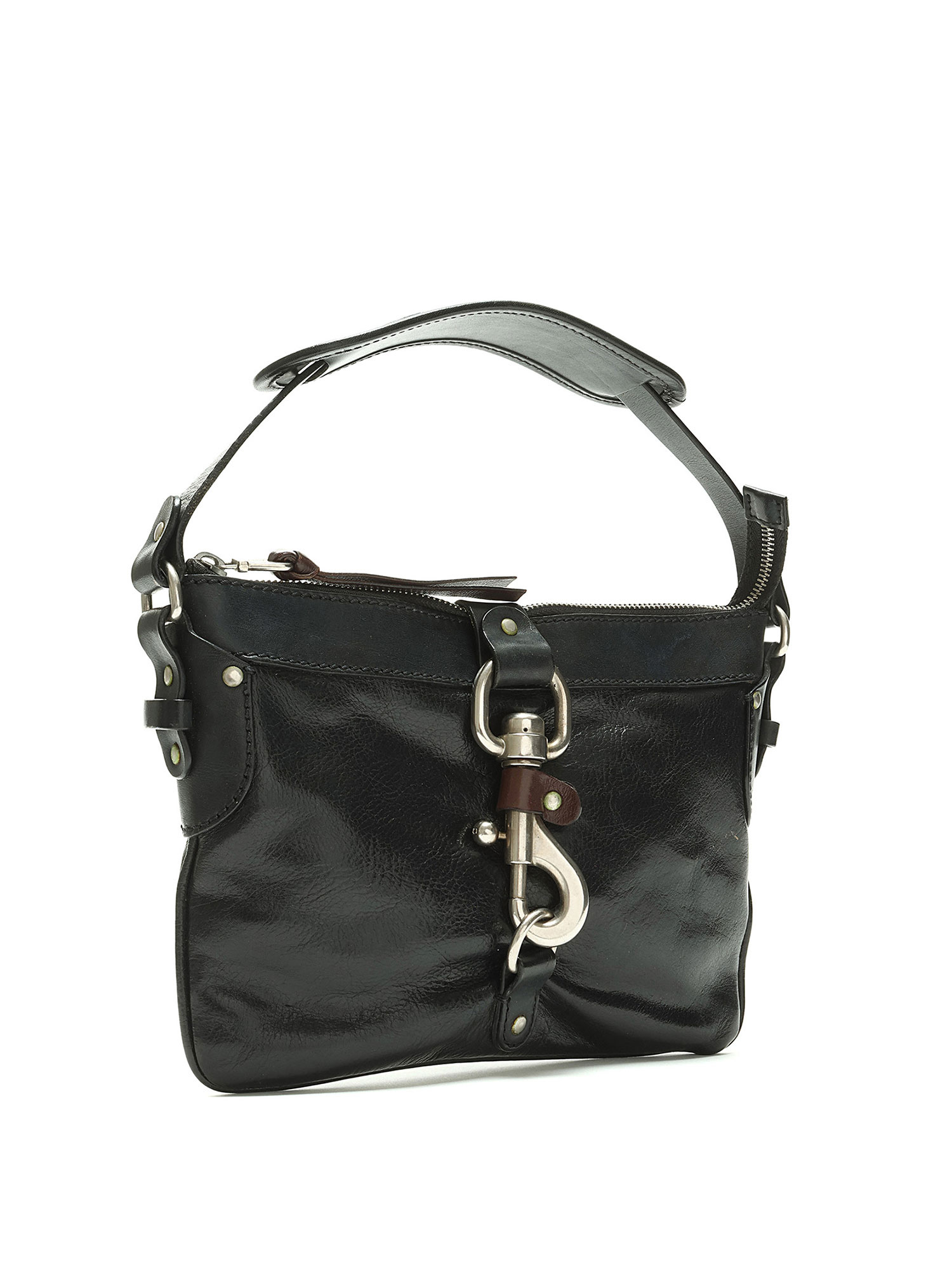 Sac à main en cuir noir avec quincaillerie argentée. Fermeture à crochet. Finitions en cuir brun foncé.