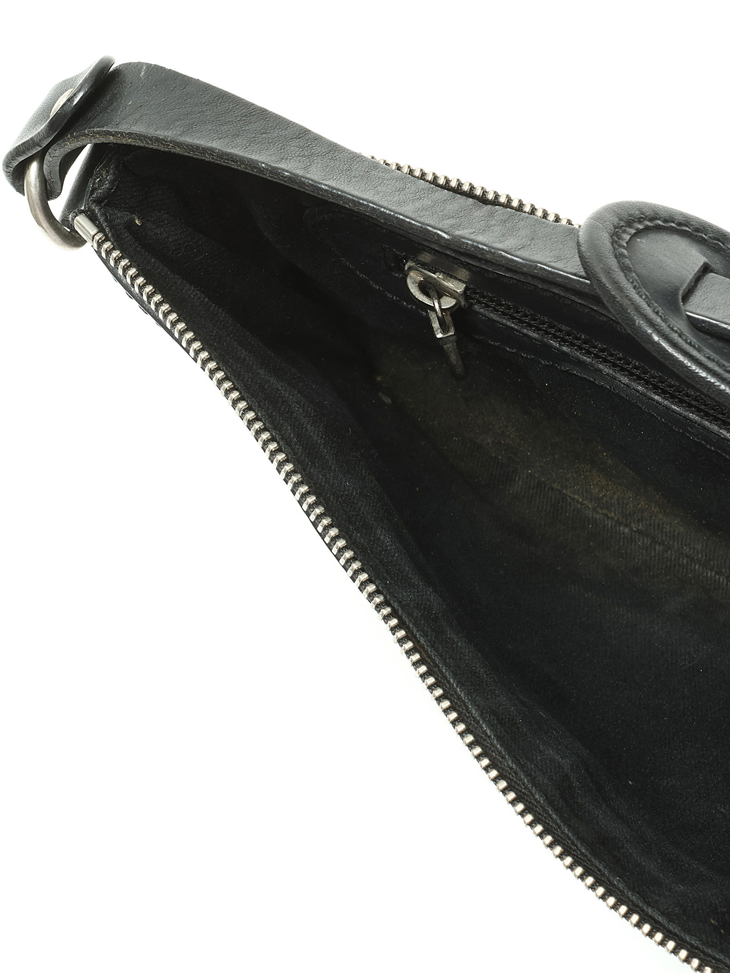 Signes d'usure aux coins. Plis et taches au cuir. Égratignures et oxydation aux ferrures. Bandoulière brisée. Signes d'usure à la doublure.