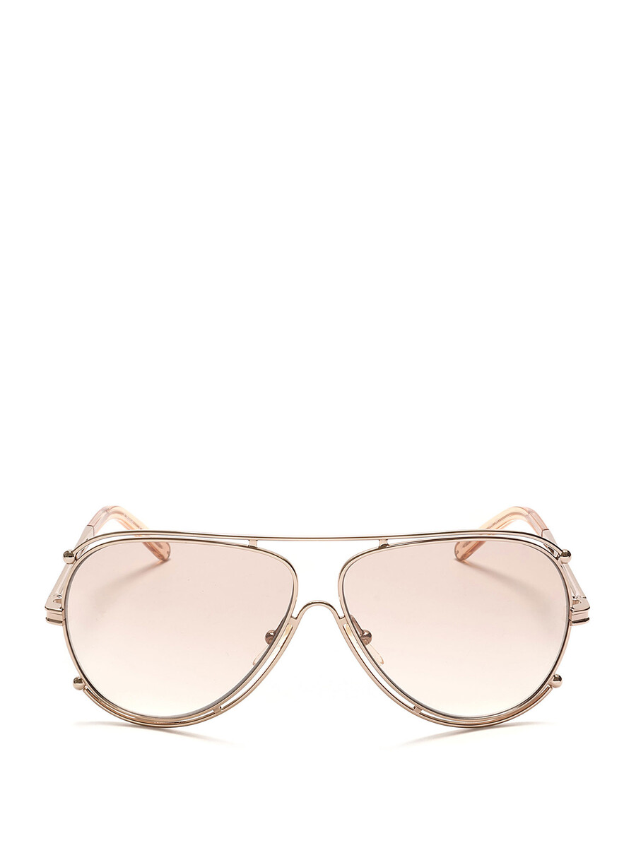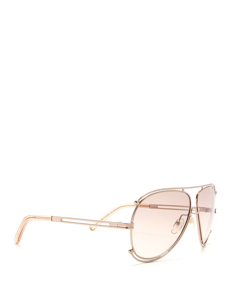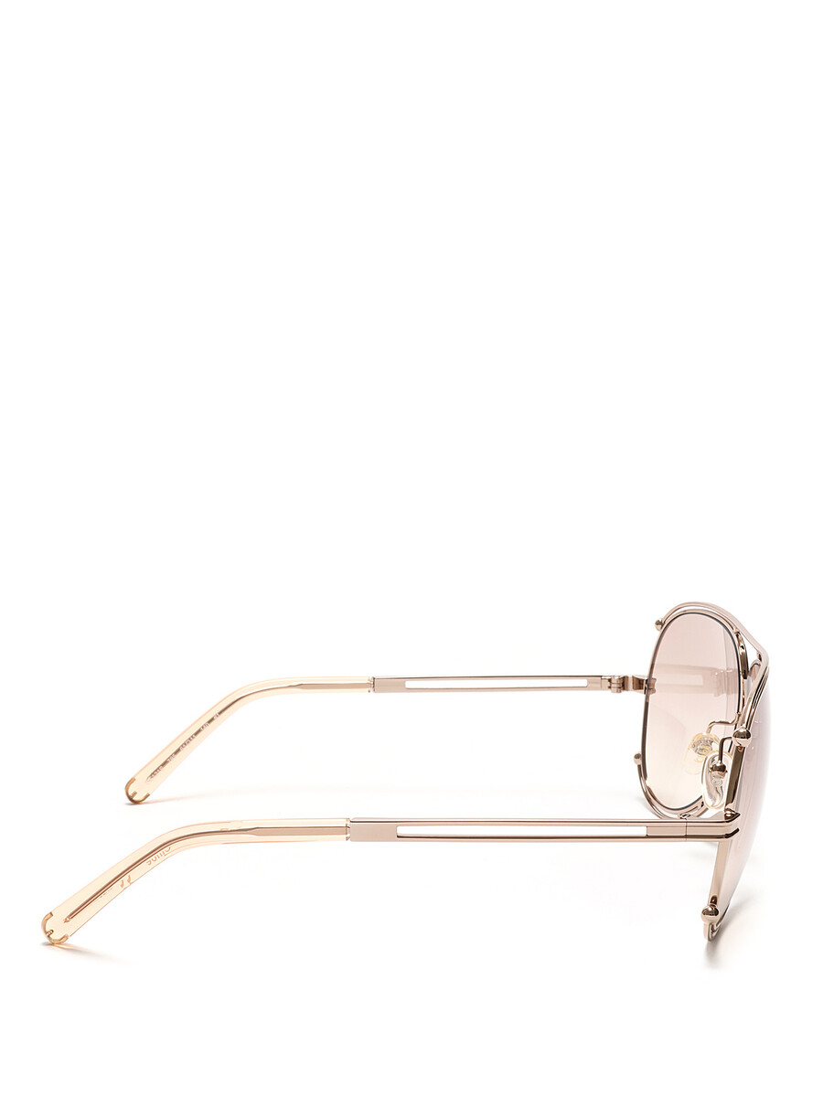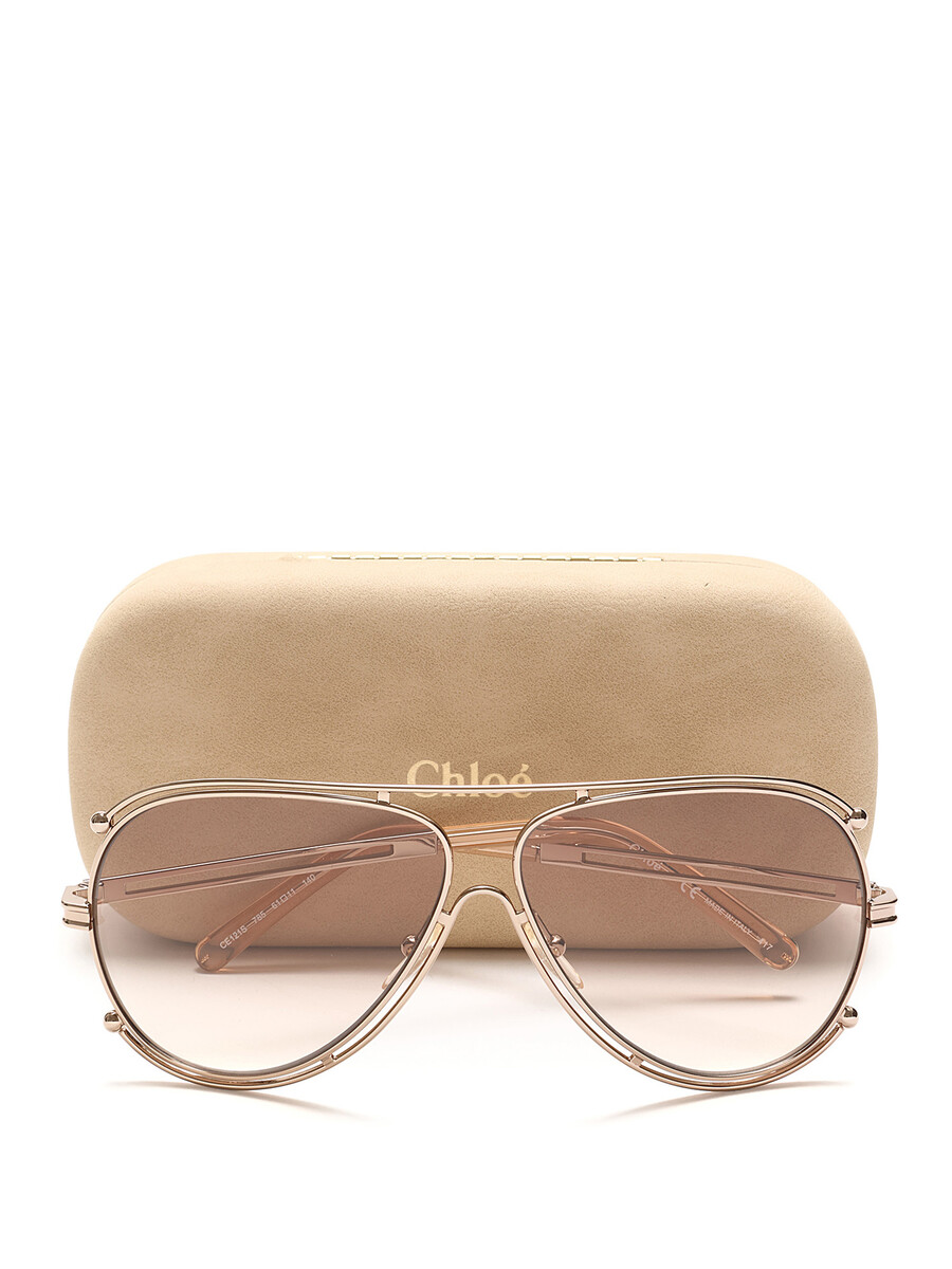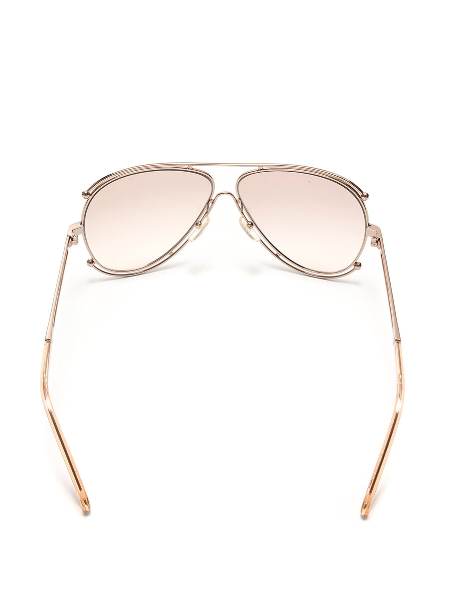 Lunettes de soleil aviateur avec monture en métal doré et verres marron dégradé. Forme pilote classique avec plaquettes de nez ajustables. Avec étui de marque.