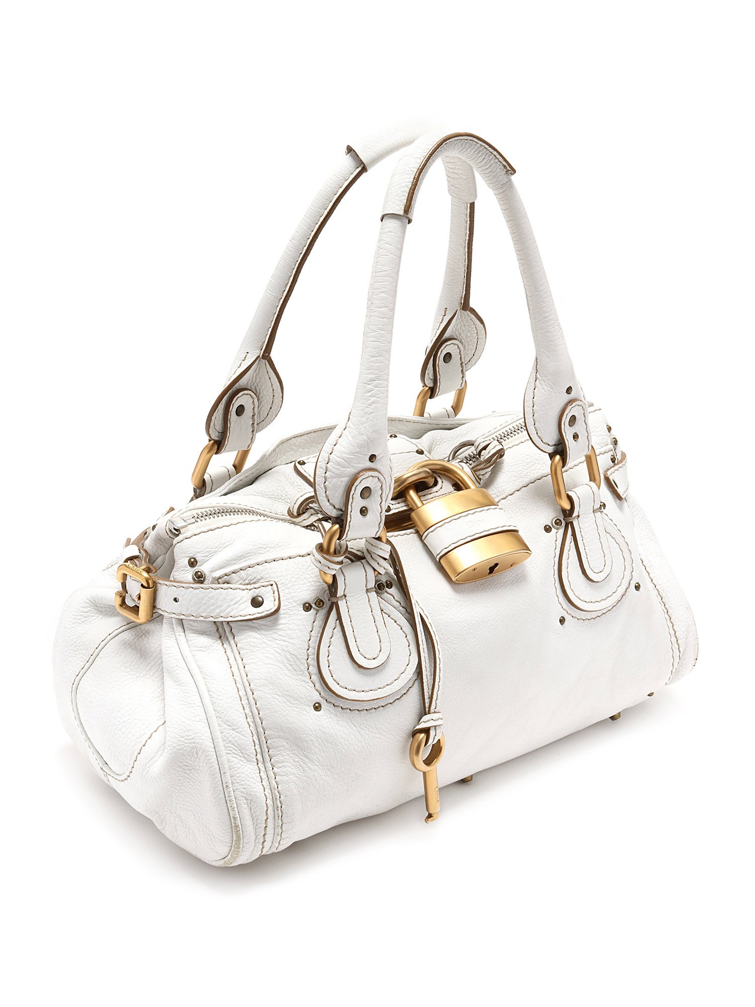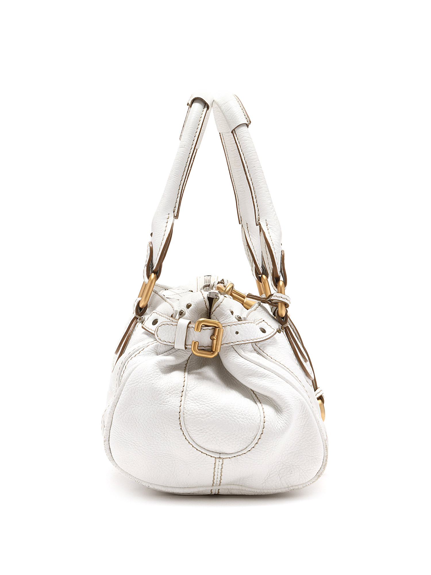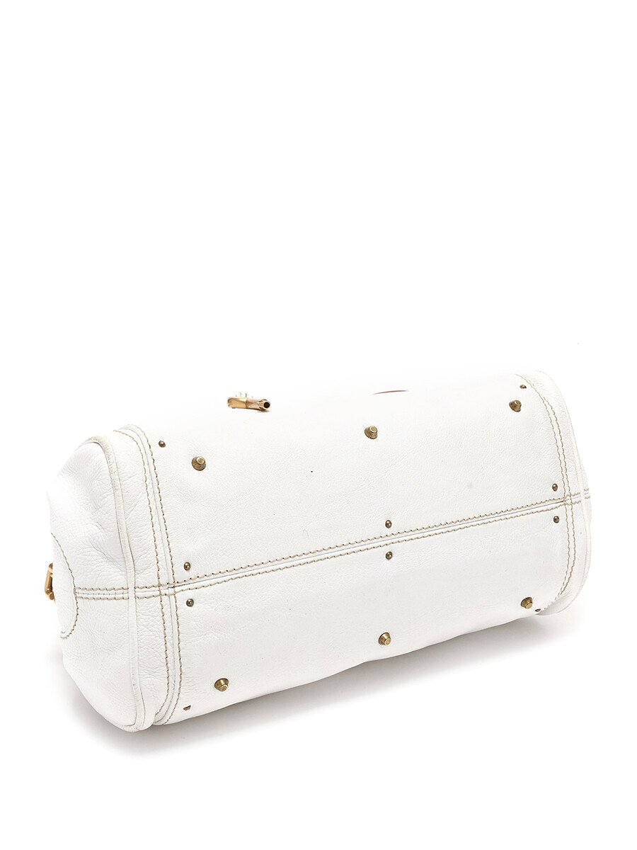 Sac à l'épaule en cuir grainé blanc avec fermeture à cadenas. Deux poignées en cuir roulé. Garnitures en cuir. Ferrures dorées.