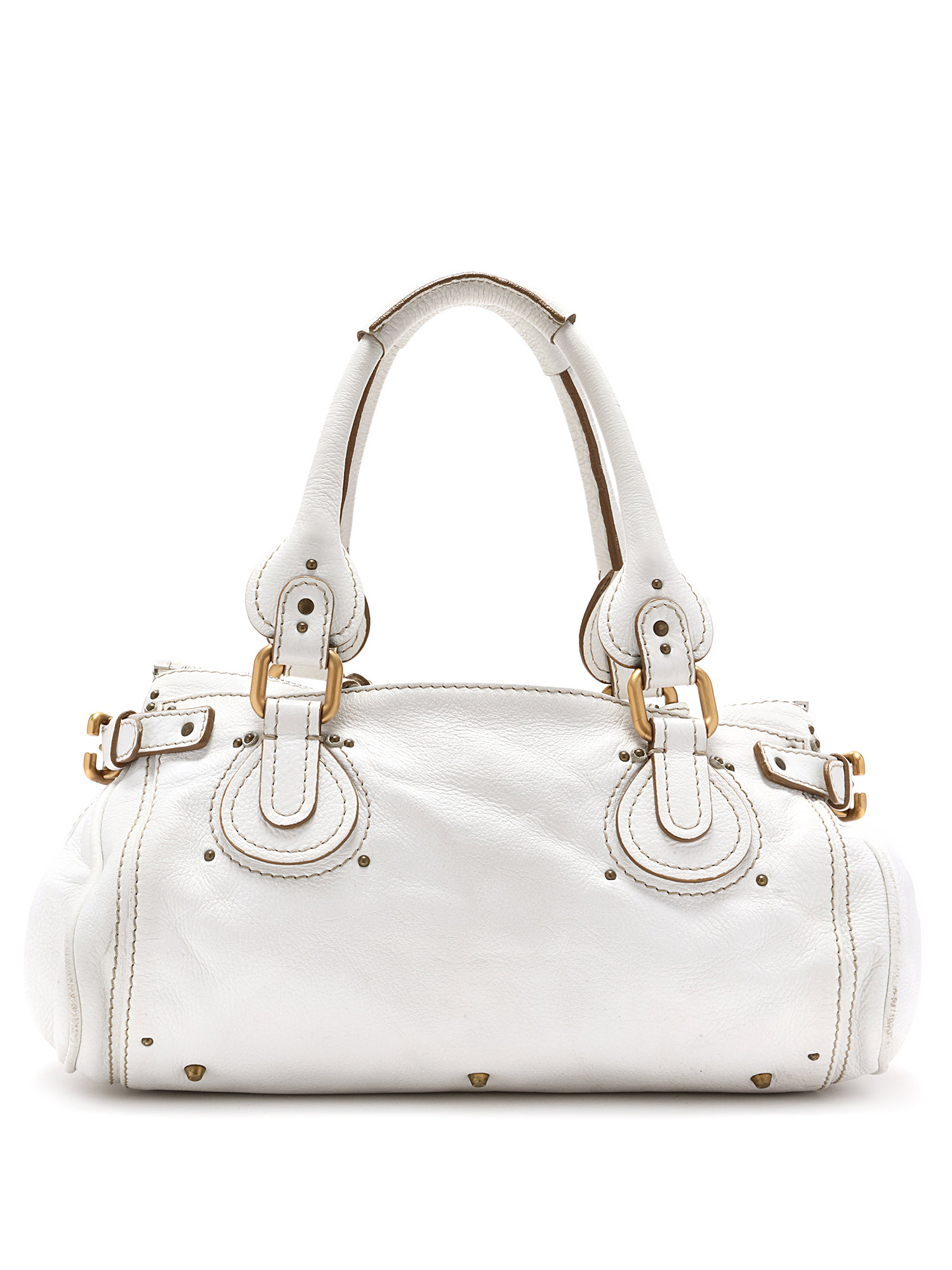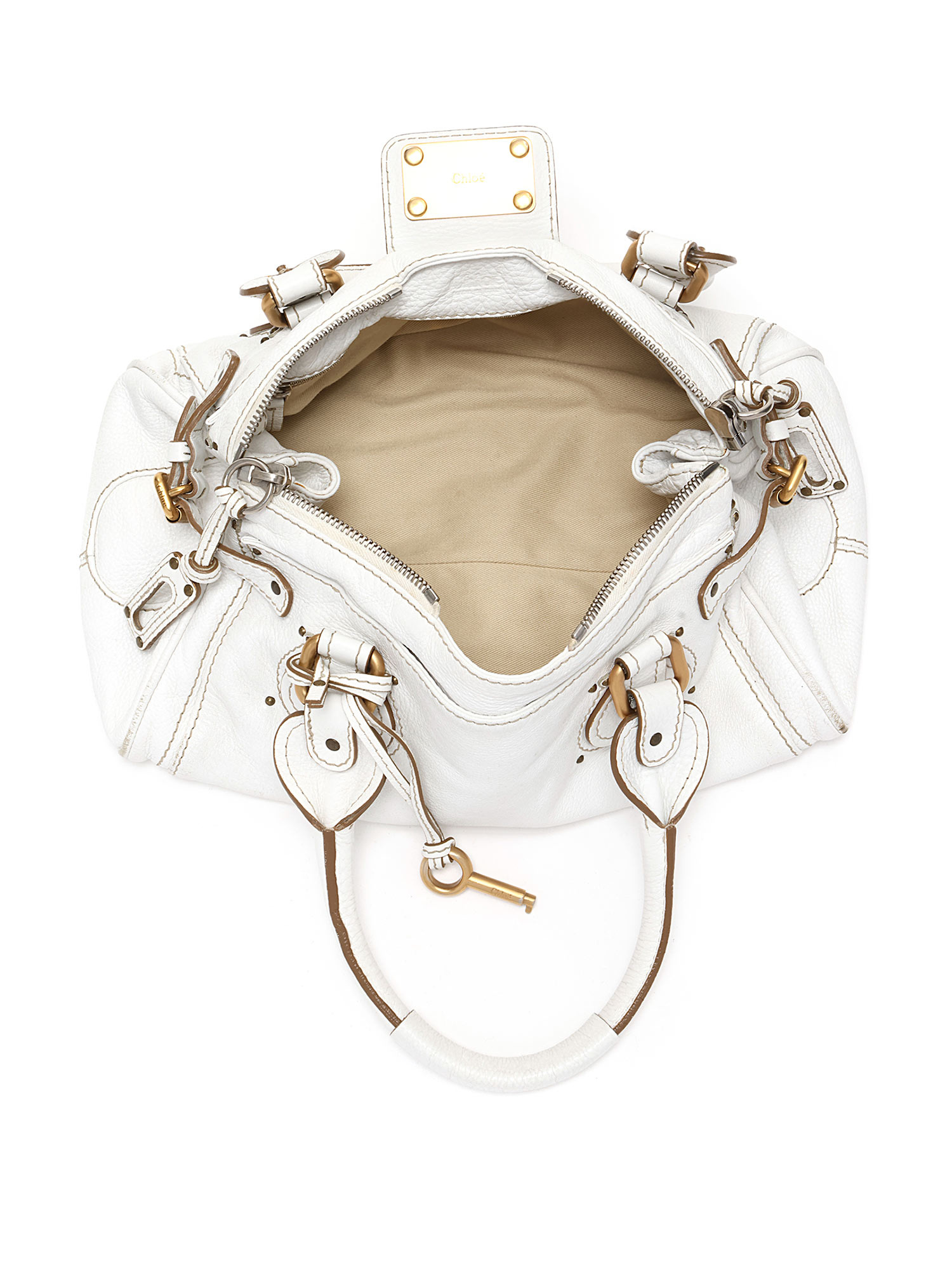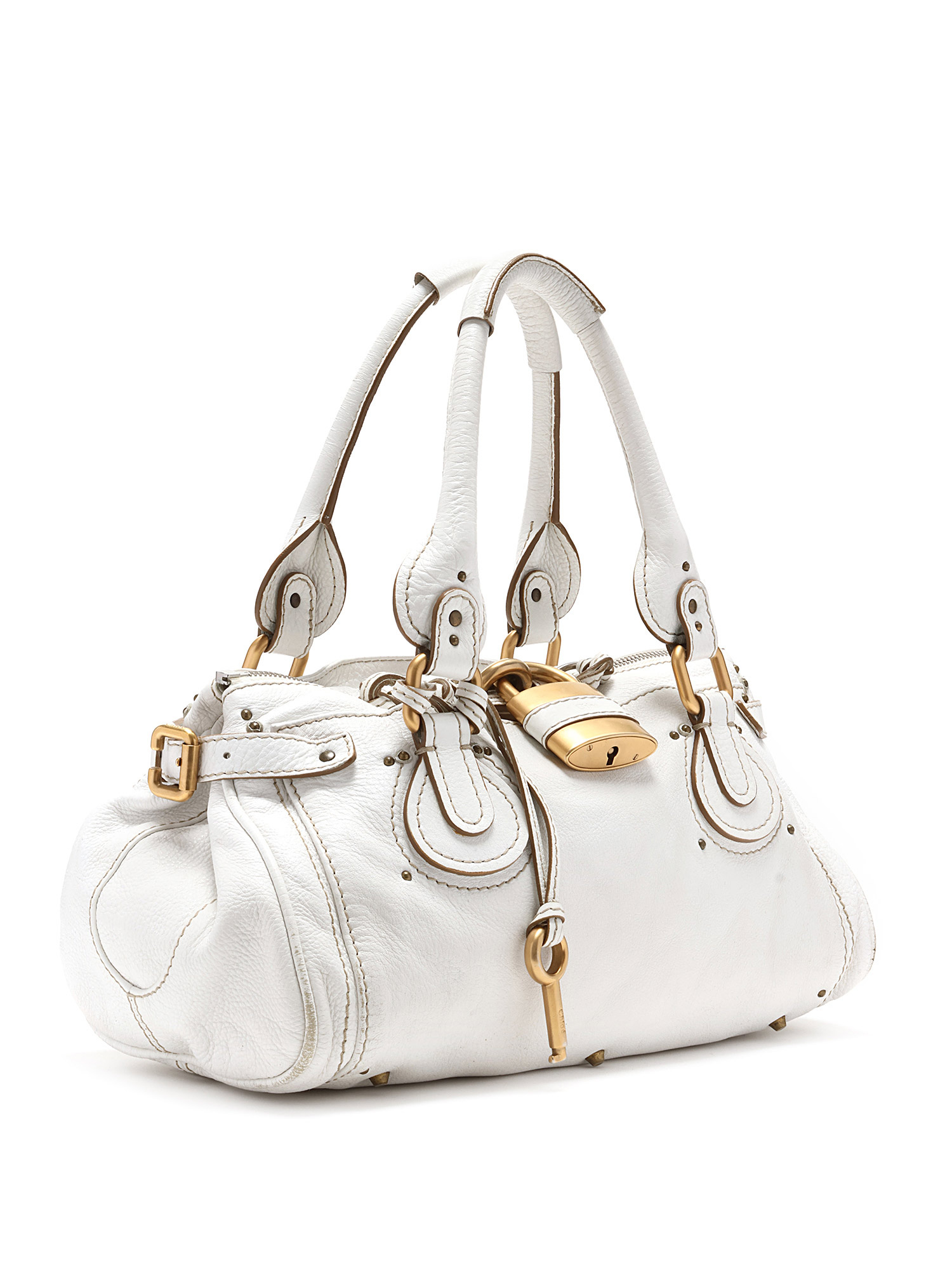 Sac à l'épaule en cuir grainé blanc avec fermeture à cadenas. Deux poignées en cuir roulé. Garnitures en cuir. Ferrures dorées.