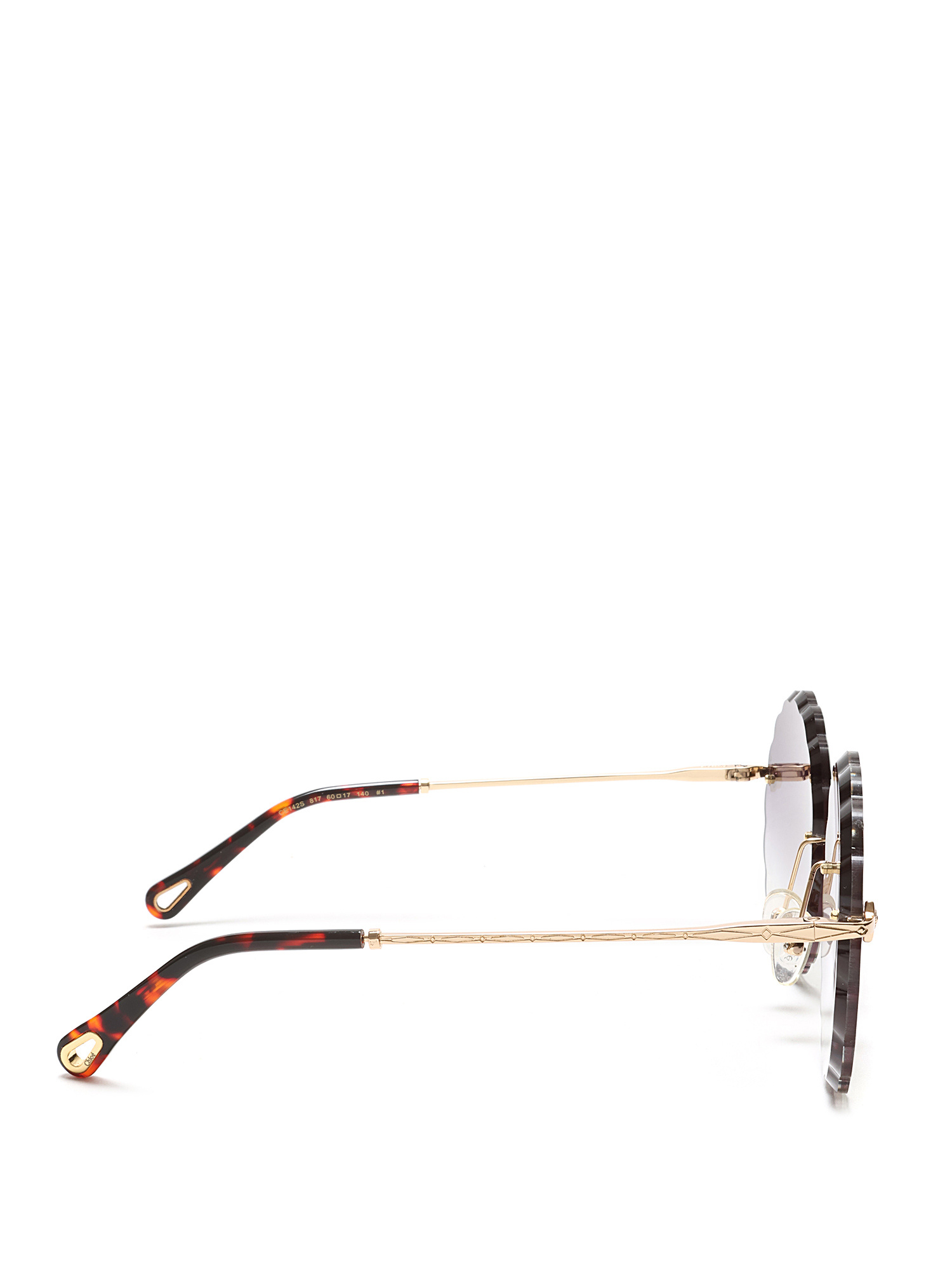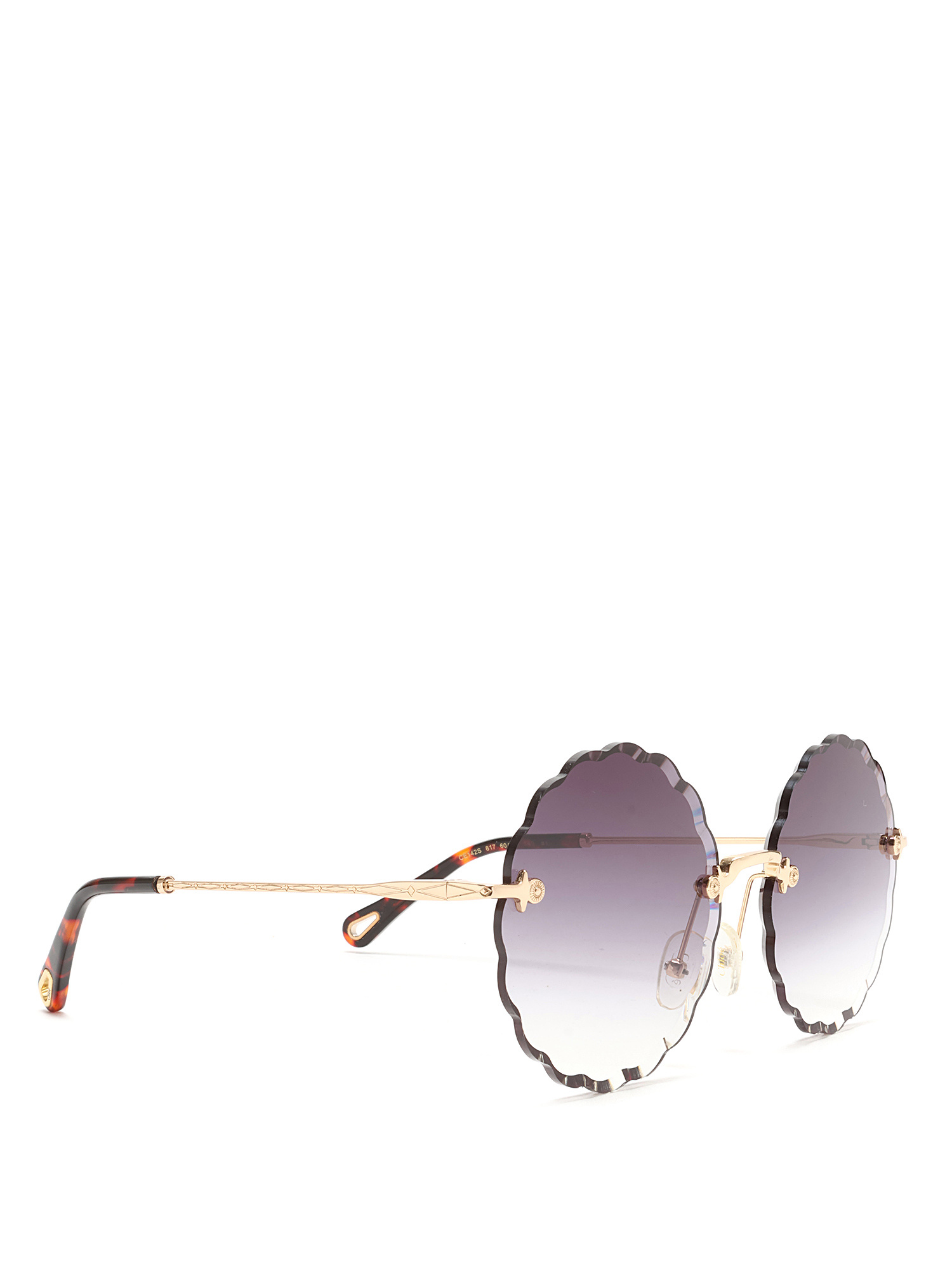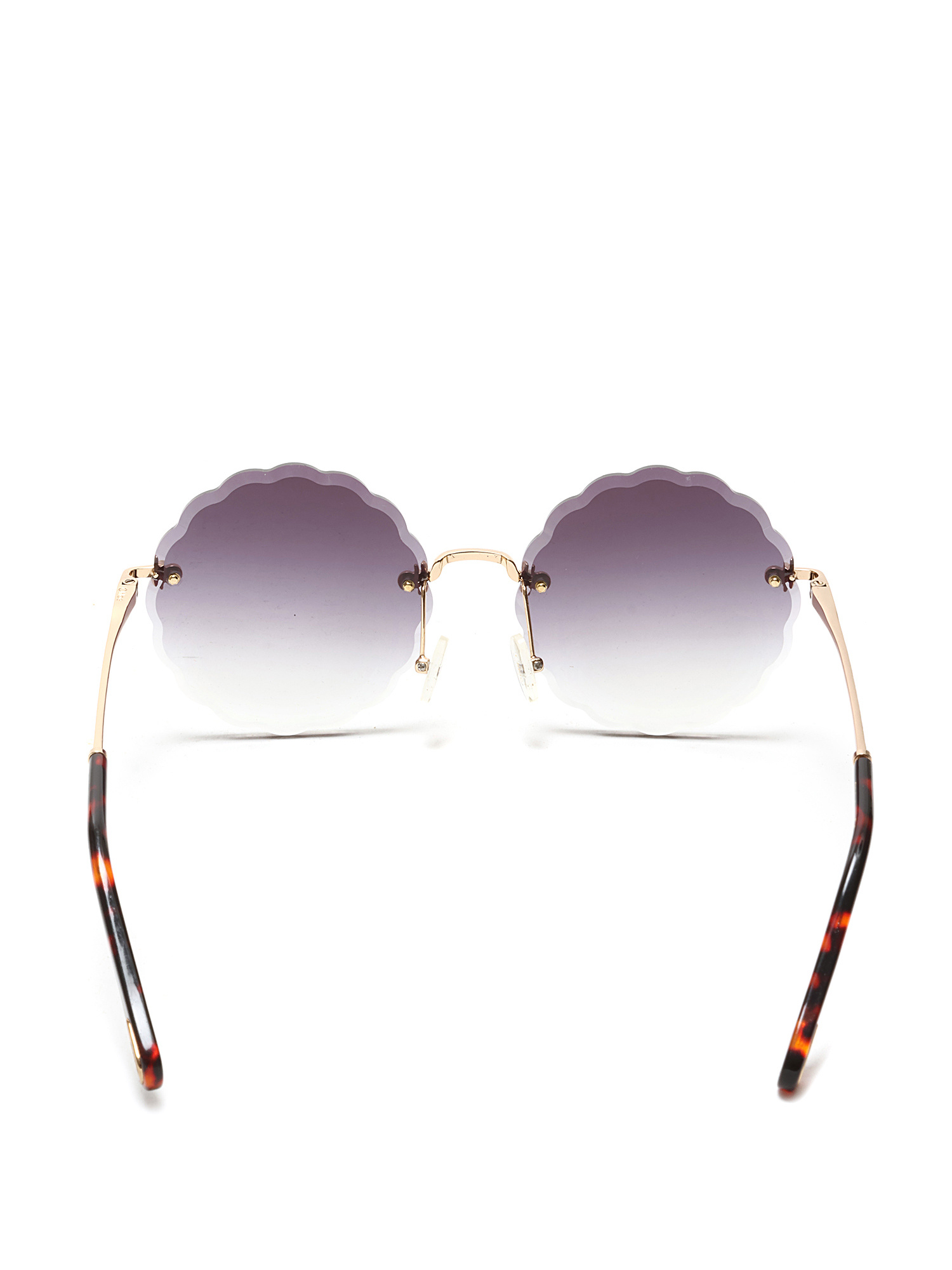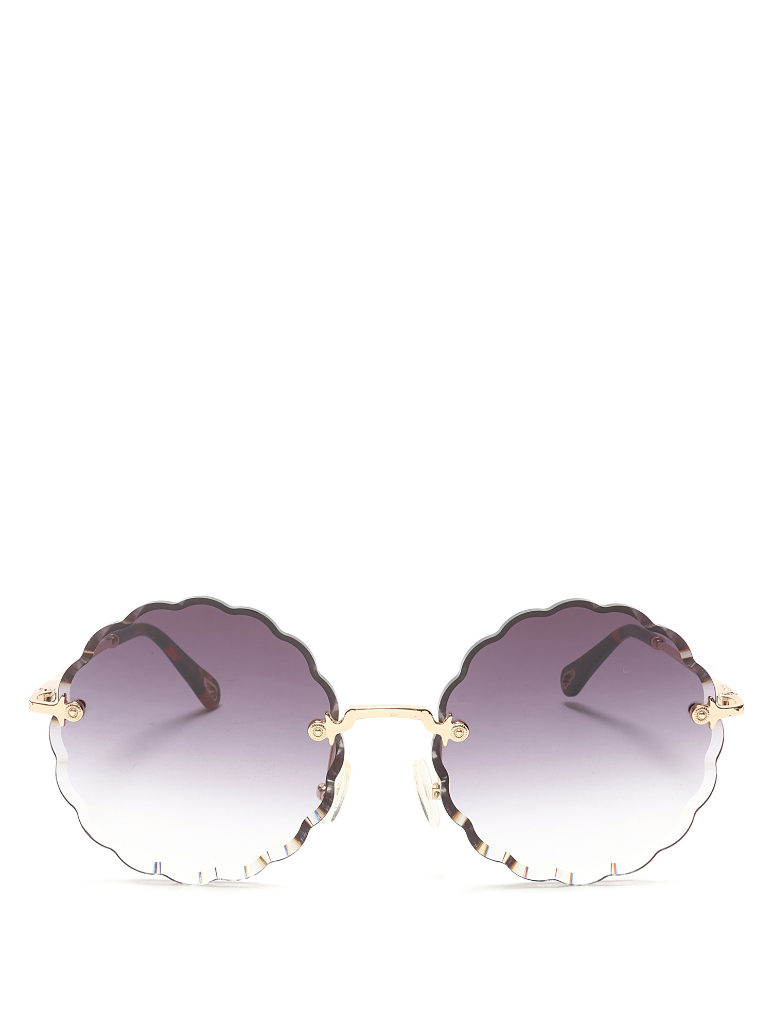 Lunettes de soleil rondes avec verres à bord festonné en violet. Monture en métal doré avec branches en écaille de tortue. Livrées avec un étui de marque.