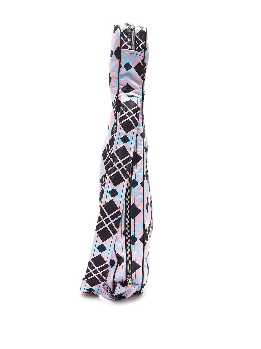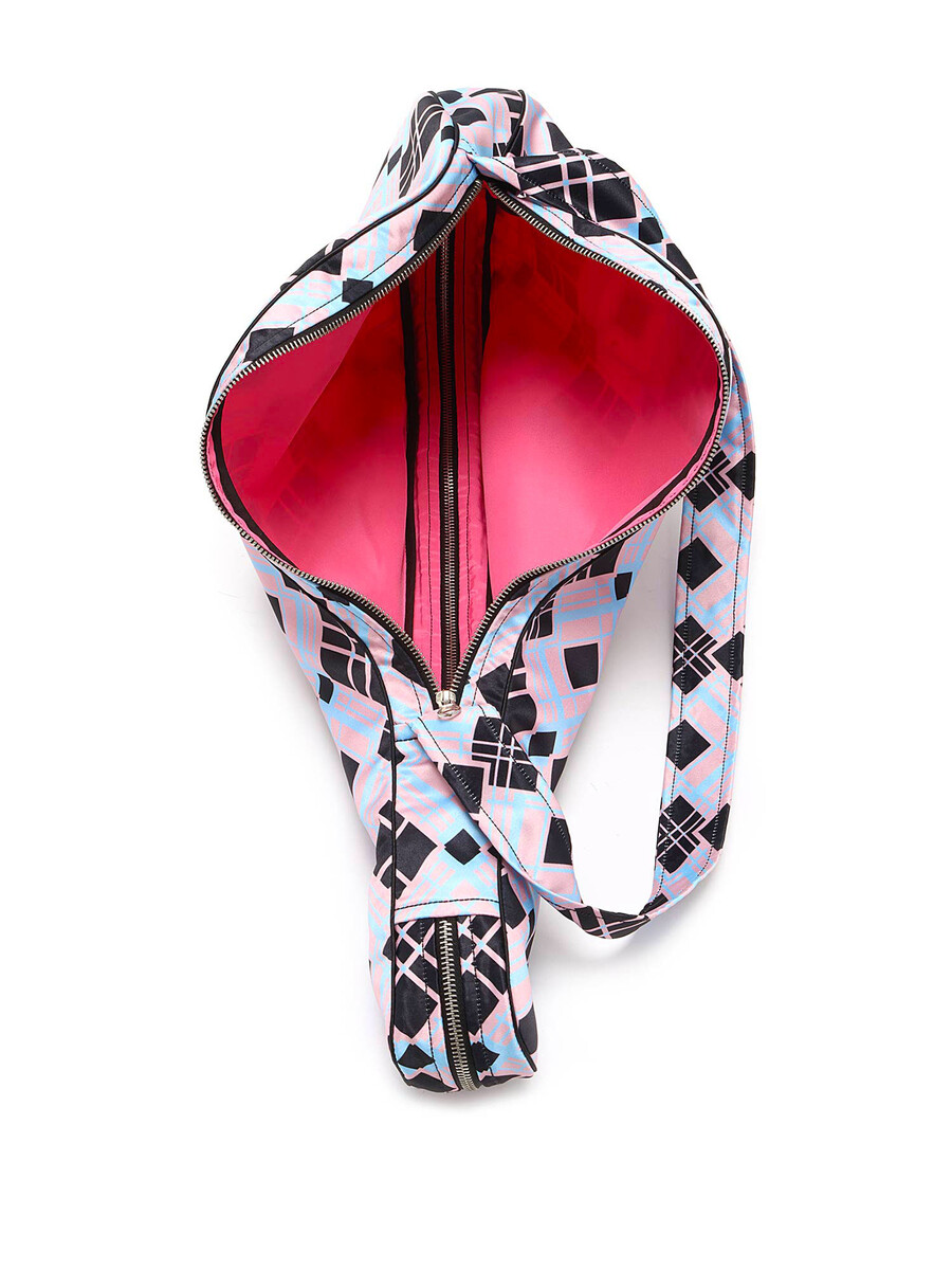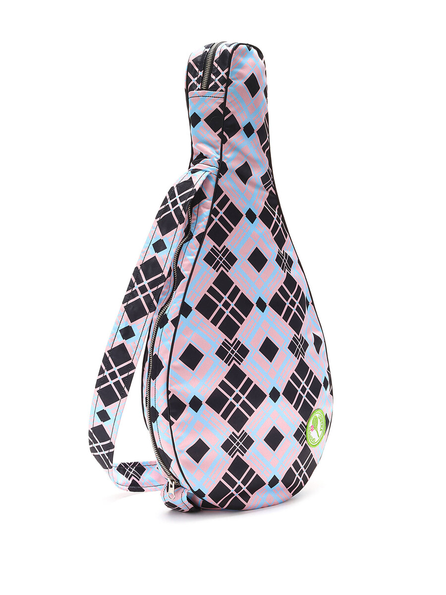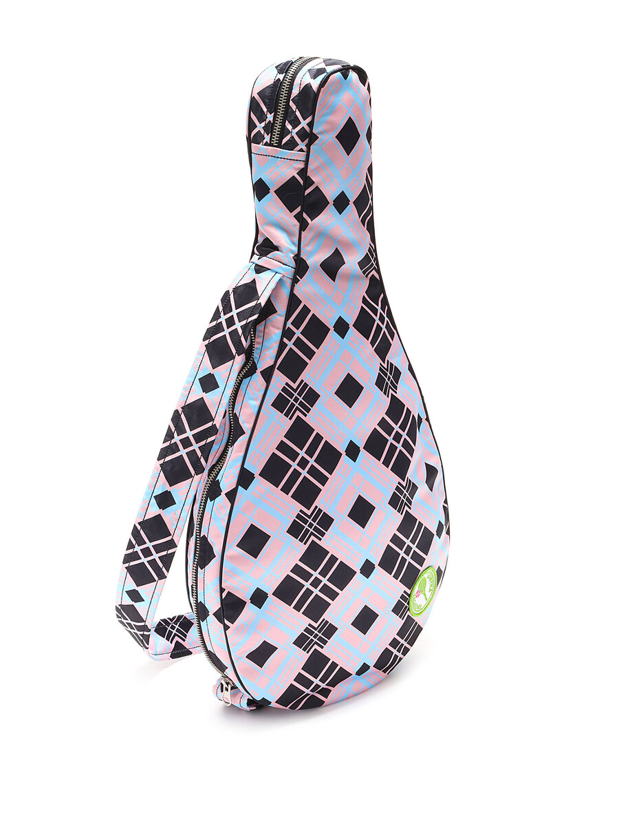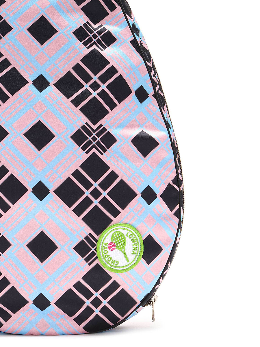 Sac de raquette de tennis à imprimé géométrique rose, bleu et noir. Fermeture à glissière. Bracelet ajustable. Taille compacte idéale pour les jeunes athlètes.