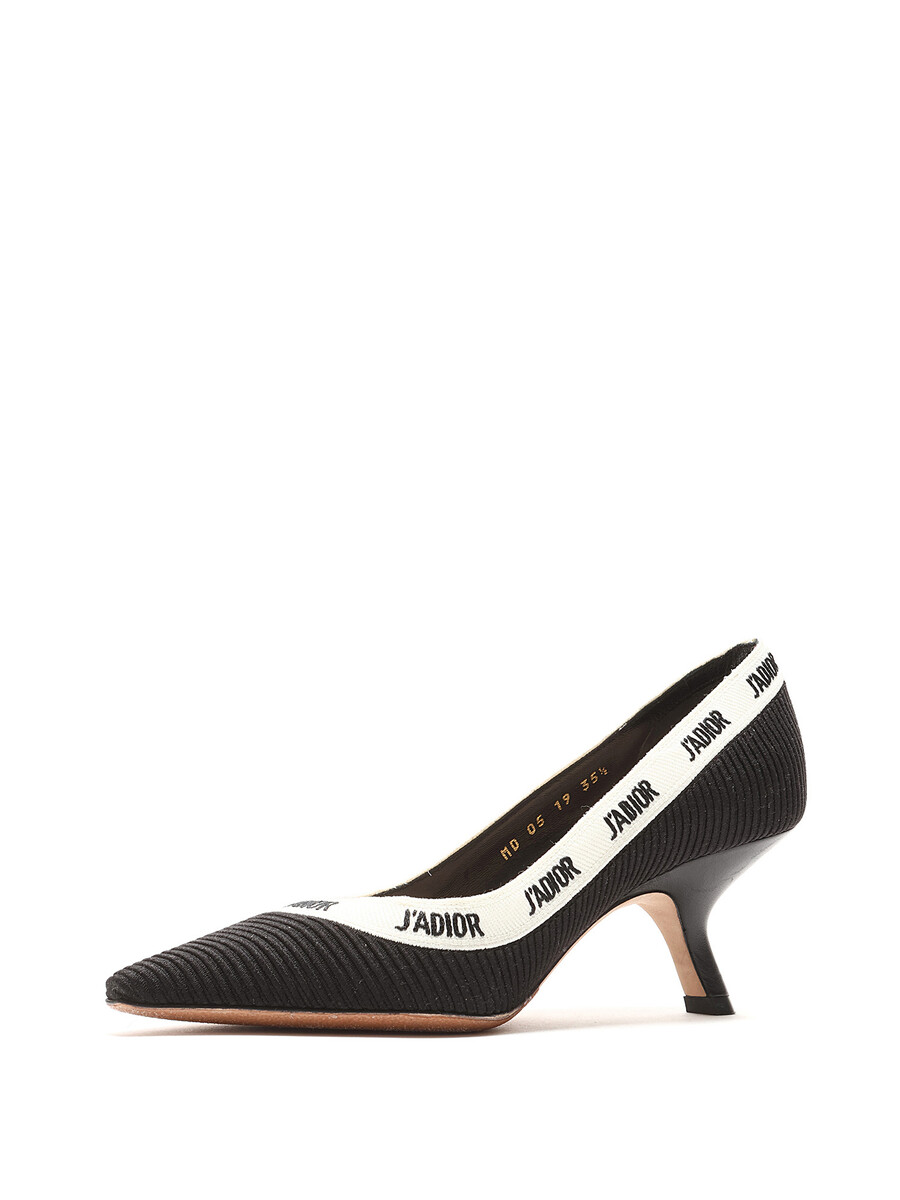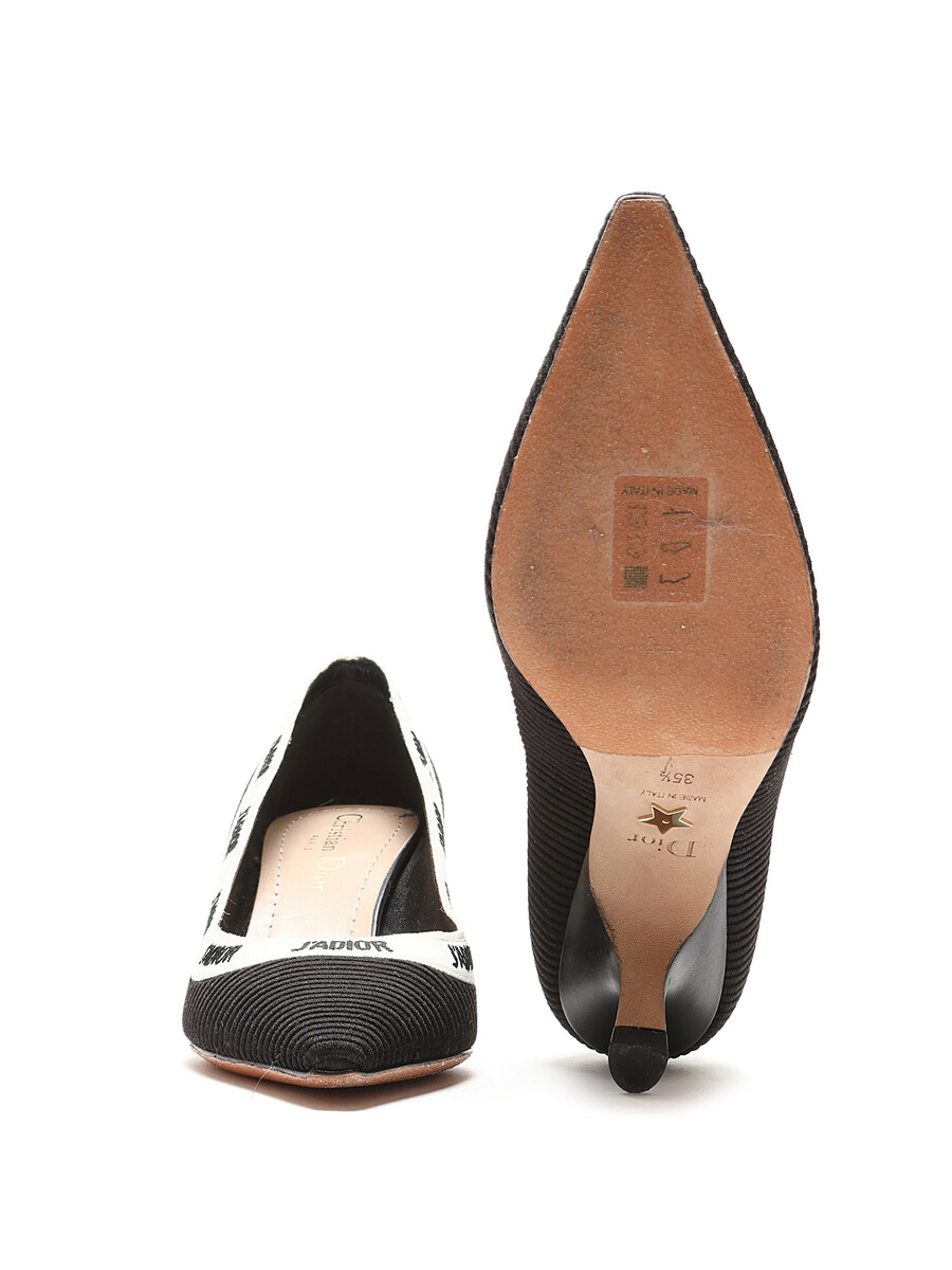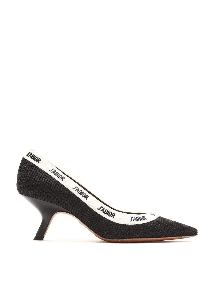 Escarpins à bout pointu ornés du motif J'ADIOR en noir et blanc. Bride élastique à l'arrière. Semelle en cuir.