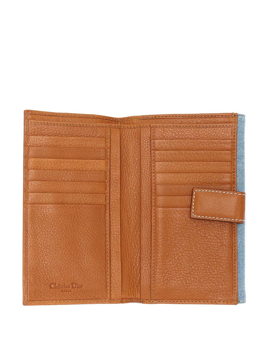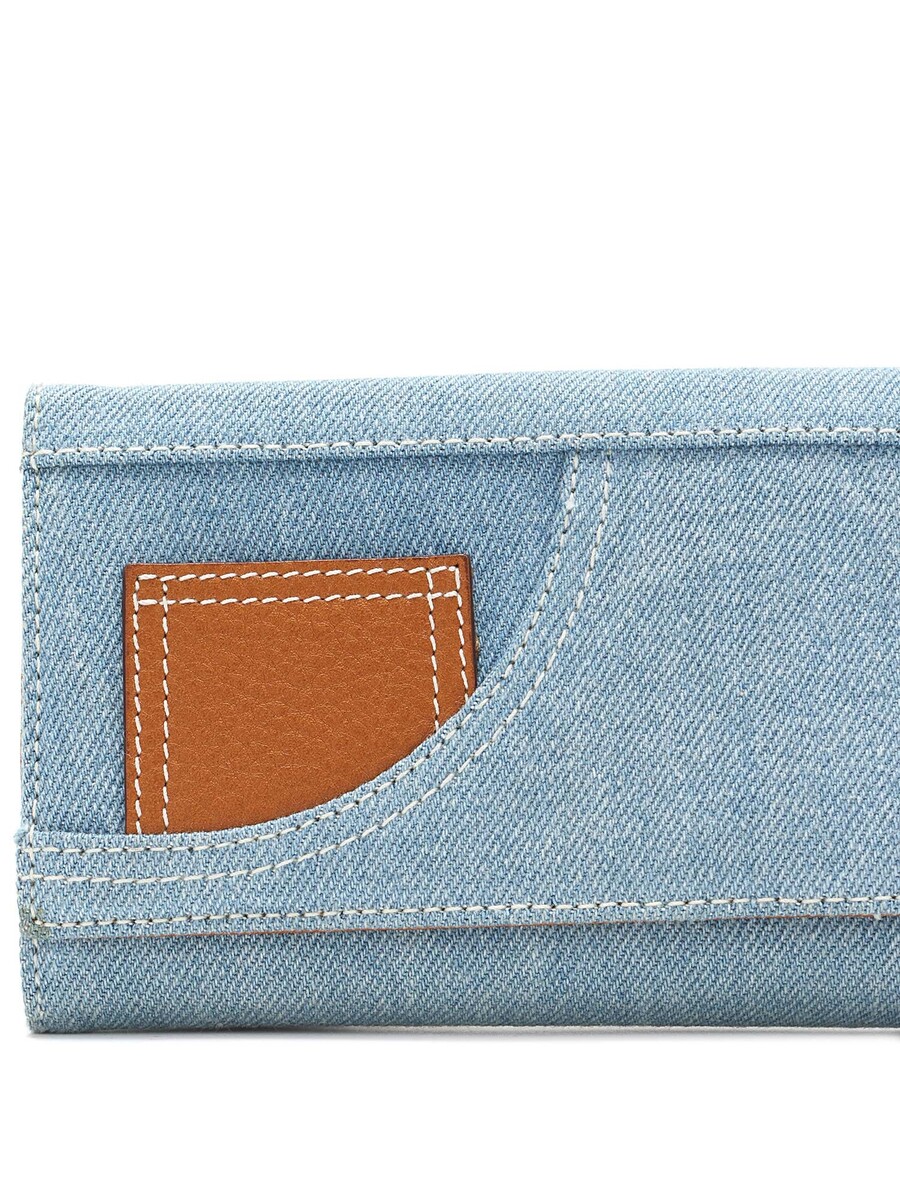 Portefeuille en toile denim bleu et cuir beige avec fermeture à pression argentée. Coutures contrastées. Plusieurs emplacements pour cartes.