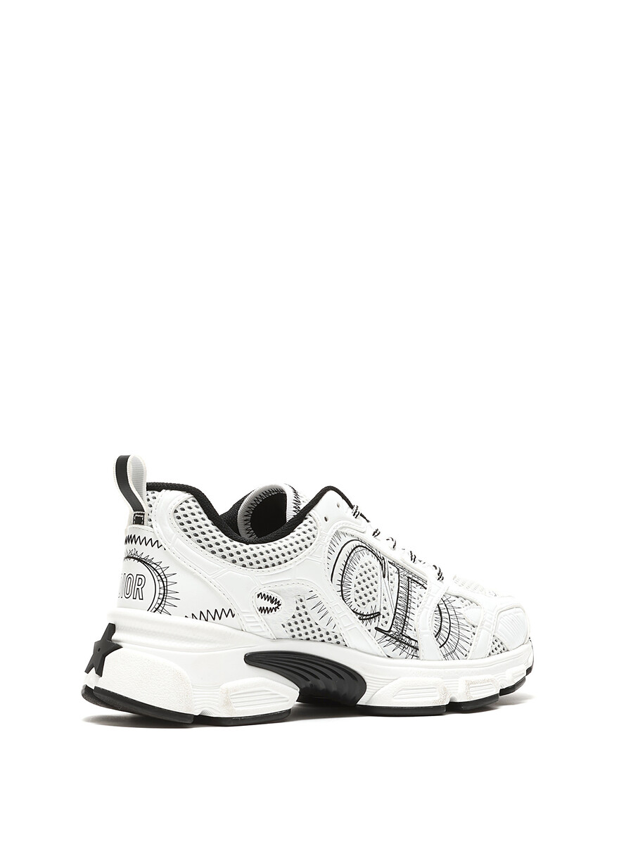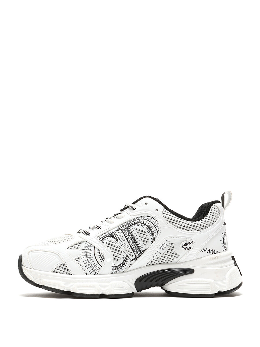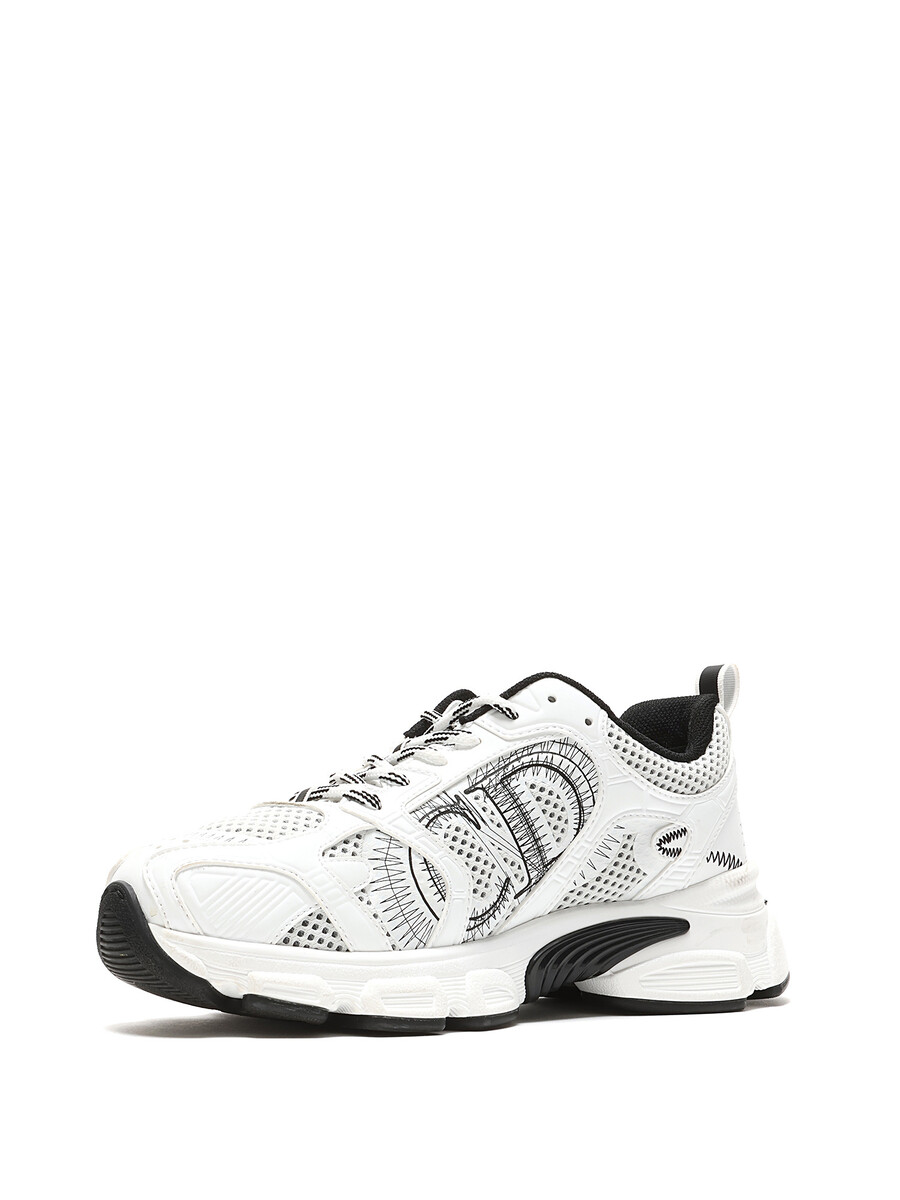 Baskets en maille et cuir blanches et noires. Fermeture à lacets avec bout arrondi. Semelle en caoutchouc.