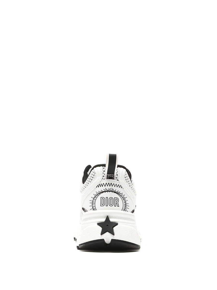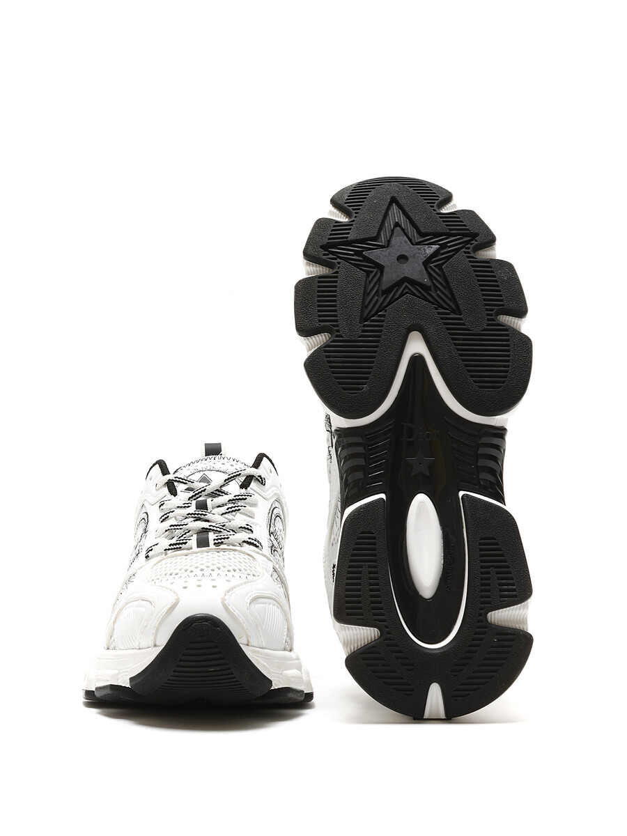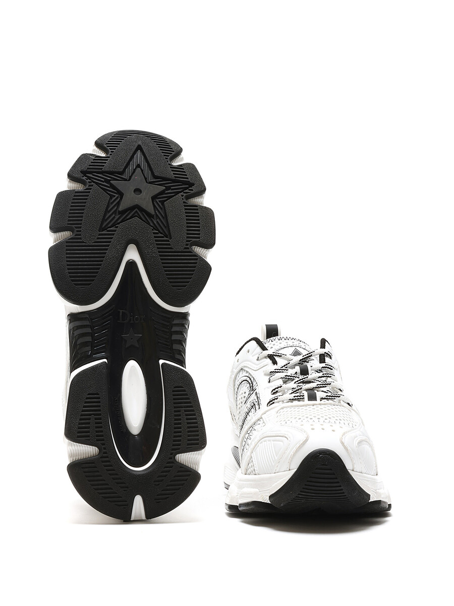 Baskets en maille et cuir blanches et noires. Fermeture à lacets avec bout arrondi. Semelle en caoutchouc.