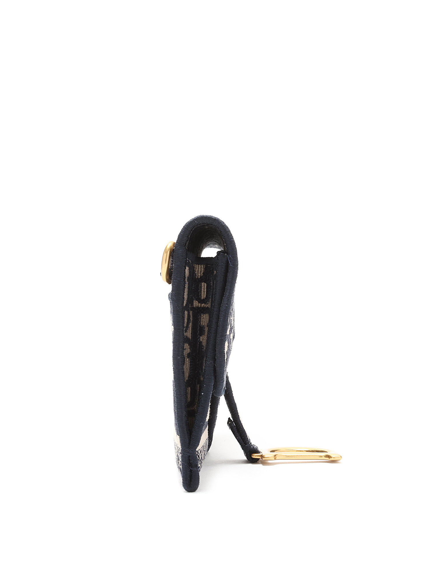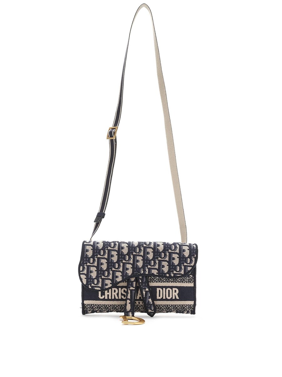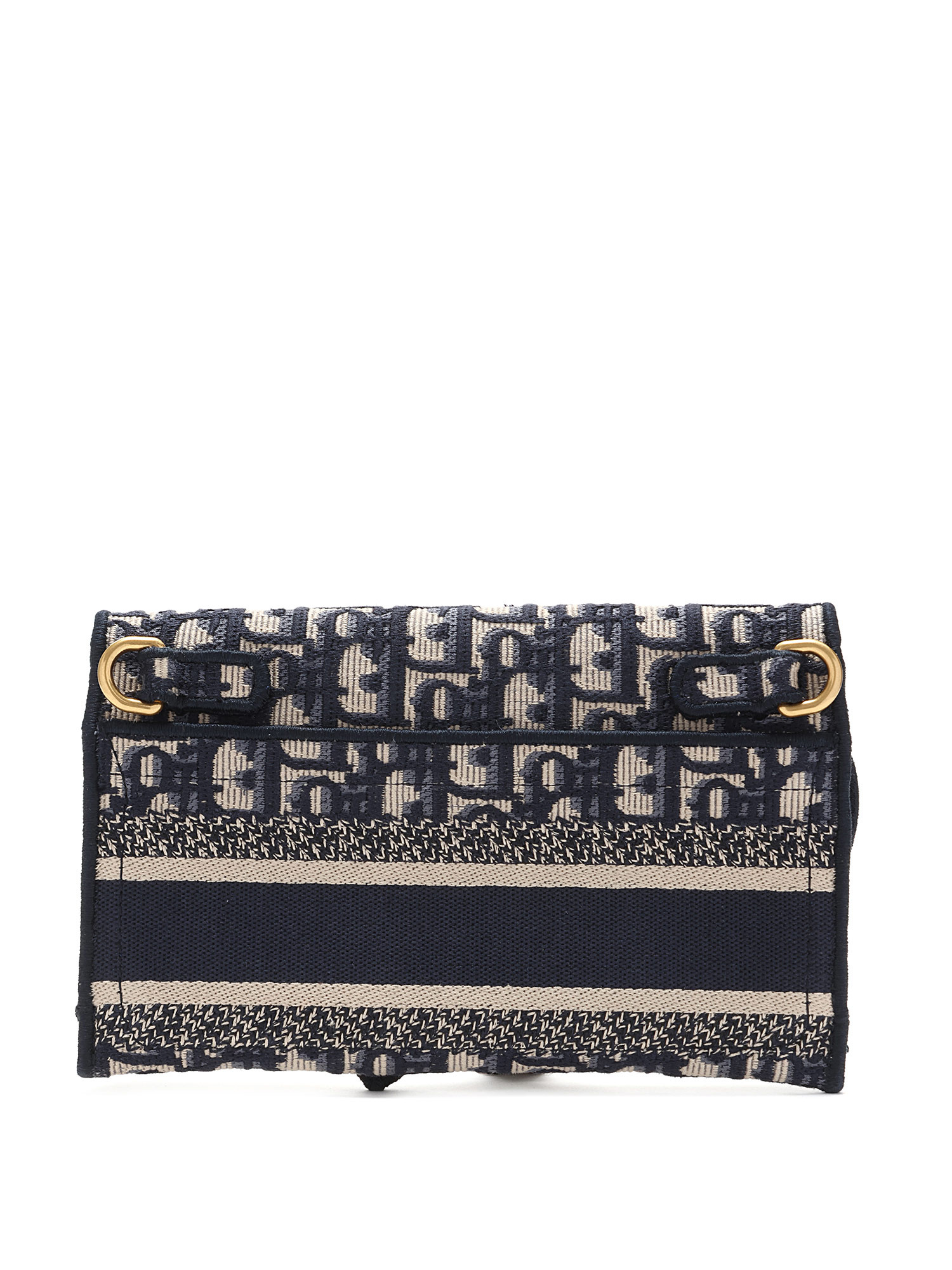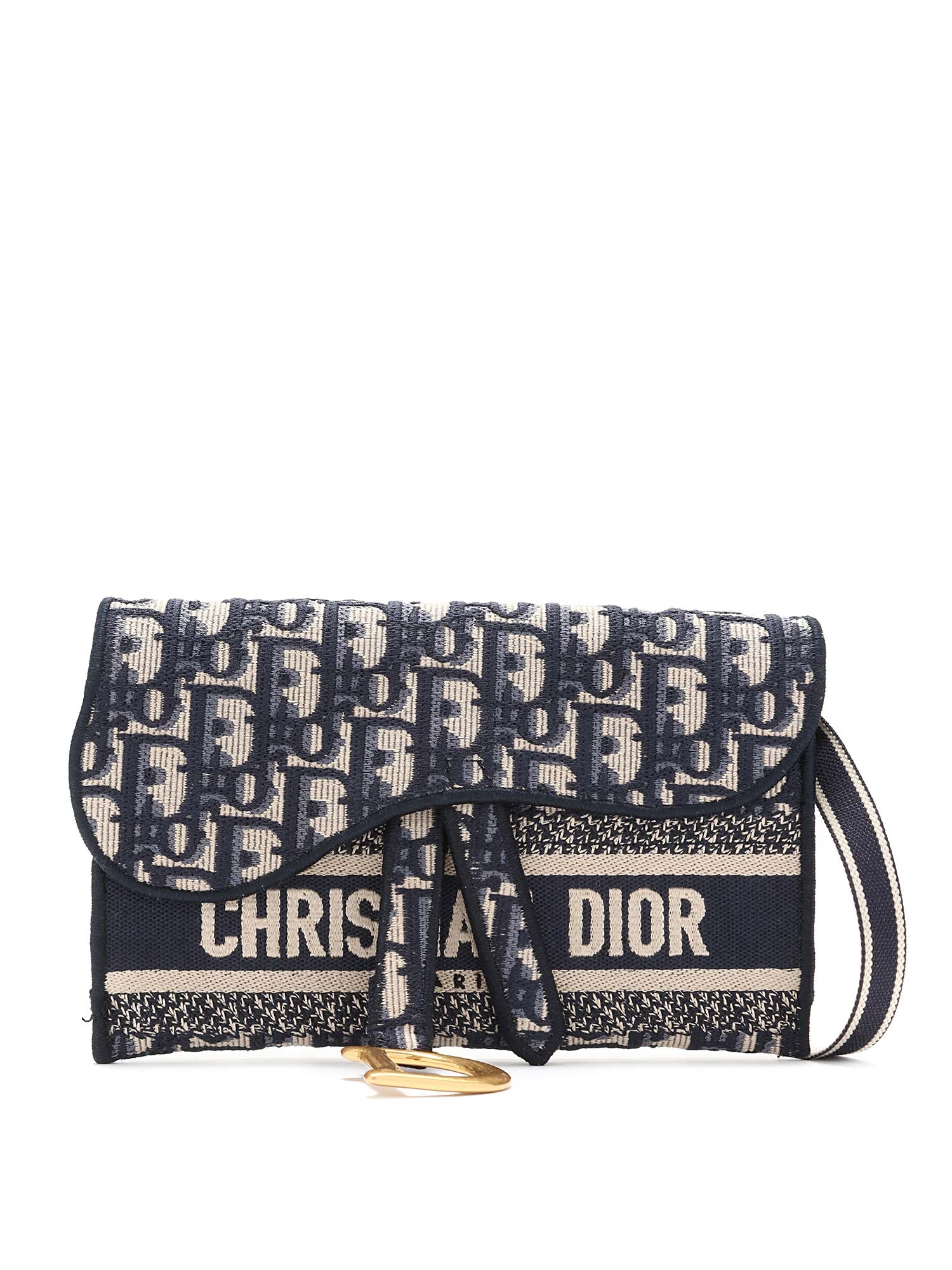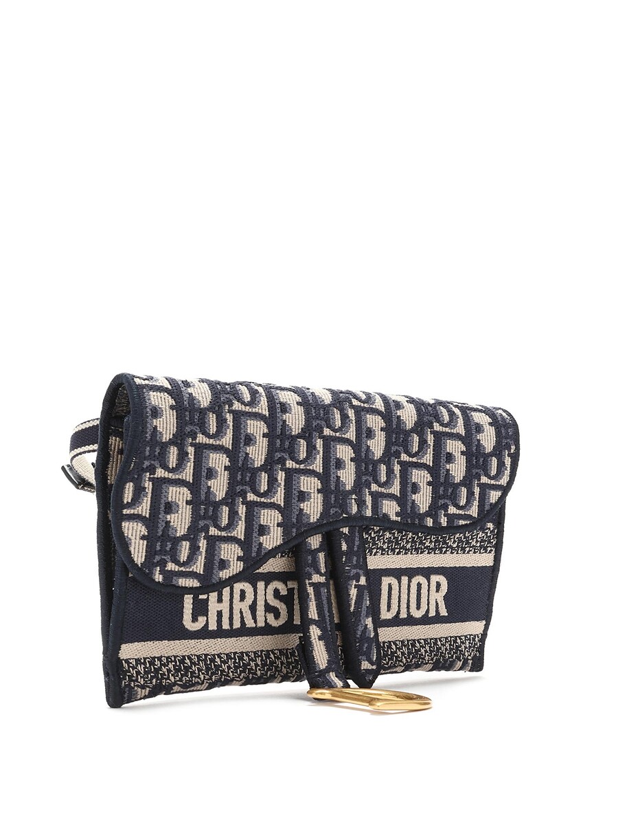 Sac-ceinture à motif oblique en bleu marine et crème. Fermeture à rabat magnétique. Sangle en toile ajustable. Ferrures dorées.